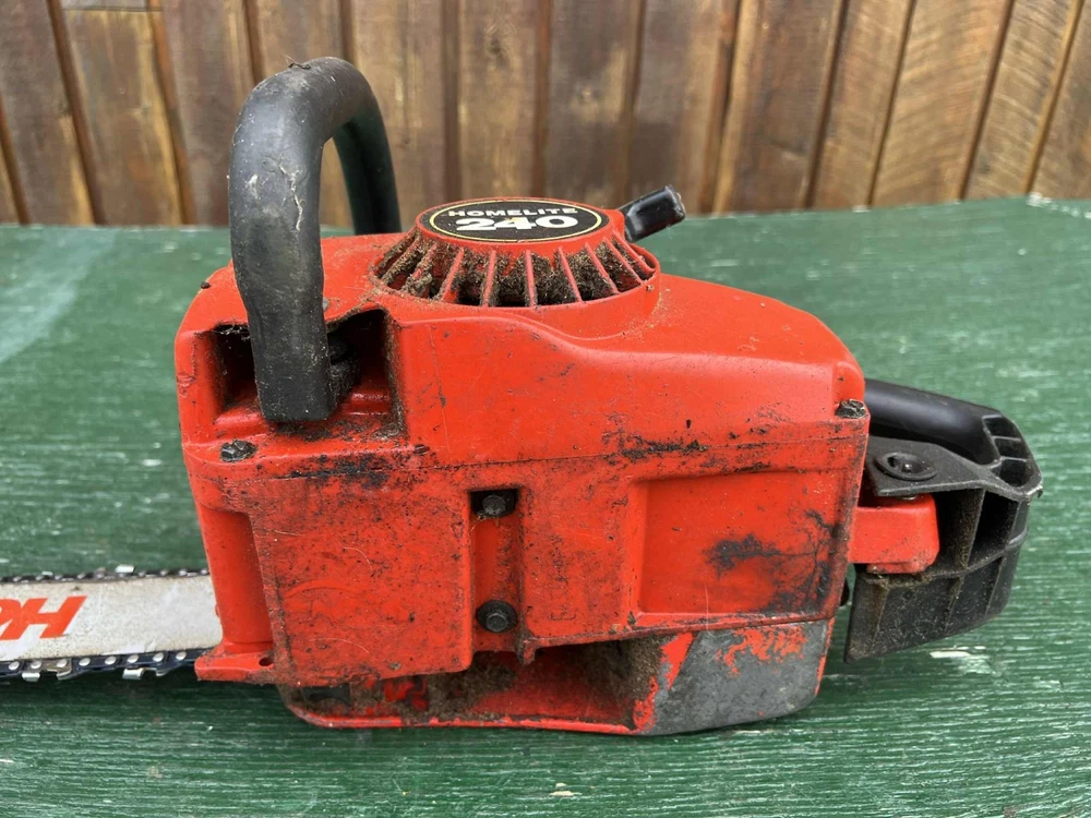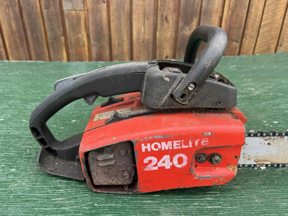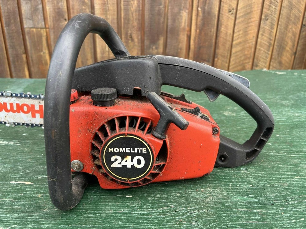 Just found at a local estate sale...a very interesting old chainsaw. This is a HOMELITE 240 chain saw with 16" bar. I pulled on the cord and it has compression. I don't know much about chainsaw...so please have a look at the photos.