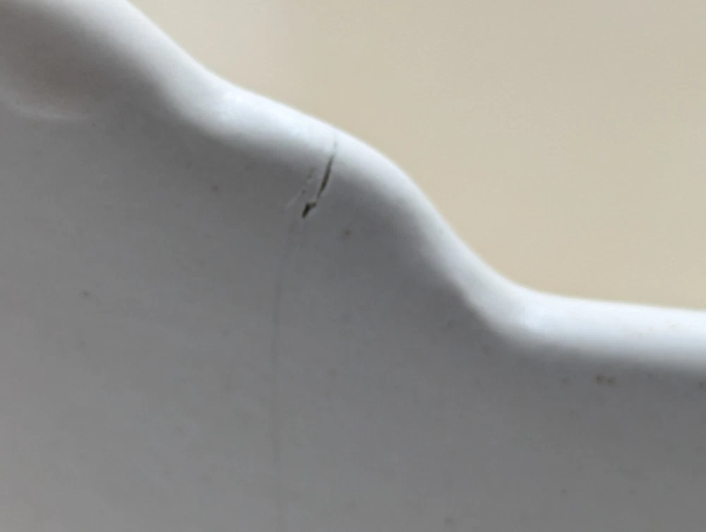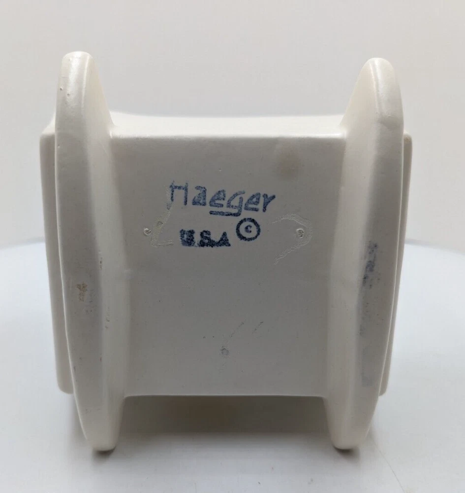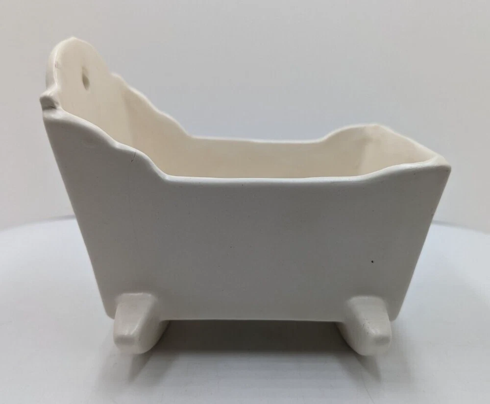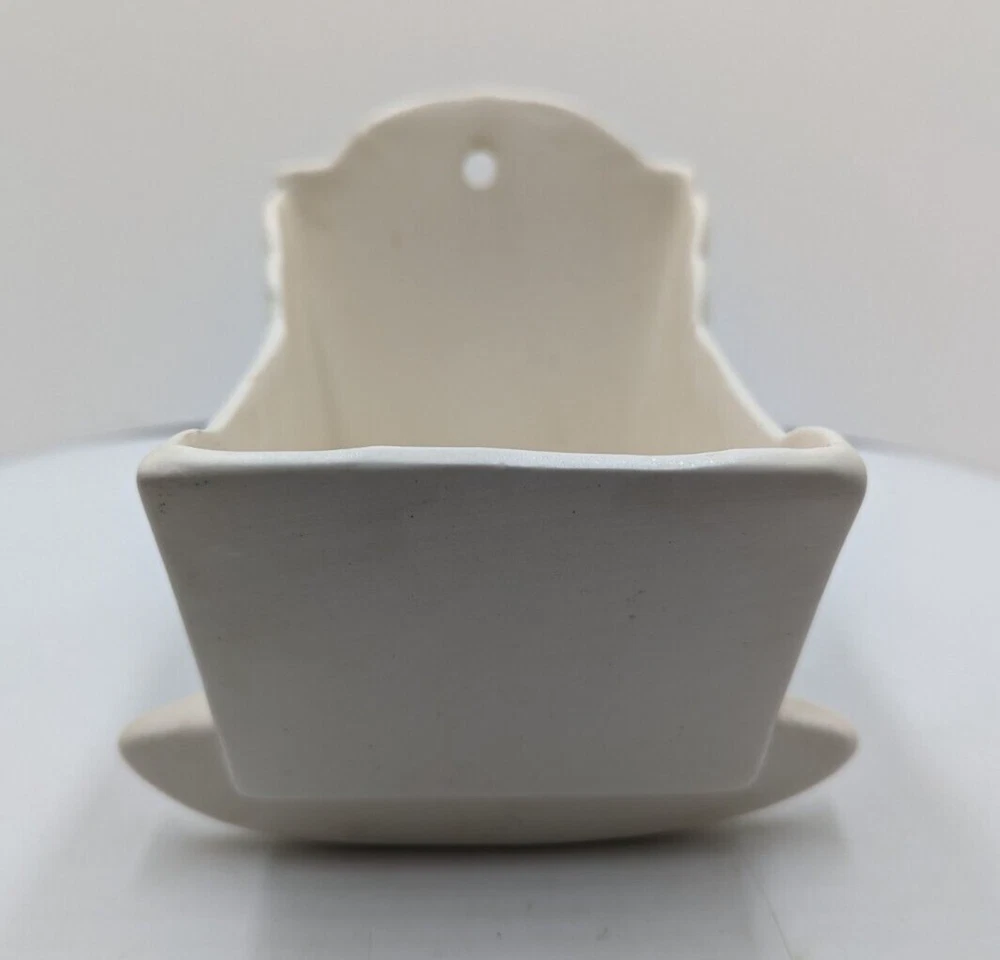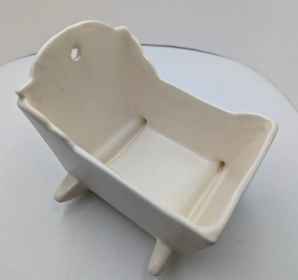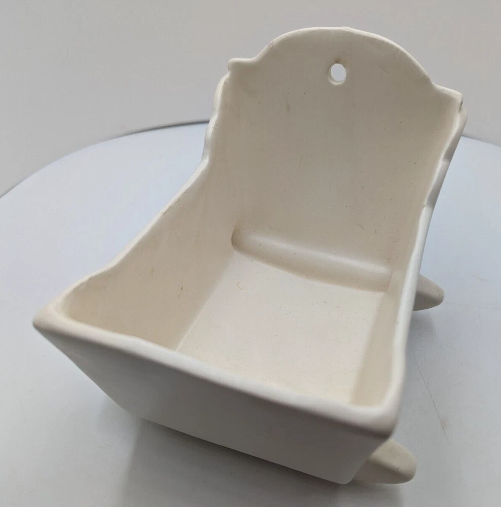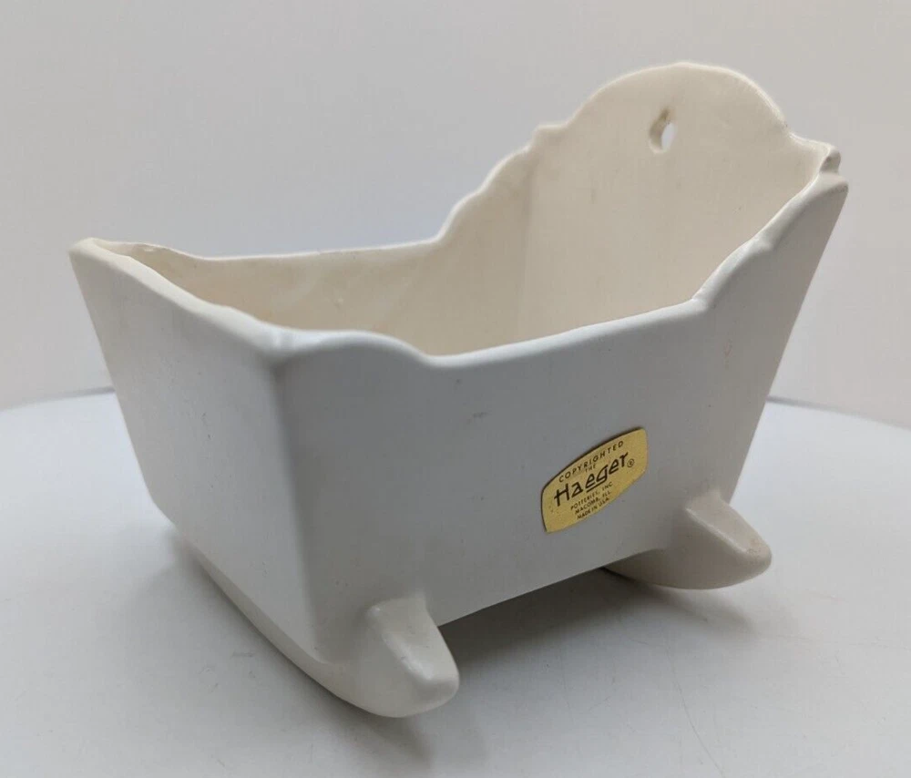 Vintage Haeger White Rocking Cradle Bassinet Planter w/ Original Sticker 5.25" L. One short hairline crack on the outside of the cradle - see the last photo. I can't definitively date this piece but it is vintage. The piece is about 5.25 inches long, 4.25 inches high and about 4 inches wide. All of my items are carefully packed for shipping, no matter their value - $5 items are wrapped with the same care as a $200 item. My goal is to have your purchase arrive safely. I use recycled packaging when possible but mostly use new, high quality products so your item will arrive intact without damage. Large, heavy and fragile items are harder to use combined shipping with but just ask if you would like to purchase more than one item and I am more than happy to do so if feasible. If not, maybe we can work out a shipping discount. Thank you and hopefully you will visit my store again!