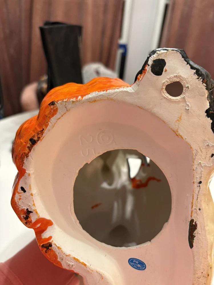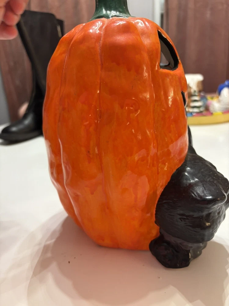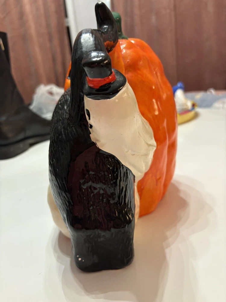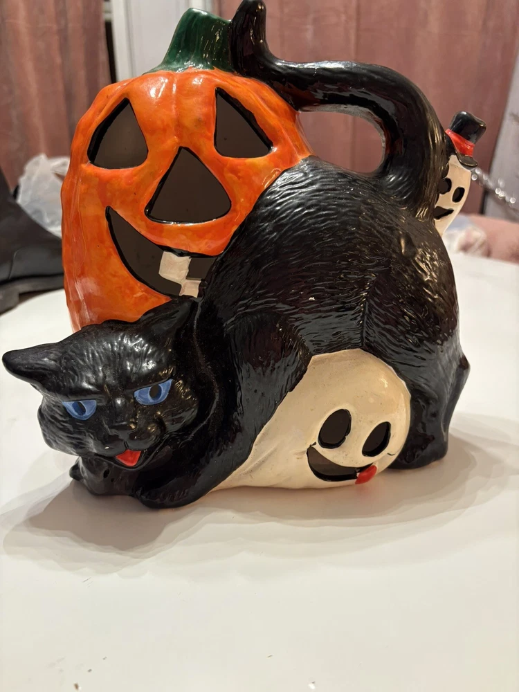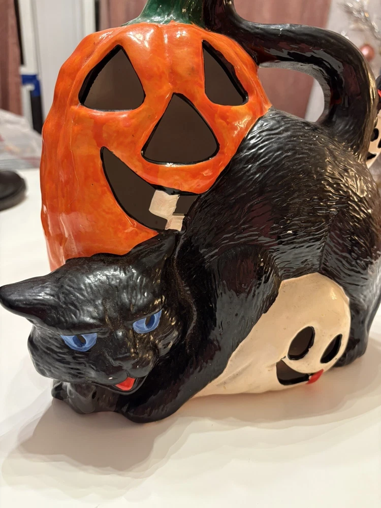 This vintage Halloween decoration is sure to add a spooky touch to your home. Featuring a black cat with a mischievous expression, this ceramic piece is made in Taiwan and has a unique pumpkin pattern. The ghost subject adds to the creepy atmosphere, making it perfect for Halloween occasions. The CAT brand adds value to this collectible item, and it's a great addition to any holiday or seasonal wall décor. Don't miss out on the chance to own this one-of-a-kind piece.