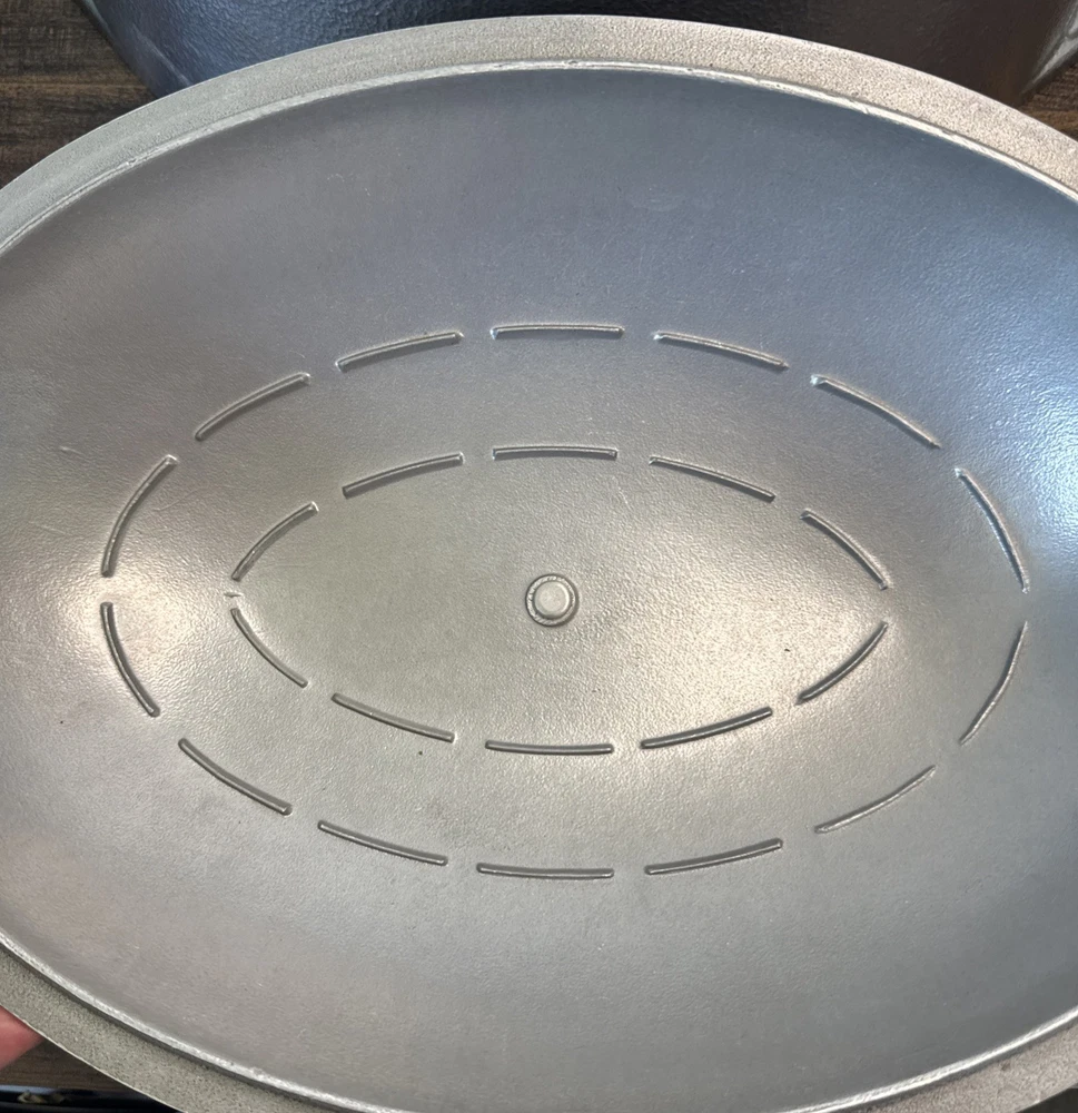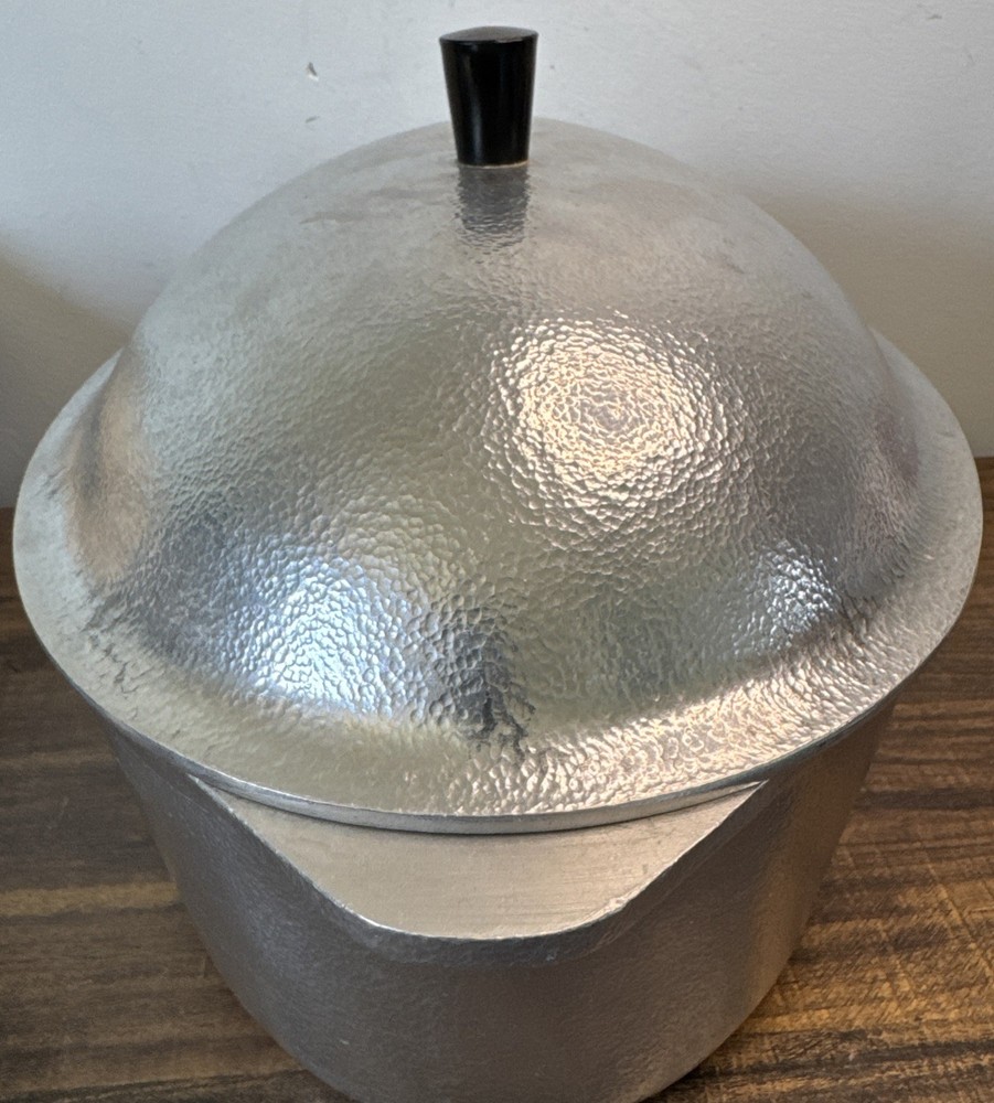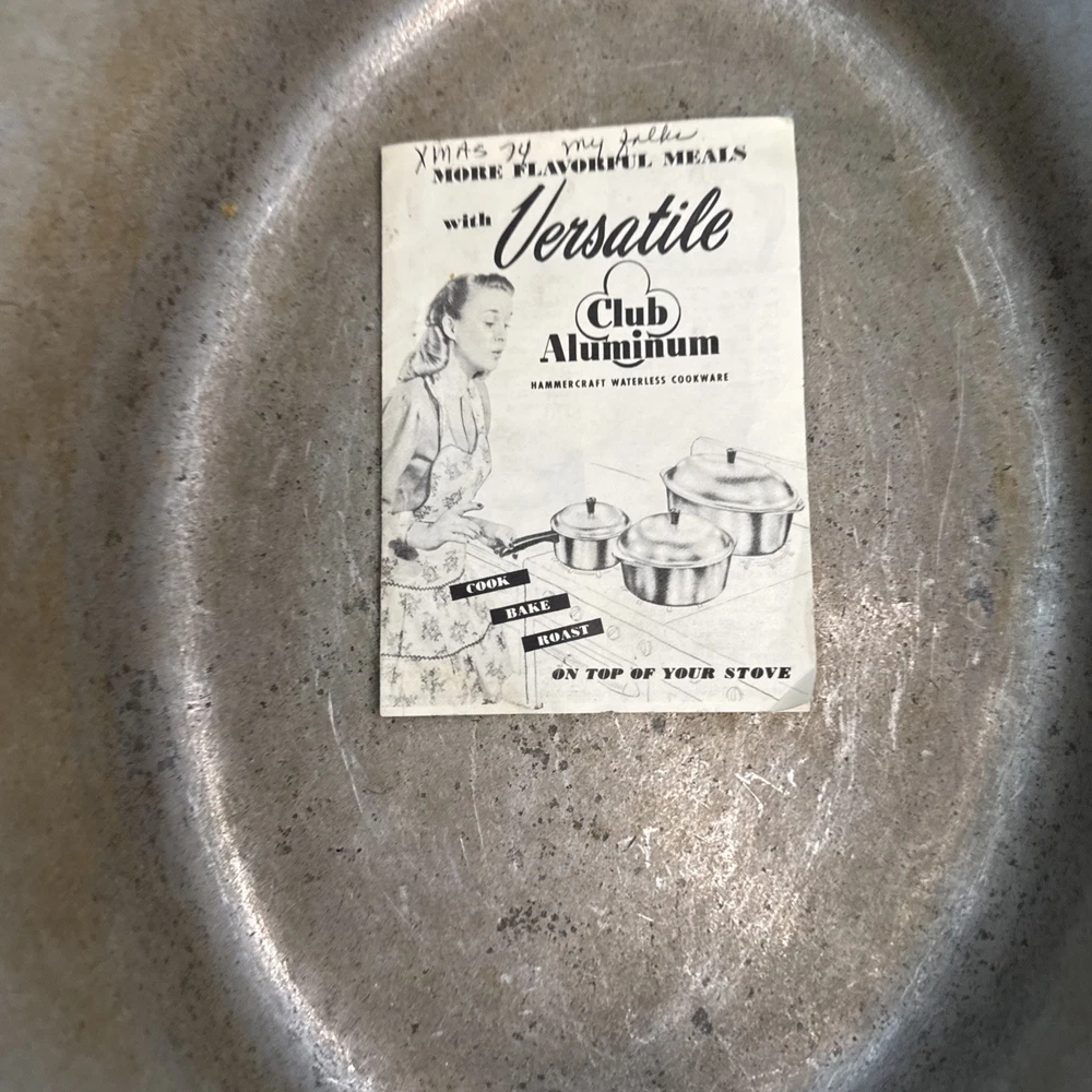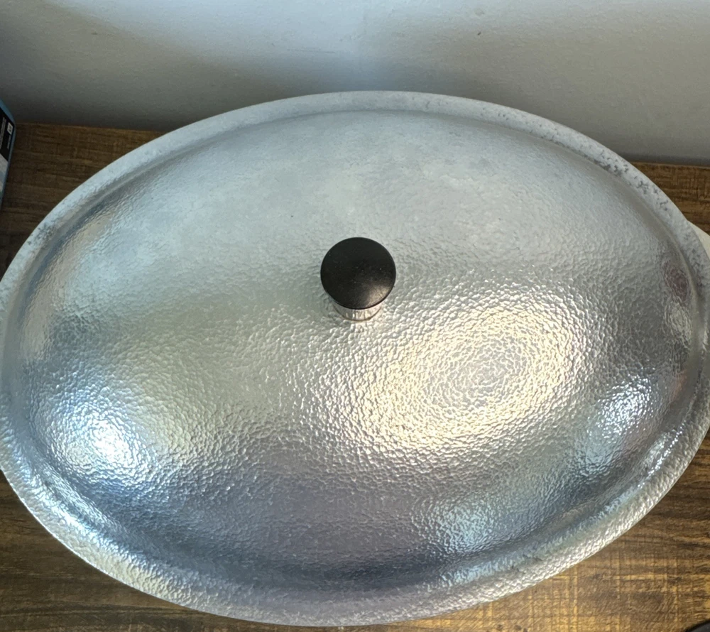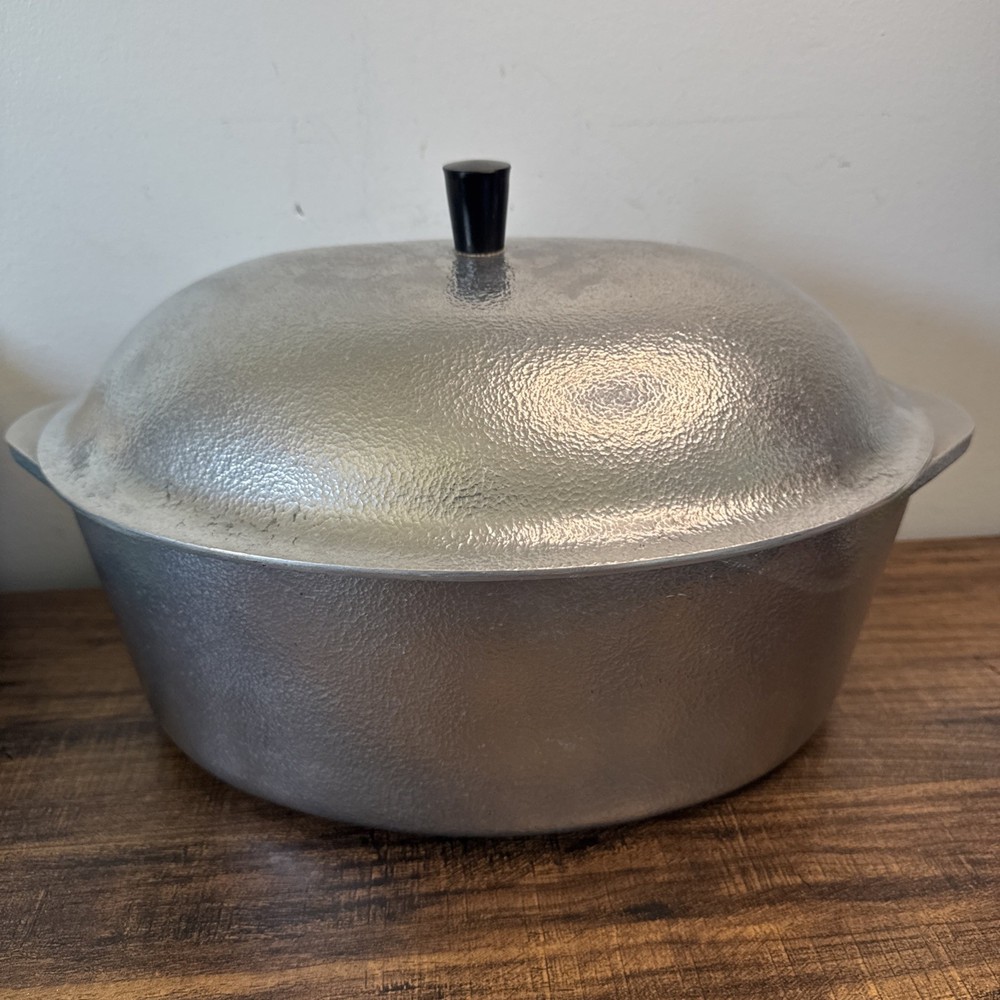 The Vintage Hammercraft Club Hammered Aluminum 15" Oval Roaster Dutch Oven with Lid is a collectible kitchen piece from the 1950s, made in the United States. This two-piece set includes an oval roaster and a matching lid, crafted from cast aluminum with a silver surface coating. The 15" roaster features handles for easy transport and can be used on both electric and gas stoves. Its vintage charm and original design make it a unique addition to any kitchen collection, perfect for cooking on a retro stove. Scratches or marks it is pre-loved. Good shape!