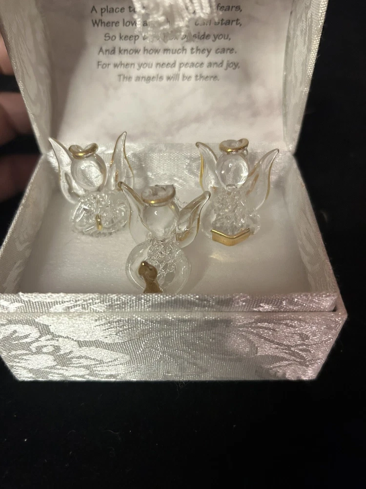 This vintage You're Worried Box 3 is a unique collectible item that features a hand-blown glass angel figurine with a poem inside. The box is packaged in a beautiful box, making it an ideal gift for collectors or boxing enthusiasts. The figurine is made of high-quality glass, and the box is designed to showcase it perfectly. The item is categorized under Collectibles, Decorative Collectibles, and Sculptures & Figurines, making it a must-have for collectors of all kinds. The box is designed with the word "boxing" in mind, and it's perfect for display in any room. This is a rare item that will surely be a conversation starter.