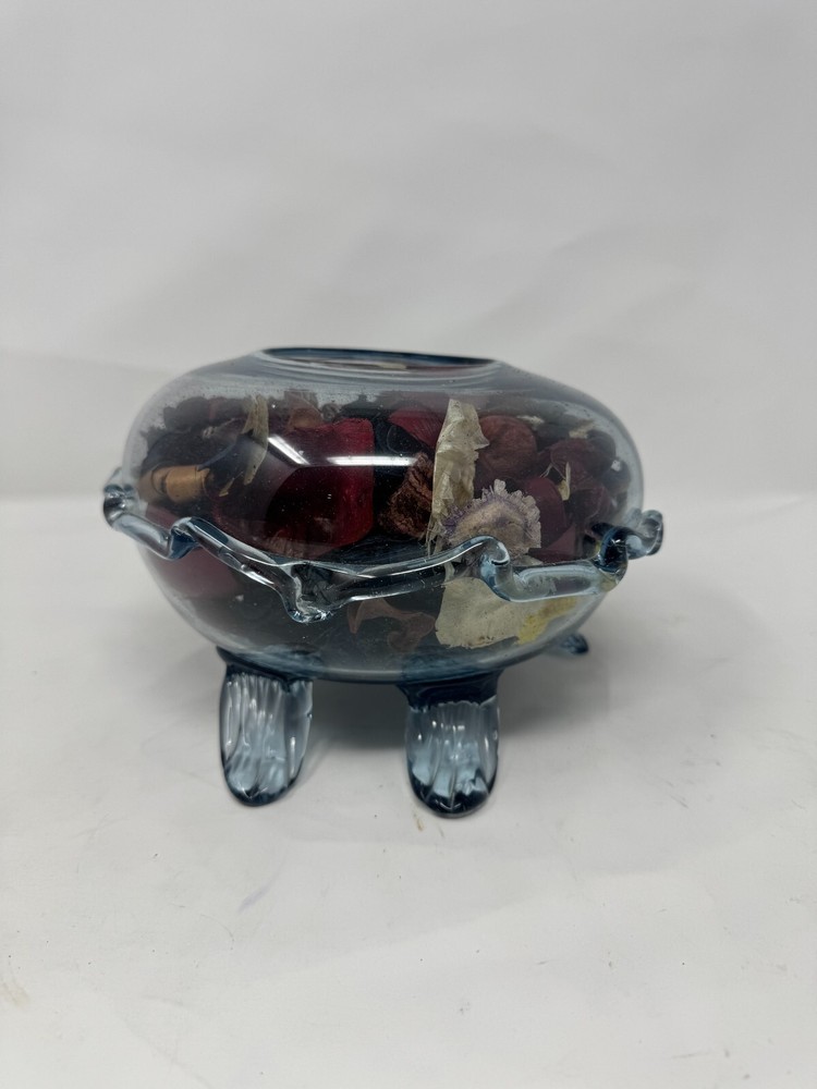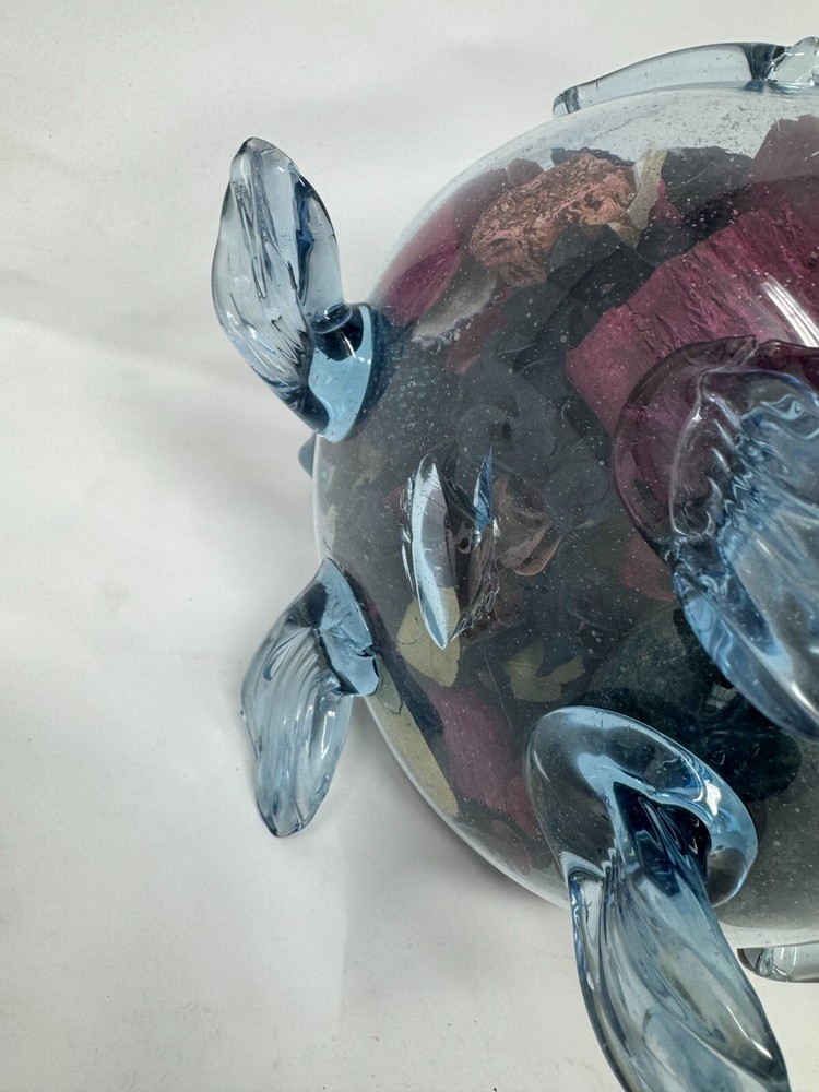 This is a vintage hand-blown glass turtle-shaped bowl , originally designed to hold potpourri or decorative items. The glass is a beautiful transparent blue , giving it an oceanic, coastal feel. The turtle's legs, tail, and head are detailed, making this a unique collectible decor piece for sea life enthusiasts. π Key Details: β Handmade, hand-blown glass β Measures 7 β L x 6β W x 4β H β Holds potpourri, trinkets, or decorative stones β Condition : Has a small chip on the belly (see images), but otherwise in good shape β Ideal for coastal, nautical, or cottagecore-themed homes π Great for collectors, beach house decor, or as a unique gift! Additional Note: (stuffed with aroma pieces) chip on belly