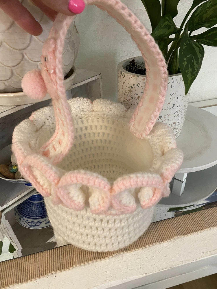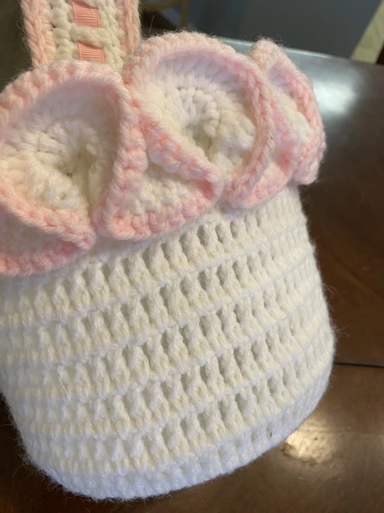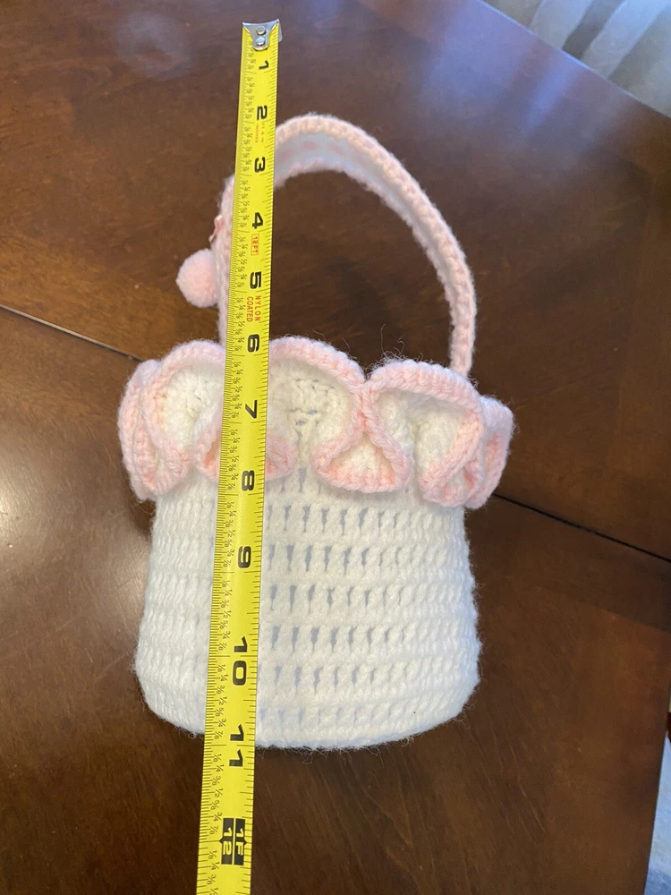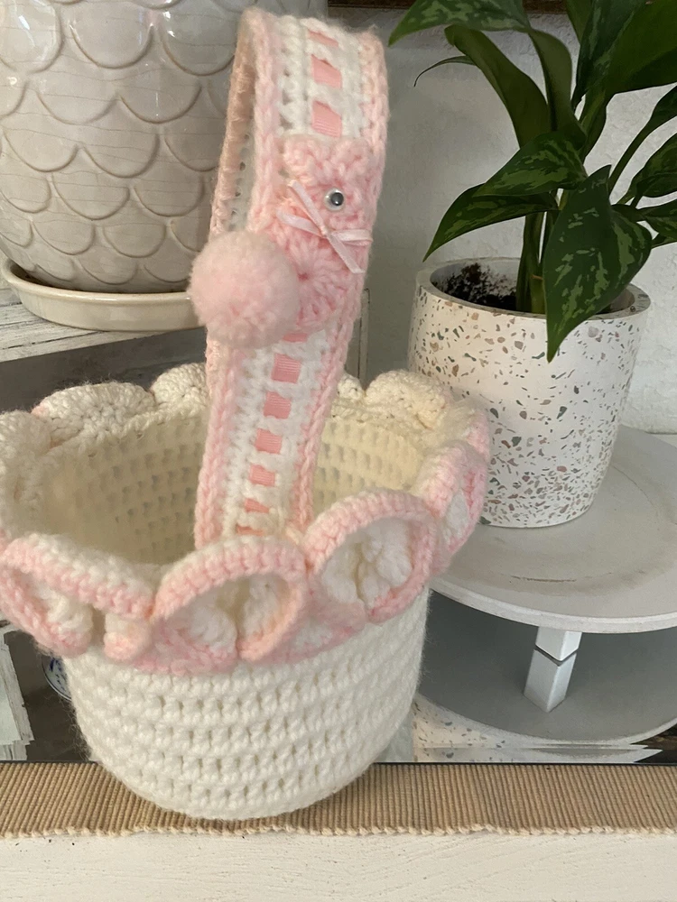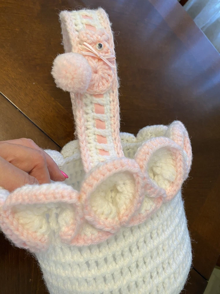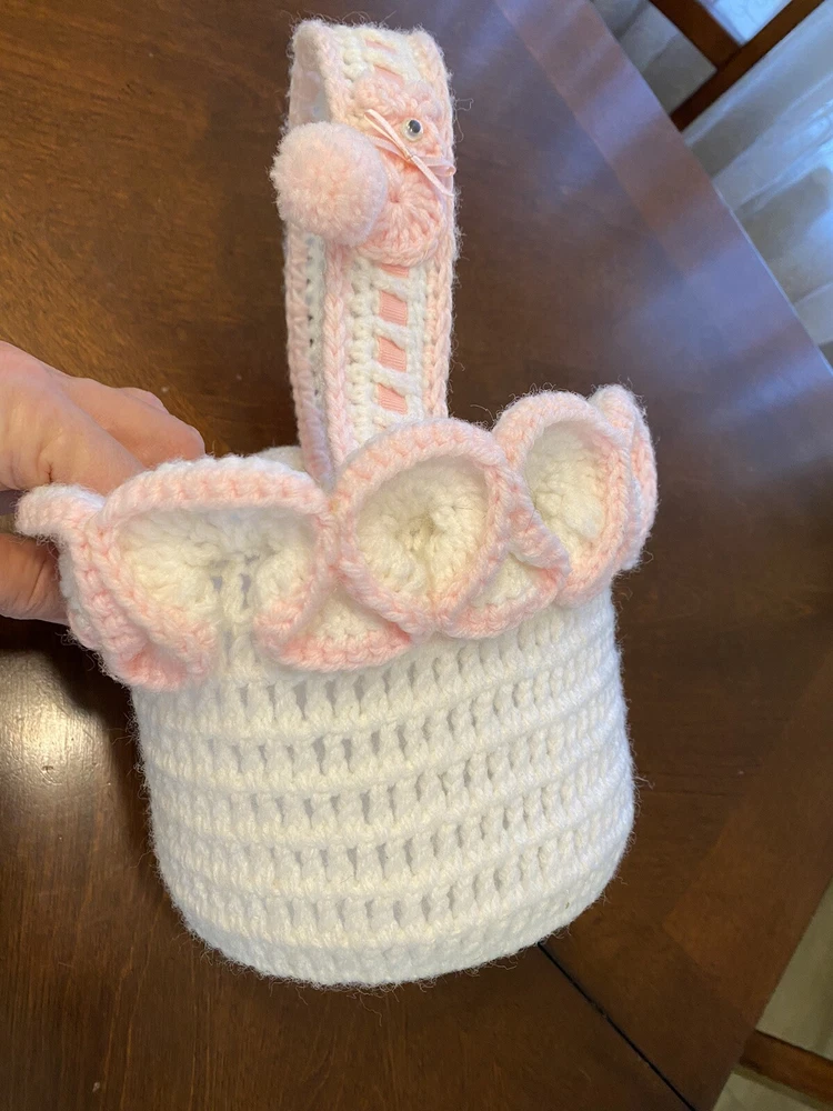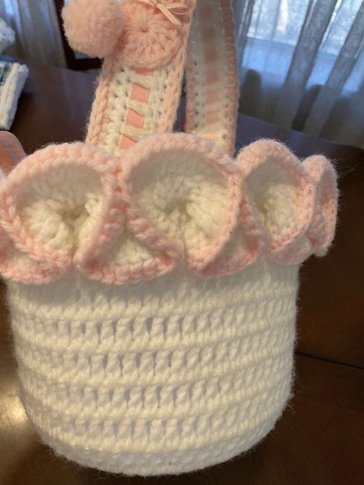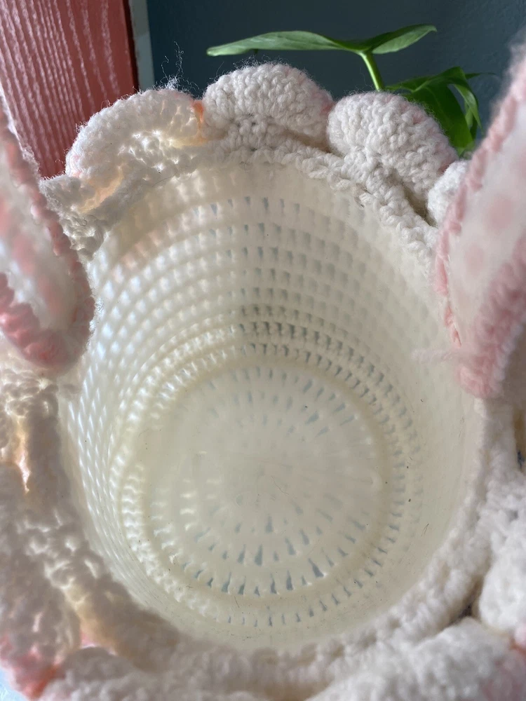 This Vintage Hand CROCHETED Stitched Easter Basket Granny Chic Cottage Pink White is a perfect addition to any room Very granny core Original vintage sweetie Please see all photos Smoke Free Home Happy to combine for shipping savings