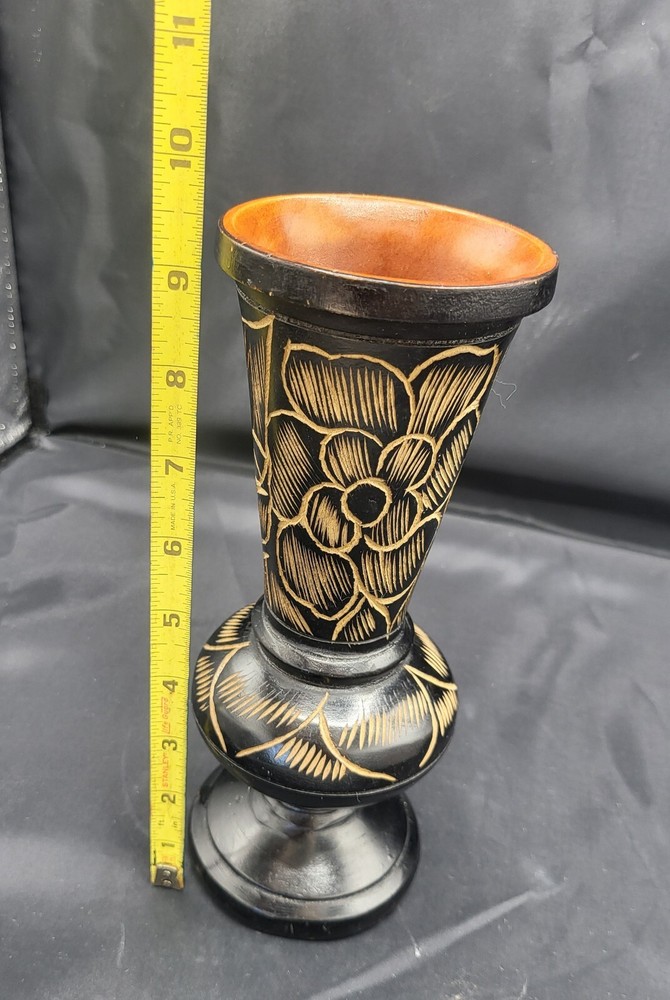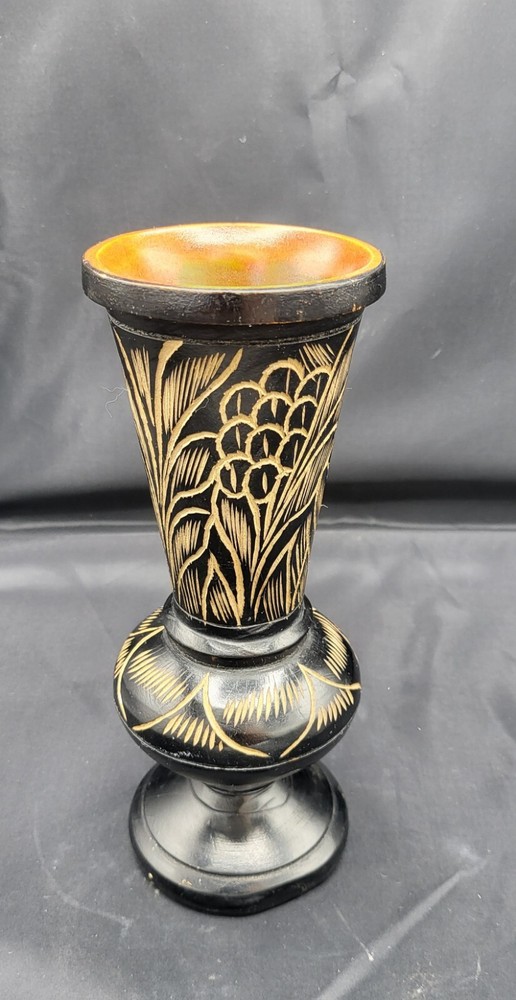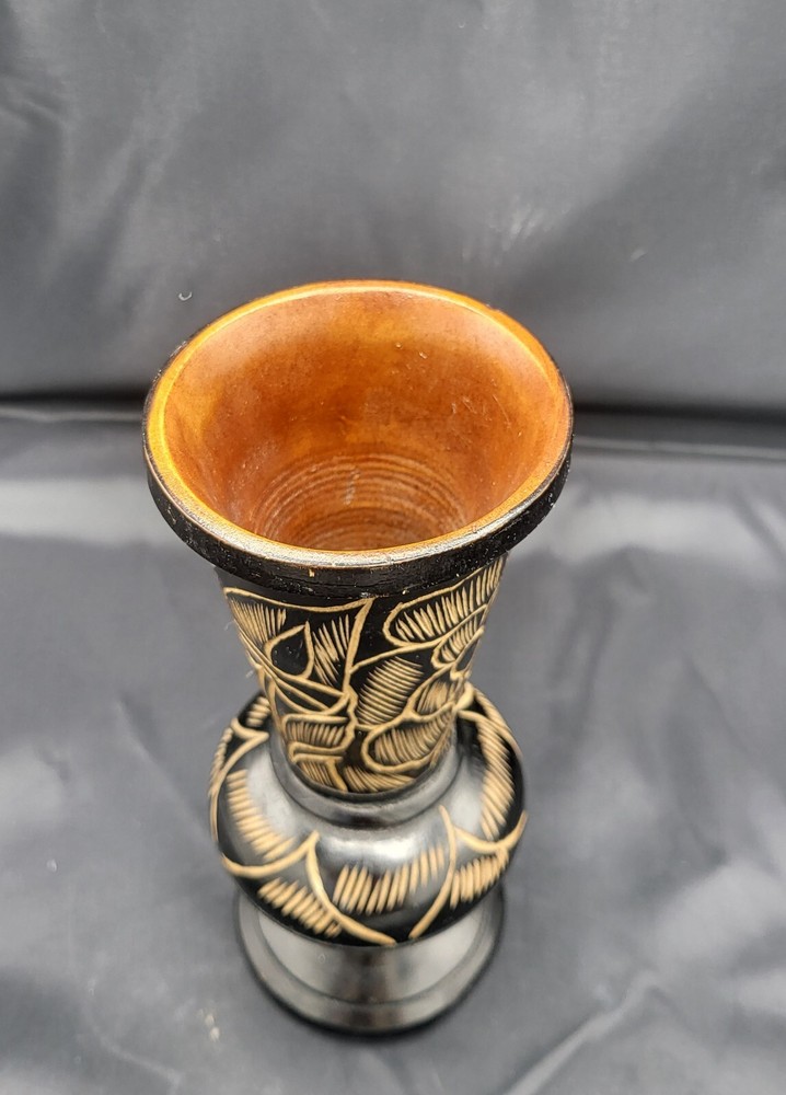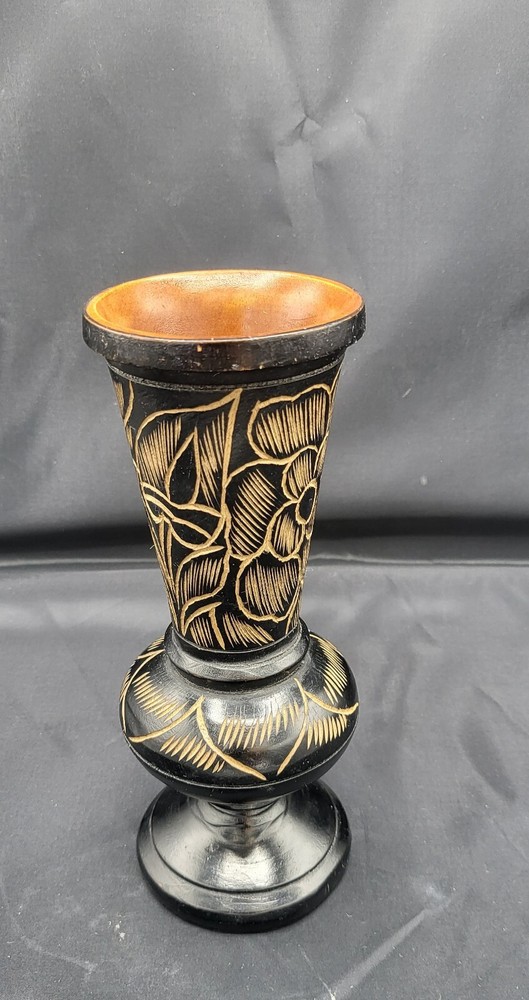 Vintage Hand Carved Floral Turned Wood Pedestal Vase Vessel Approximately 9.5" H x 4 " W Condition is good - used See pictures for more details