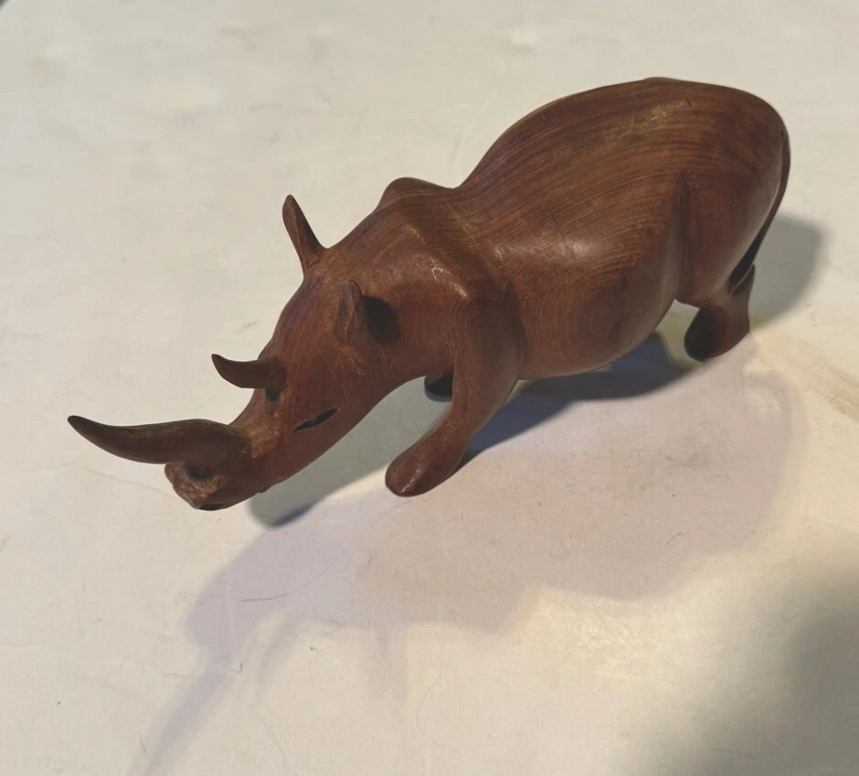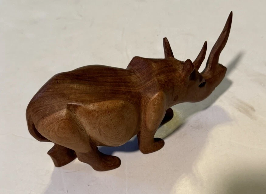 Add a touch of the wild to your home decor with this vintage hand carved teak wood rhinoceros sculpture figurine. Measuring 8 inches in length and 4 inches tall, this beautiful piece features intricate carvings and a stunning wood grain pattern. The medium-sized figurine is perfect for any room in your home and looks great on a shelf or table. The African-style sculpture is handmade from wood and depicts an abstract art subject of a rhinoceros. It is an original piece from the late 20th century, specifically from the years 1990-1999. The figurine is unboxed and comes from a collection of animal sculptures and figurines. Don't miss out on the chance to own this unique and beautiful piece of decor!