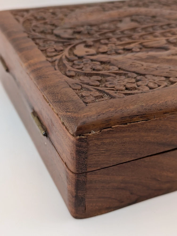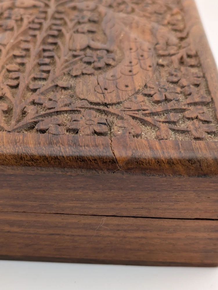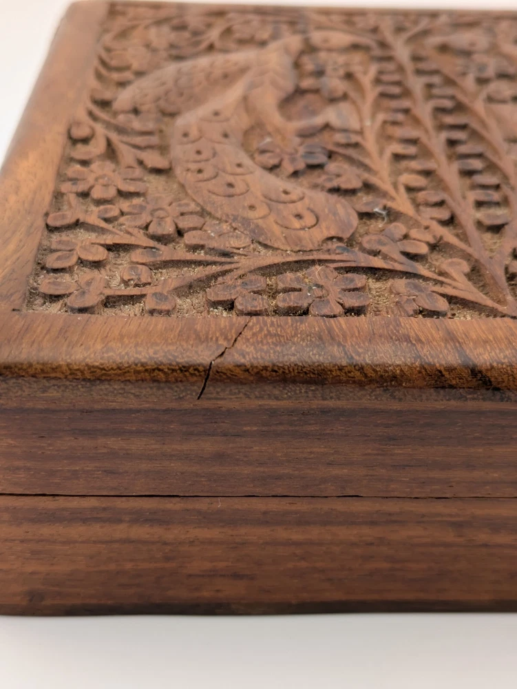 Vintage Hand Carved Wood Wooden Box Made In India Trinket Jewelry Floral Peacock