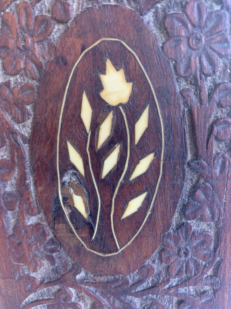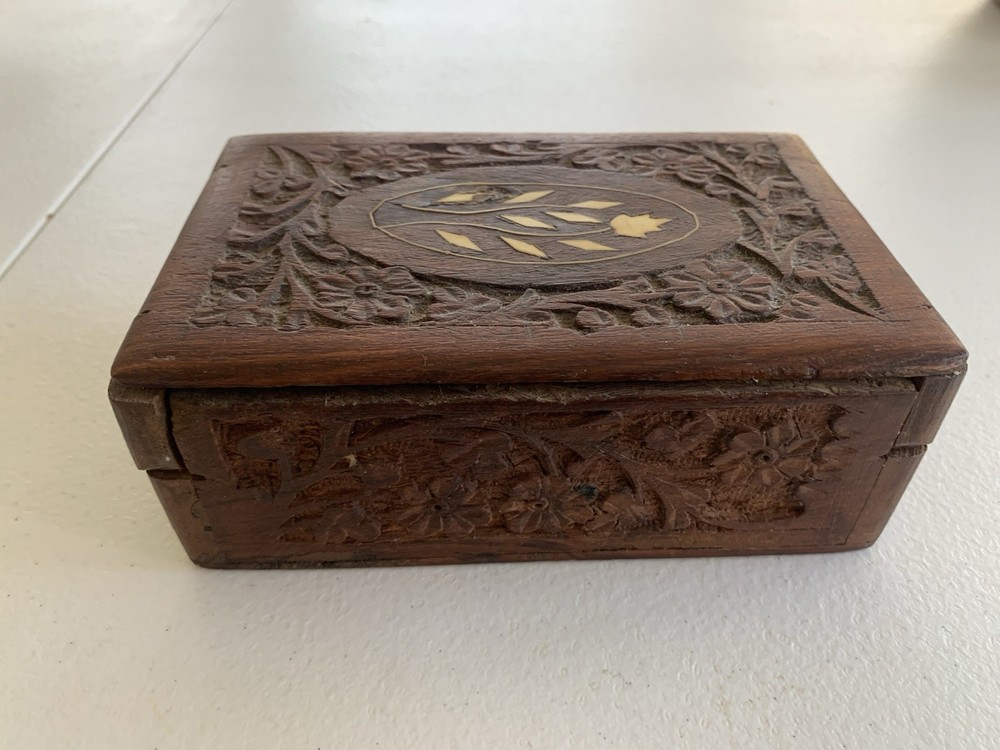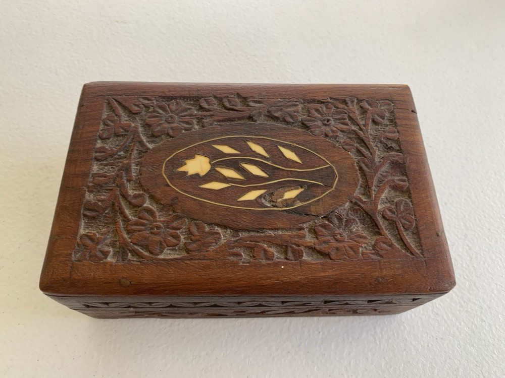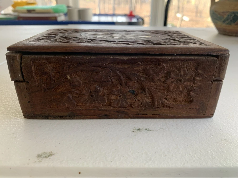 Vintage Hand Carved Wooden Floral Inlay Trinket Box 6x4 India