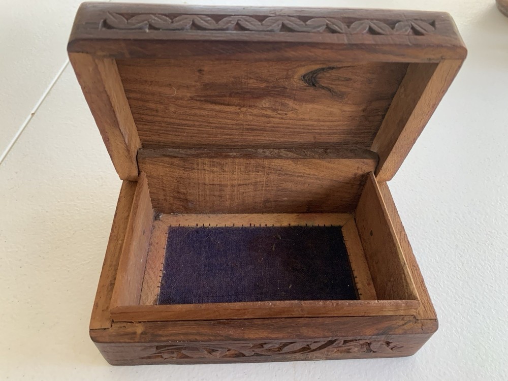 Customized: No Type: Trinket Box Department: Girls, Teens, Adults Seller Notes: “Pre Owned, Nice, Clean. All Measurements are below in item description. Smoke Free Home.” Color: Brown Country/Region of Manufacture: India Style: Hand Carved Boho Material: Wood Theme: Floral Size: Small Time Period Manufactured: 1960-1969 Pattern: Floral Closure Type: Hinged Original/Reproduction: Original Shape: Rectangle Features: Carvings, Hinged, With Lid, partial Lining Engraved: No Collection: Keepsake Boxes Occasion: All Occasions Room: Any Room Care Instructions: Clean with Damp Cloth Handmade: Yes Brand: Unbranded Finish: Wood-Finished