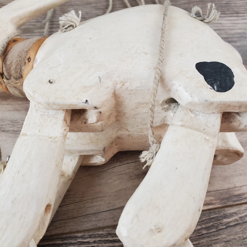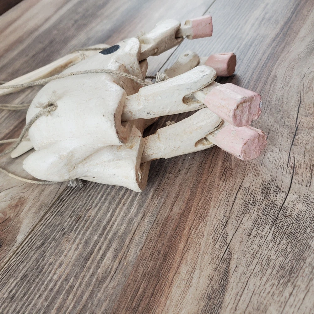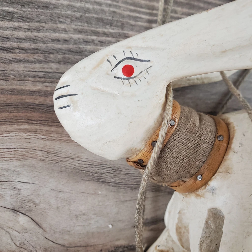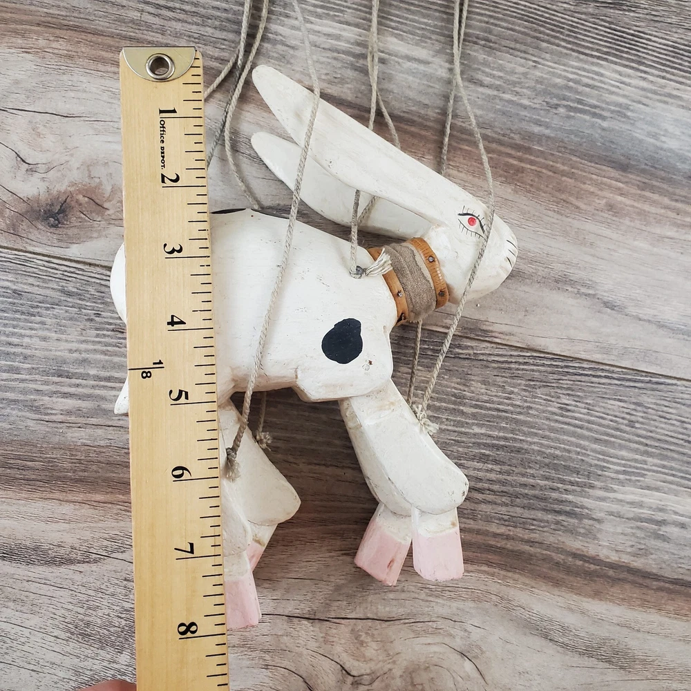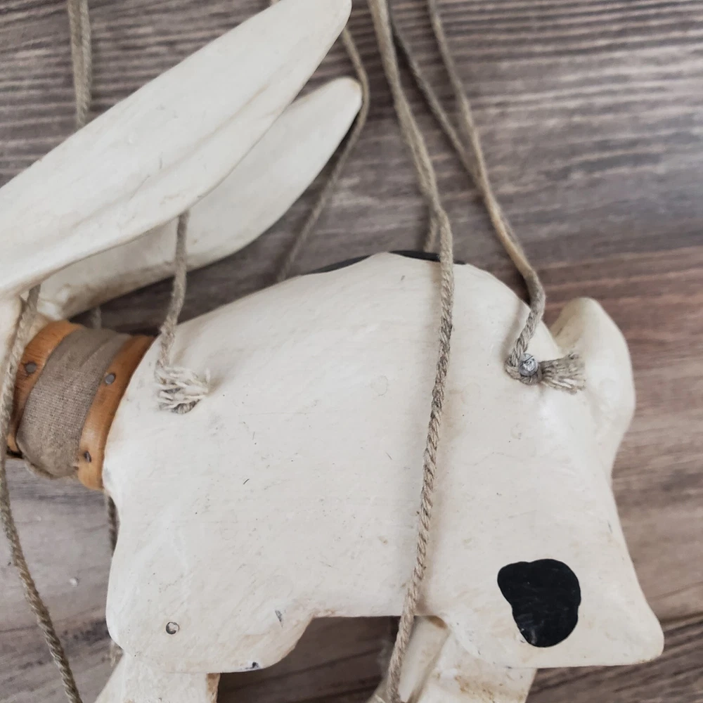 Vintage Hand Carved Wooden Rabbit Bunny Marionette String Puppet Farm Folk Art Well loved, but with no obvious flaws or damage. This item does have a smell, depending on how sensitive you are to smells. I'm not certain, but if I had to guess I'd say it was a smoke smell. I'm fairly sensitive to smoke smell and will often throw items away if I find they smell of smoke. This item sat on my desk and I did not notice the smell until I put my nose to the item itself. If you are very sensitive I would avoid the item for that reason. Other than that, there is just general wear and signs of age. I am unsure on the actual date, but it does appear to be very old. Please view the photos carefully for condition details. Measurements are in the photos. Don't forget to check out the other items in my shop. I'm getting in new fun things all the time. Thank you for looking! Have a great day!