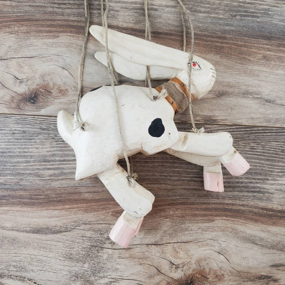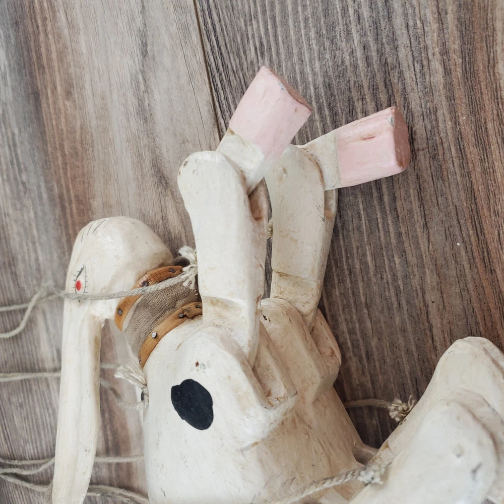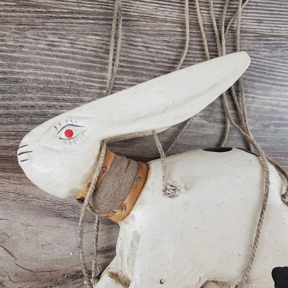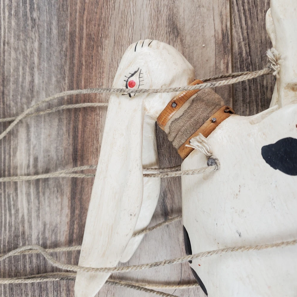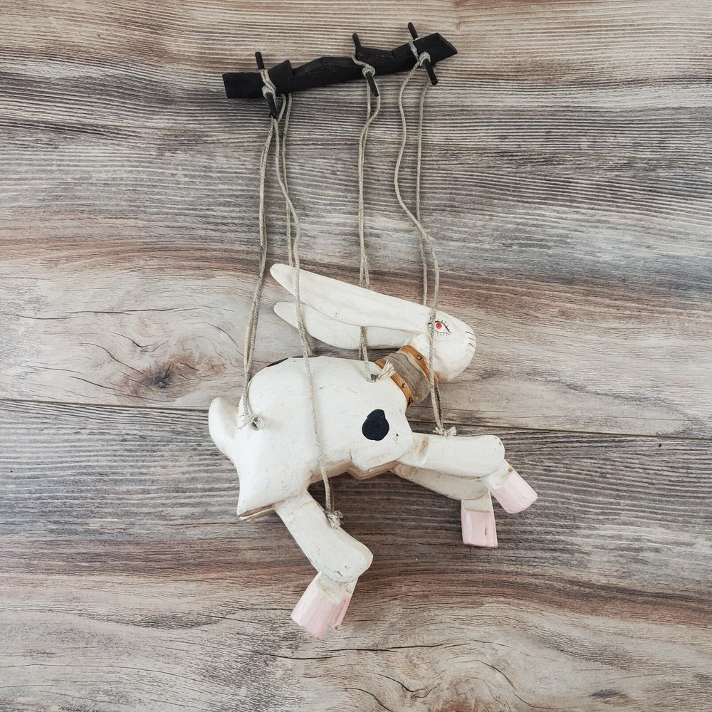 Vintage Hand Carved Wooden Rabbit Bunny Marionette String Puppet Farm Folk Art Well loved, but with no obvious flaws or damage. This item does have a smell, depending on how sensitive you are to smells. I'm not certain, but if I had to guess I'd say it was a smoke smell. I'm fairly sensitive to smoke smell and will often throw items away if I find they smell of smoke. This item sat on my desk and I did not notice the smell until I put my nose to the item itself. If you are very sensitive I would avoid the item for that reason. Other than that, there is just general wear and signs of age. I am unsure on the actual date, but it does appear to be very old. Please view the photos carefully for condition details. Measurements are in the photos. Don't forget to check out the other items in my shop. I'm getting in new fun things all the time. Thank you for looking! Have a great day!