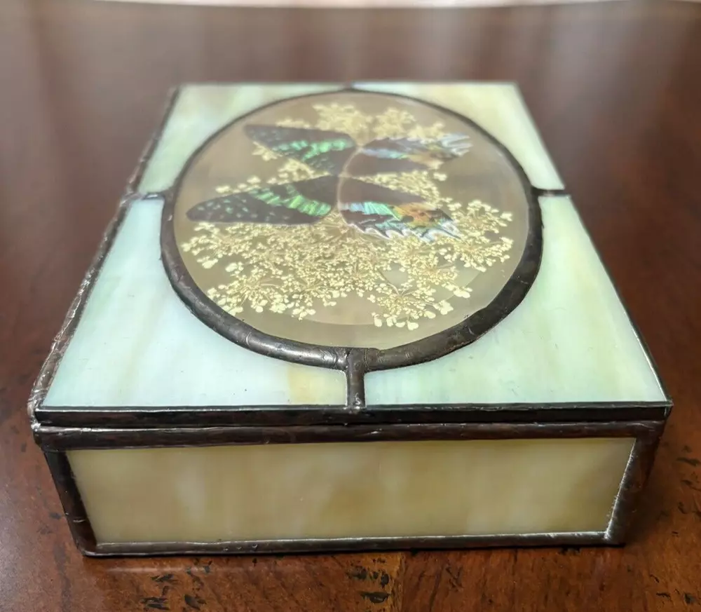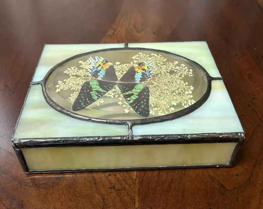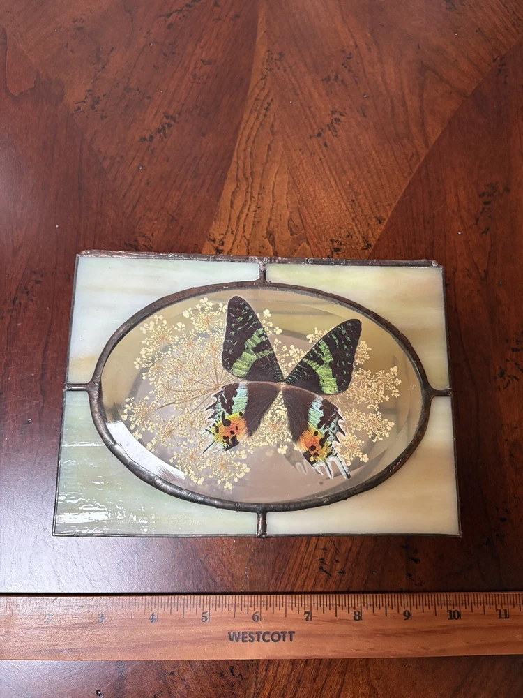 Beautifully hand-crafted jewelry box decorated with butterfly and pressed plants. It is in excellent condition. Measures ( approx.): 7" L, 5.25" W. It has the original sticker. Please see photos for more details. Please note that the item is vintage and may show signs of wear. We have done our best to honestly and accurately describe and photograph the item, including possible flaws. What you see are the actual photos of the item being sold. If you have any questions regarding the item, please ask! We DO NOT SELL outside United States. SHIPPING The item will be shipped within three business days after receipt of payment. We ship via USPS to any location within the 48 continental United States, NO INTERNATIONAL SHIPPING. Shipping is calculated by EBAY based on the weight and size of the item plus packaging. We can combine shipping in case you buy multiple items that can be safely shipped together. Thanks for looking!