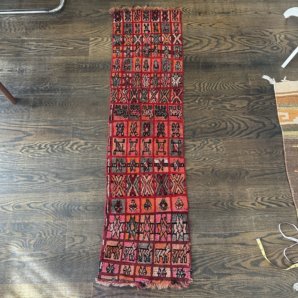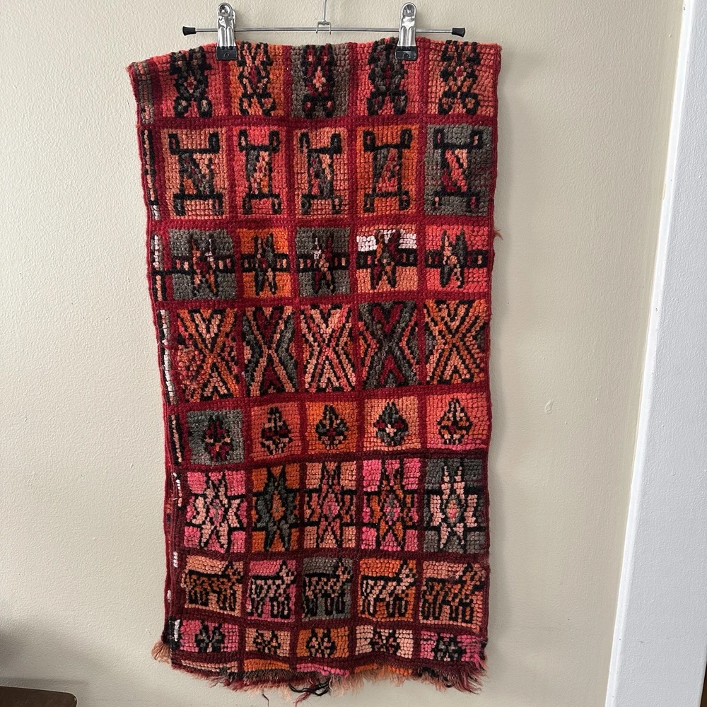 Vintage hand hooked runner rug featuring geometric and animal motifs in rich reds, pinks, and charcoal tones. I bought this at an antique store and there was no tag so don’t have much info on it. It is machine washable. Approx. 16” x 58” Great for hallway, entryway, or layered boho decor. Shows normal vintage wear consistent with age.
