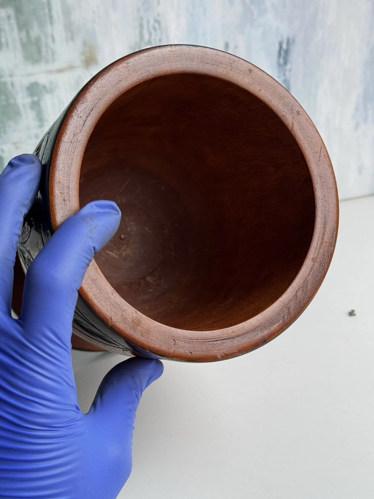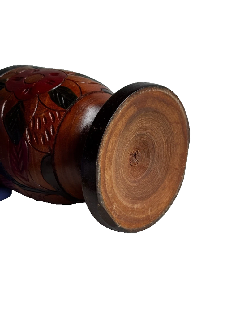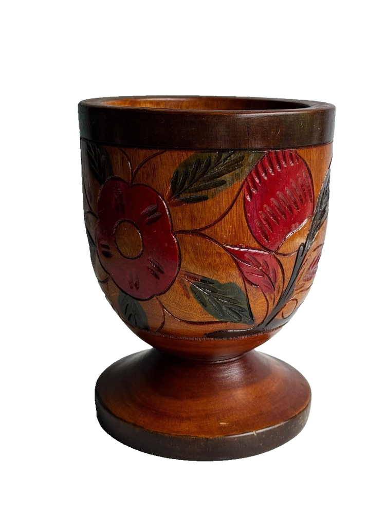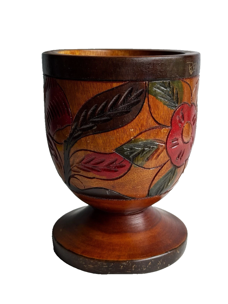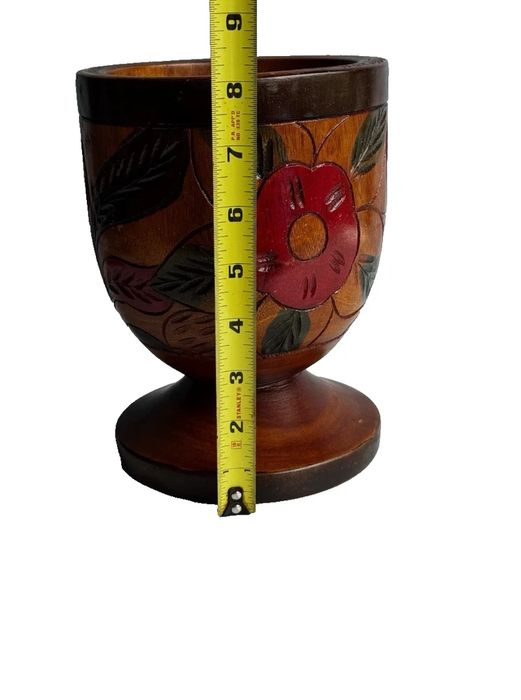 This vintage hand-turned wooden footed pedestal bowl cup is a unique and rustic piece of dinnerware. Standing at 8 inches tall with a 3.25-inch bowl diameter, this one-piece item is perfect for all occasions. The round shape and brown color give it a primitive and charming look, while the hand-carved design adds to its authenticity. Crafted from wood, this footed pedestal bowl is not only functional but also a collectible item that will add character to any kitchen or dining table.aa31