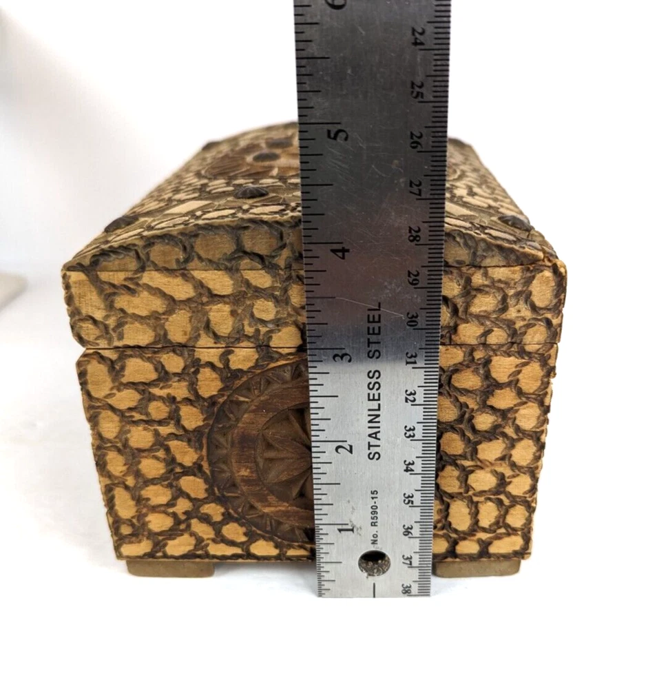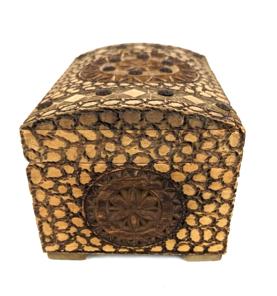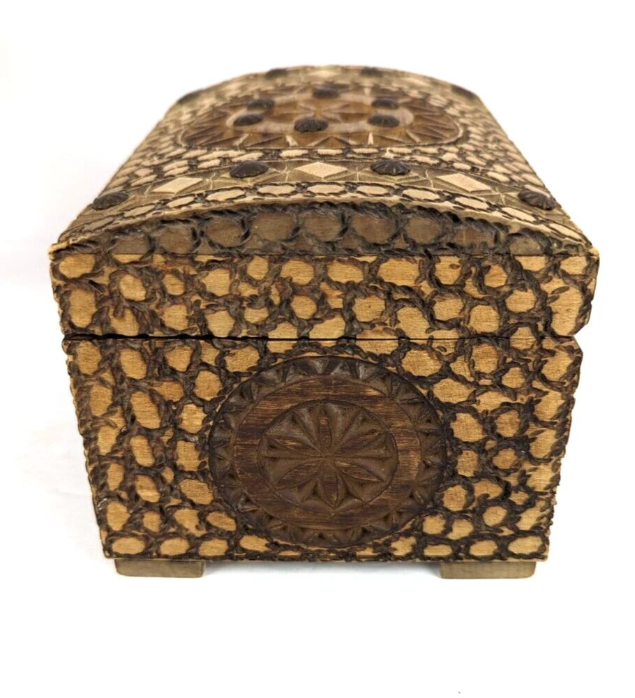Antique Vintage Intricately Hand Carved Domed Top Jewelry Keepsake Box. Very detailed Completely hand carved with an intricate design with steel studs and excellent joinery. Box measures approx 7" by 4.5" and is a little over 4" in height. Dates to the Mid 20th century and is in very good condition with one very small tight age crack in the front left hand corner of the lid (see photos) If you have any questions just ask.