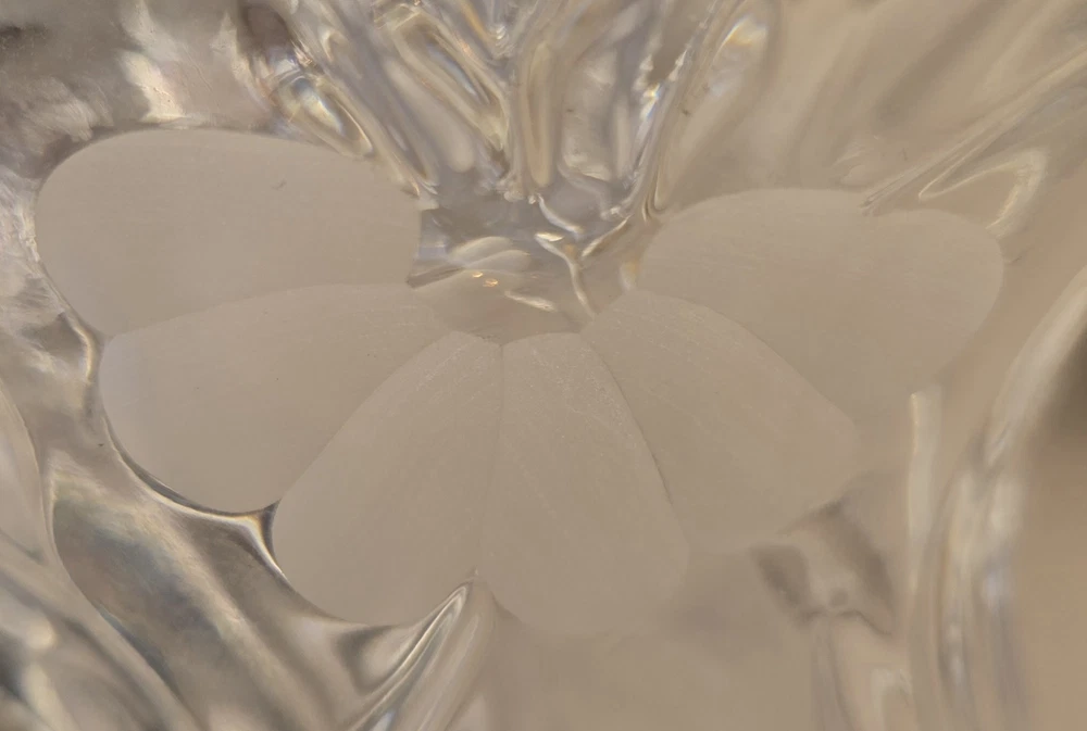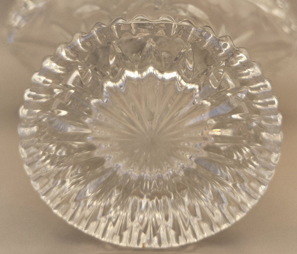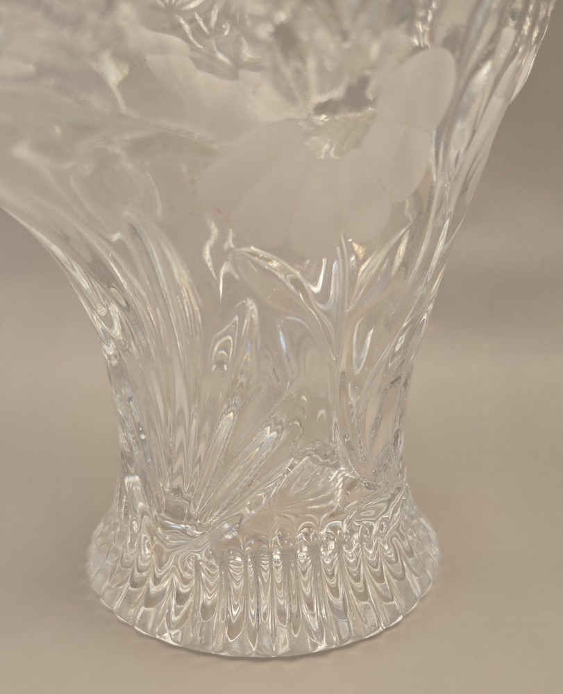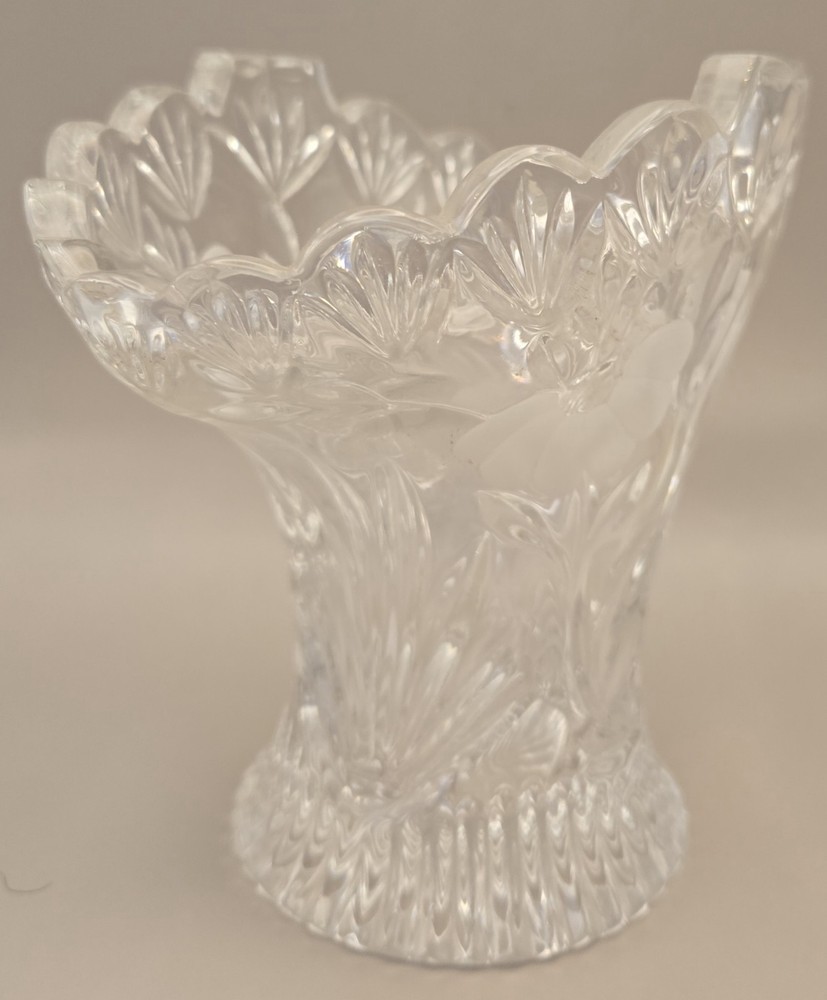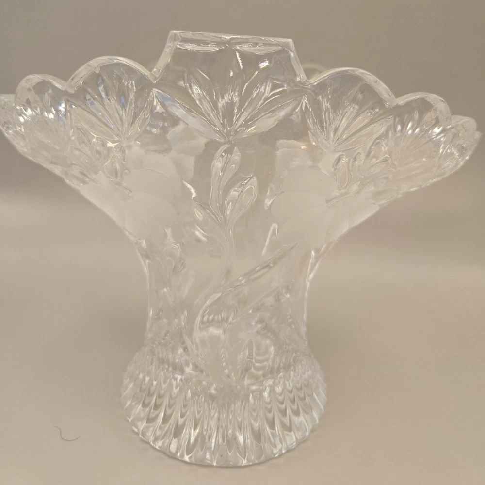 This vintage hand-cut flower vase with crystal etched flowers is a beautiful and elegant addition to any room in your home. The oval-shaped vase features a floral pattern in clear crystal, exuding a Mid-Century Modern style. Standing at 6.5" tall and 7.5" wide, this decorative piece is perfect for displaying flowers in any space. The shiny finish and intricate etched details make it a standout piece that requires no additional parts for display. Care instructions recommend hand washing only, ensuring easy maintenance for this delicate vase. No cracks, chips, or scratches. Thank you for viewing.