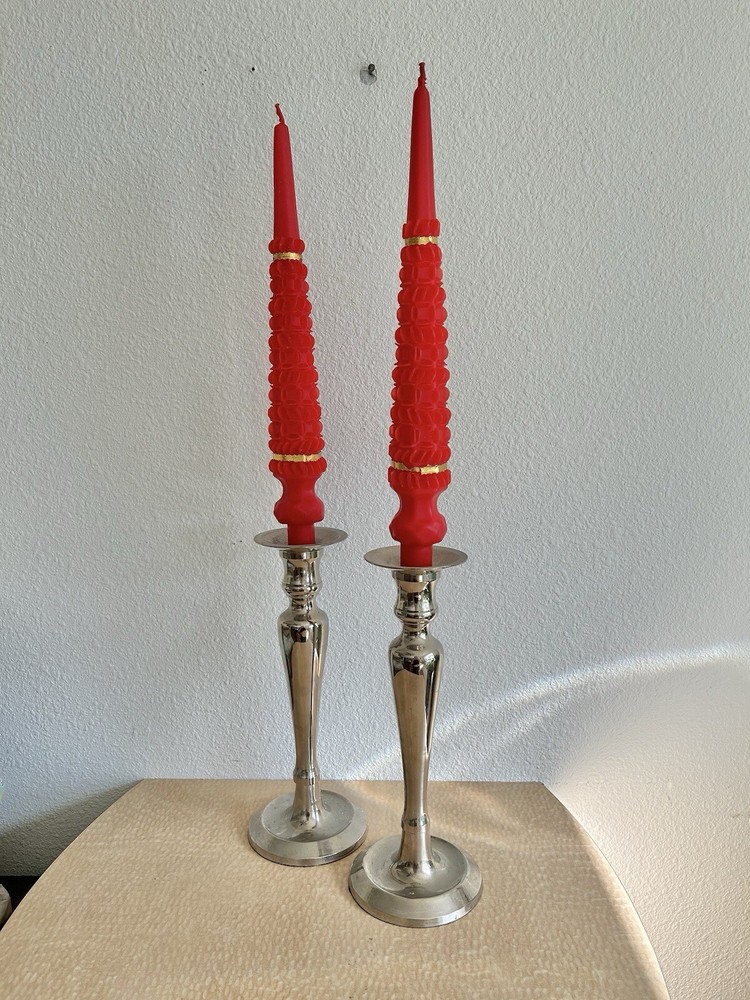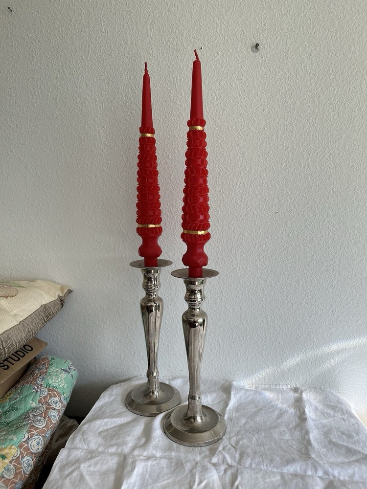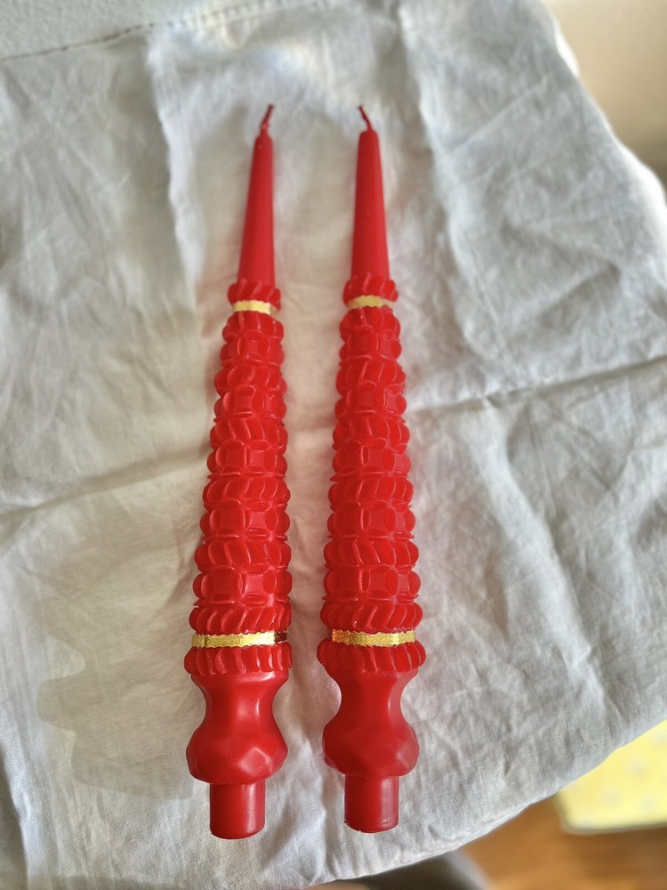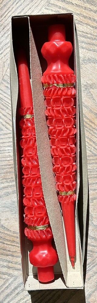 New in old Box - 2 candles Vintage hand dipped red taper candles Made in the Philippines in 60’s or 70’s. Brought over from the Philippines One of the gold rings around the base is torn Wax candles are 14” tall Approx 2” at the widest Shipped in a box to protect X18030500HES *Silver candlestick holders not included* Beatnik, boho, hippie, spiritual, peace, rare, unique, McM, mid century, Christmas, gold, wealth, taper, pillar, old, retro, Xmas