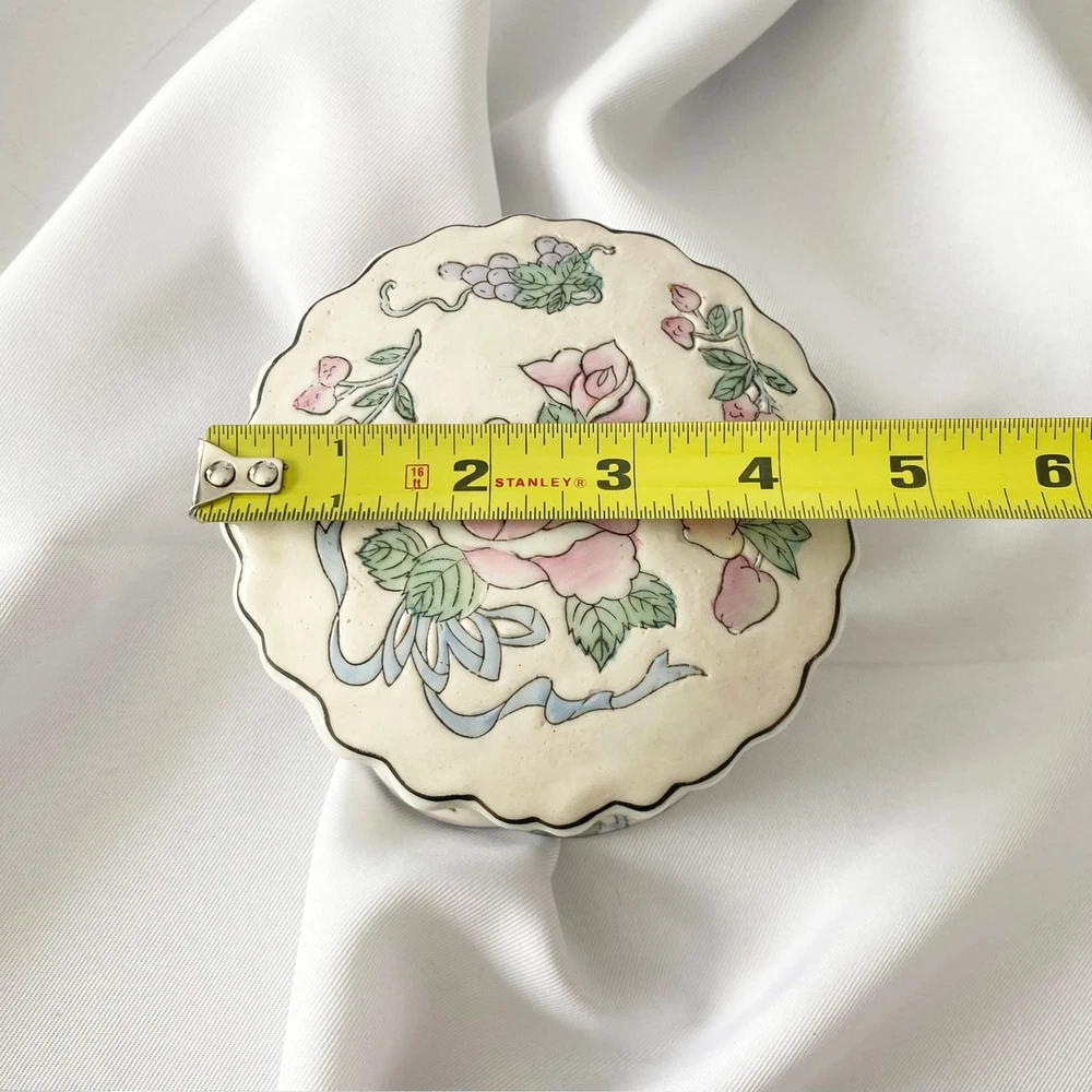 This charming vintage ceramic jewelry box is beautifully hand-painted with delicate pink roses, green leaves, and pastel blue ribbons, offering a touch of timeless elegance. The scalloped edges and intricate floral design make it a perfect addition to your shabby chic or cottage-core decor. Ideal for storing jewelry, keepsakes, or small treasures, this trinket box is both functional and decorative. Its romantic design makes it an excellent gift for collectors, vintage enthusiasts, or anyone who appreciates beautiful, handcrafted decor. Bring a touch of vintage charm to your home or give a heartfelt gift to someone special with this lovely jewelry box. Order today and enjoy a piece of timeless artistry!