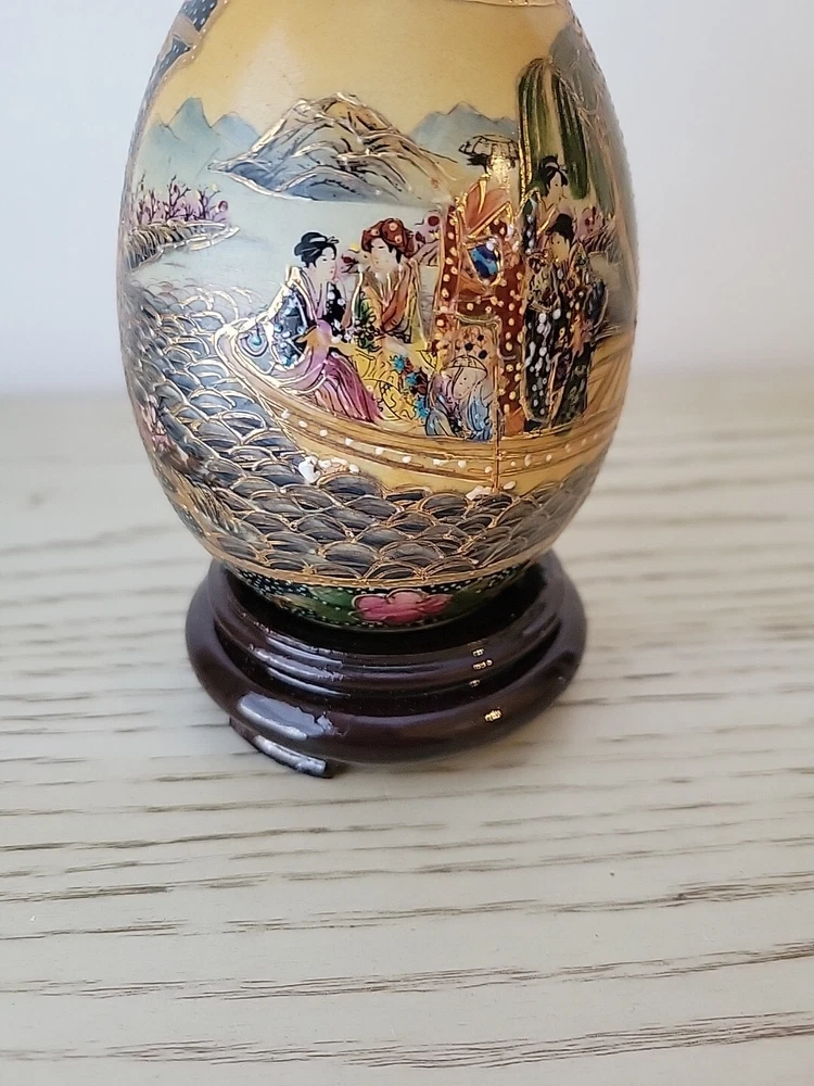 This vintage Chinese Satsuma porcelain egg is a stunning piece of artwork. Hand painted with intricate details, it features beautiful geishas and is adorned with gilt paint. Measuring at 4.5 inches, it is a perfect addition to any collector's display. The egg is in excellent condition, with no chips or cracks, and is sure to impress anyone who sees it. See all pictures for condition.