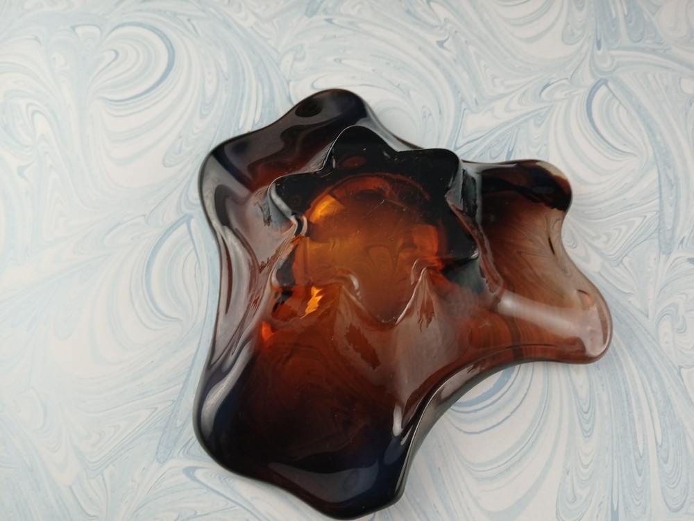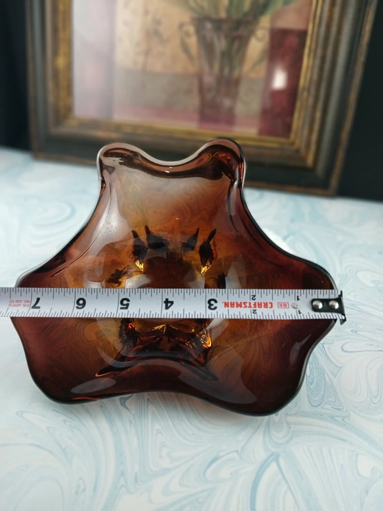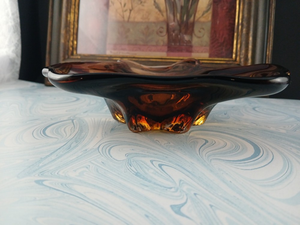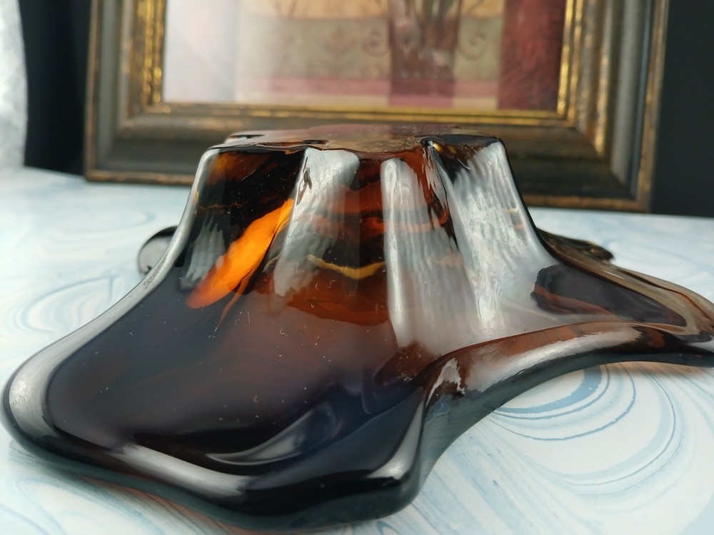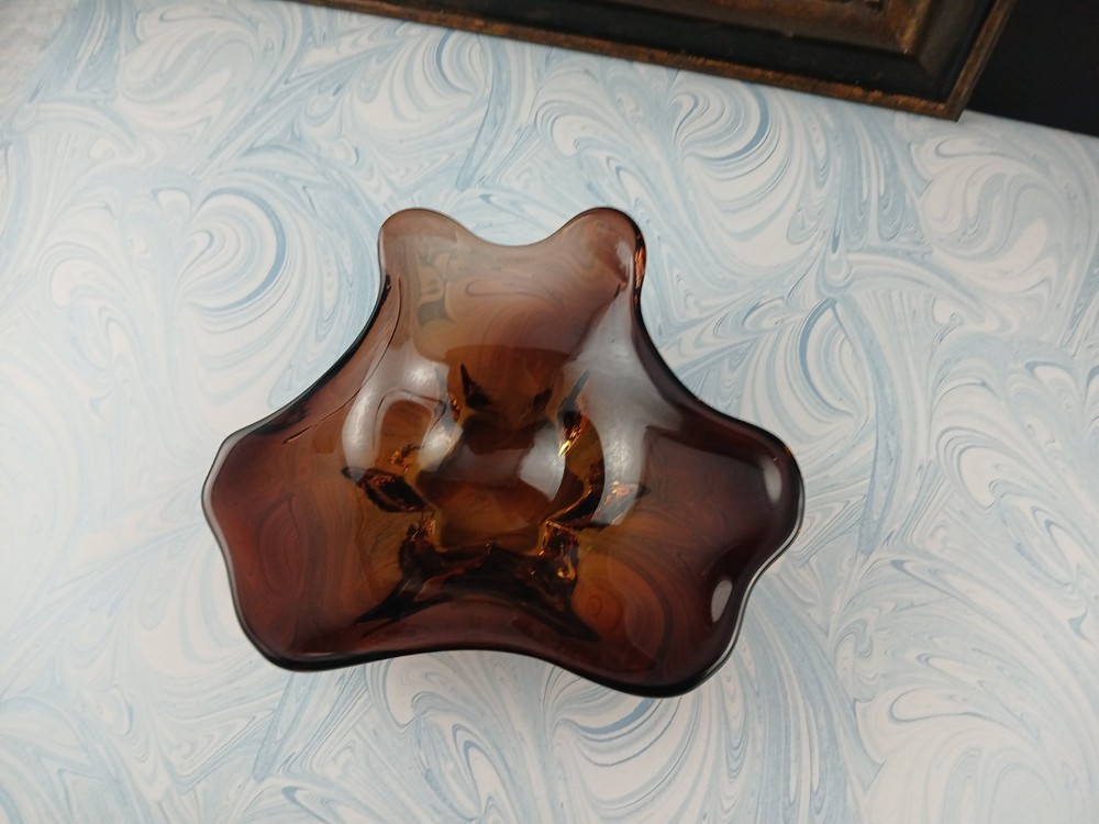 Type:Candy DishBrand:UnmarkedVintage:YesProduction Style:Art GlassOriginal/Licensed Reproduction:OriginalProduction Technique:Hand Blown GlassFeatures:DecorativeNumber of Compartments:1Color:clear brown amberShape:AbstractFinish:GlossyNumber of Items in Set:oneMaterial:Glass
