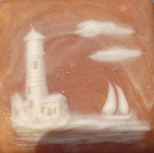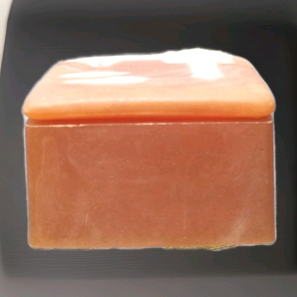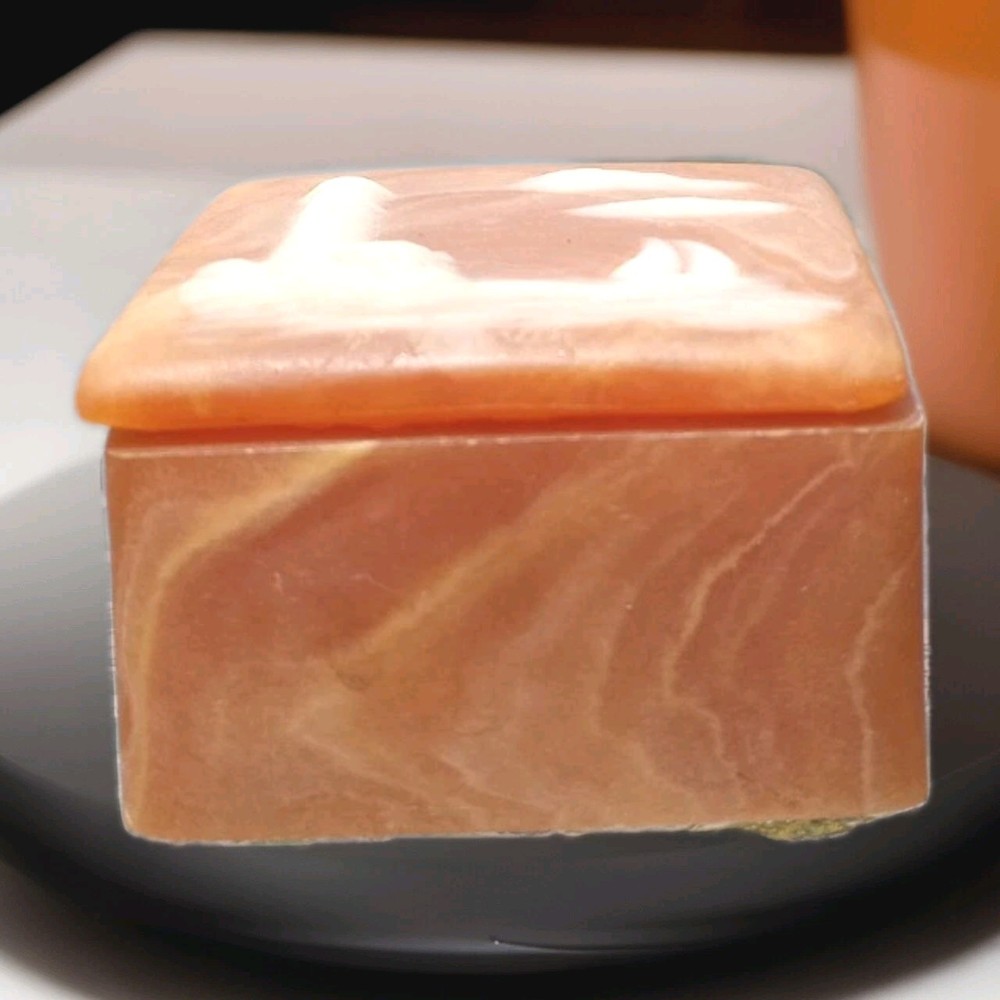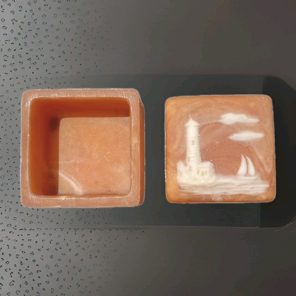 This vintage mini soapstone trinket box features a nautical theme with a lighthouse design, handcarved from metamorphic rock. The small square box has a matte finish in a shade of orange, with intricate carvings with a 3D effect, suitable for jewelry, trinkets, and keepsakes. With a 1970s style and nautical pattern, this unique piece is perfect for any room and would make a charming addition to any collection of decorative keepsake boxes. Please refer to pictures for condition details.