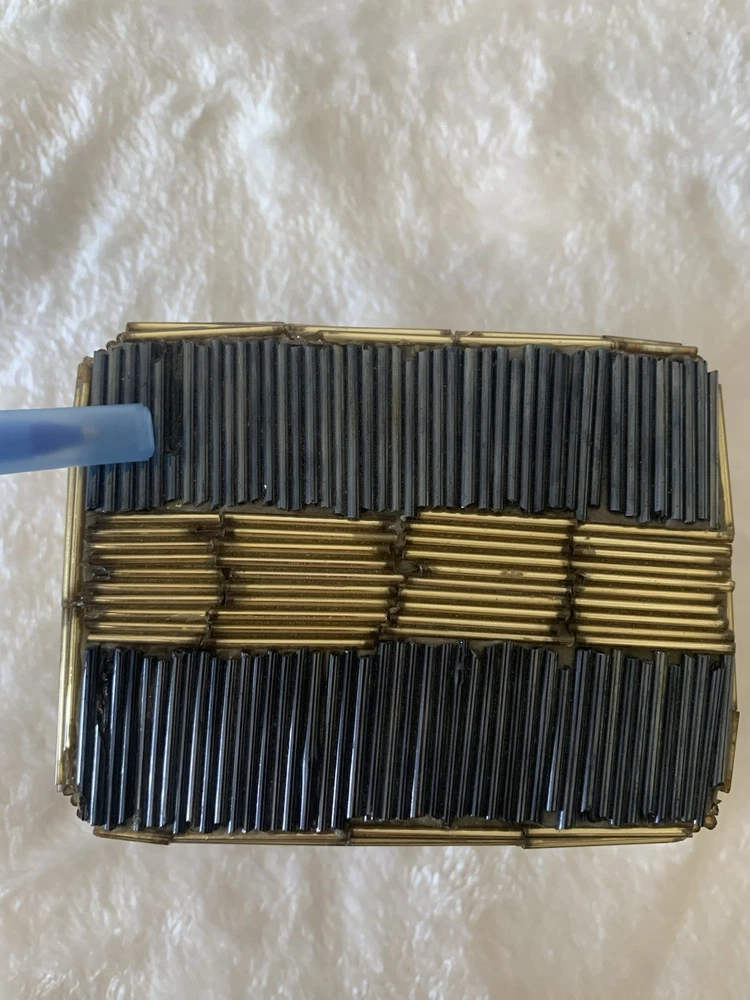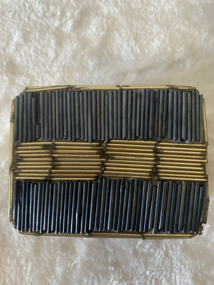 This vintage beaded trinket box is a charming addition to any room. Handmade with a multicolor design, this small rectangular box is perfect for storing jewelry or other small items. Ideal for all occasions, this unique piece adds a touch of artistry to your decor. The trinket box comes packaged in a box and is suitable for furniture use. Clean with a damp cloth to maintain its appearance, this original piece from the Keepsake Boxes collection is a lovely addition to any home.