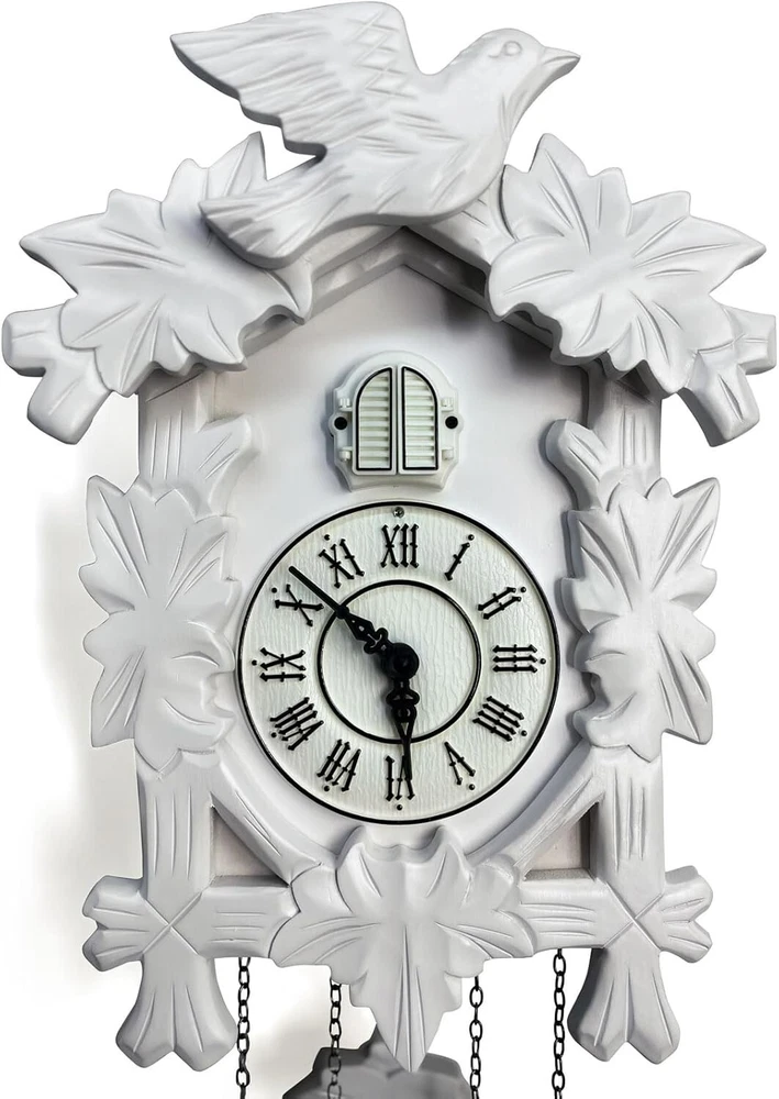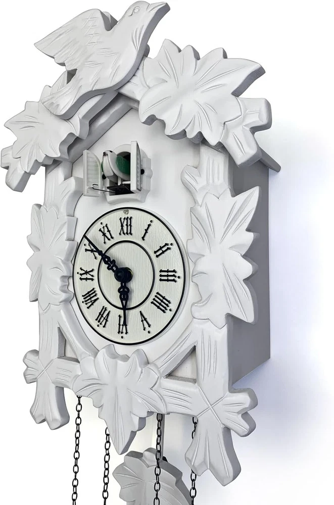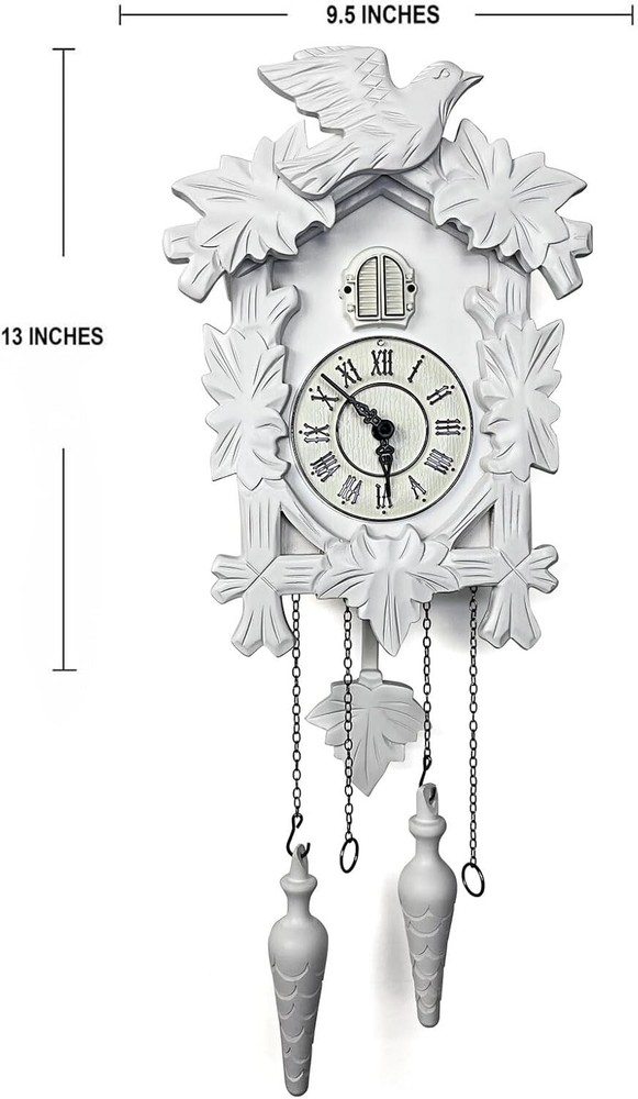Cuckoo Clock Vintage Large Wooden Wall Clock Handcrafted Inch White Made of linden wood with hand-carved decorations. The bird comes out and sings 'co co' every hour. Detailed instructions on how to set the chime and time are available on the product description page. Two LR20/D batteries Operated (not included) Automatic Night Shut Off Sensor -- night silencer. Adjustable Volume - (High, Low or Shut off) Net size: 13"H x 9-1/2"w x 5-1/4" D Handcrafted Vintage Wood Cuckoo Wall Clock: A charming decoration for your home. All are fitted with manual volume control and shut off switch. One thing that is unique about same quart cuckoos is that it has a photo-cell which is light sensor so you also have an automatic night shut-off When you turn your lights off at night, it automatically turns off the cuckoo call. During the call if cuckoo the double doors open and the cuckoo bird comes out, With same models the cuckoo bird actually flaps his wings as he cuckoos to the sound of running water in the background. The call itself is the acutal recording of a cuckoo bird in the wilds.