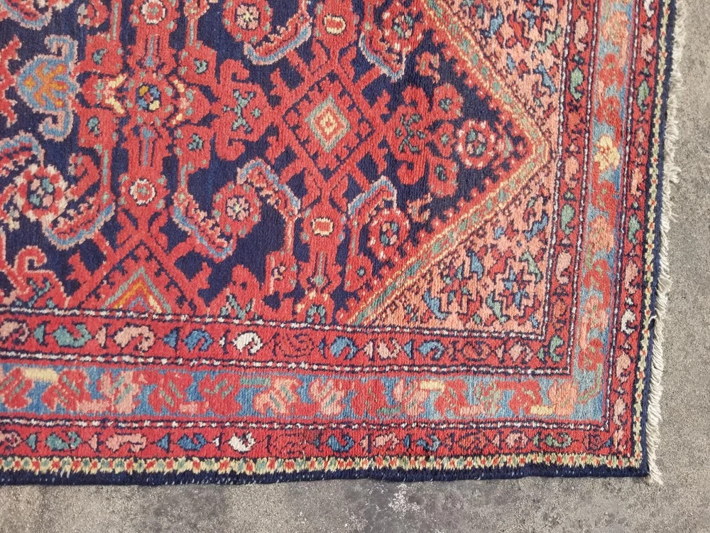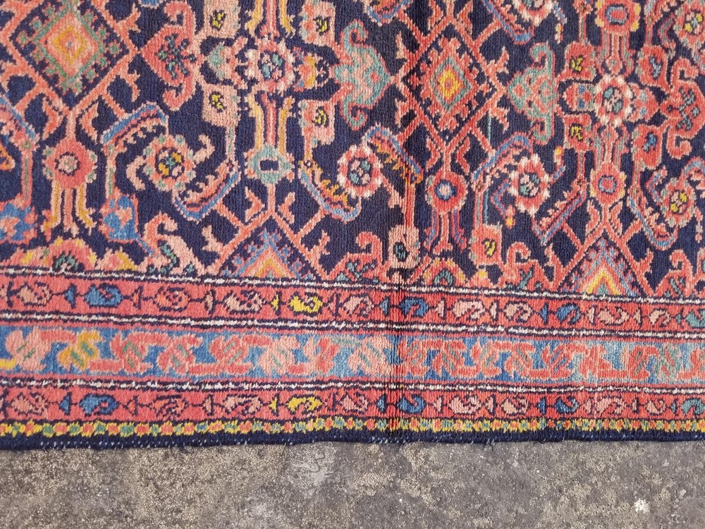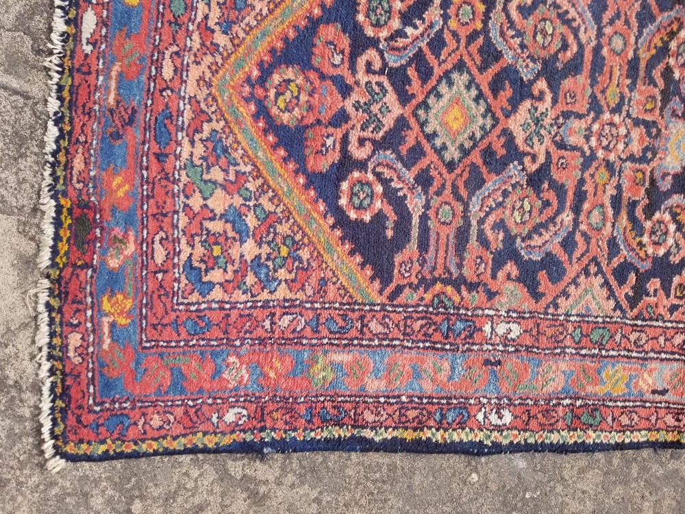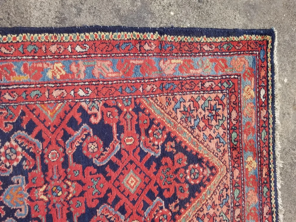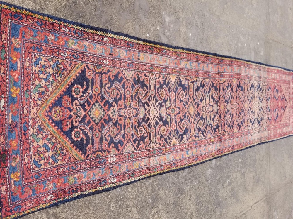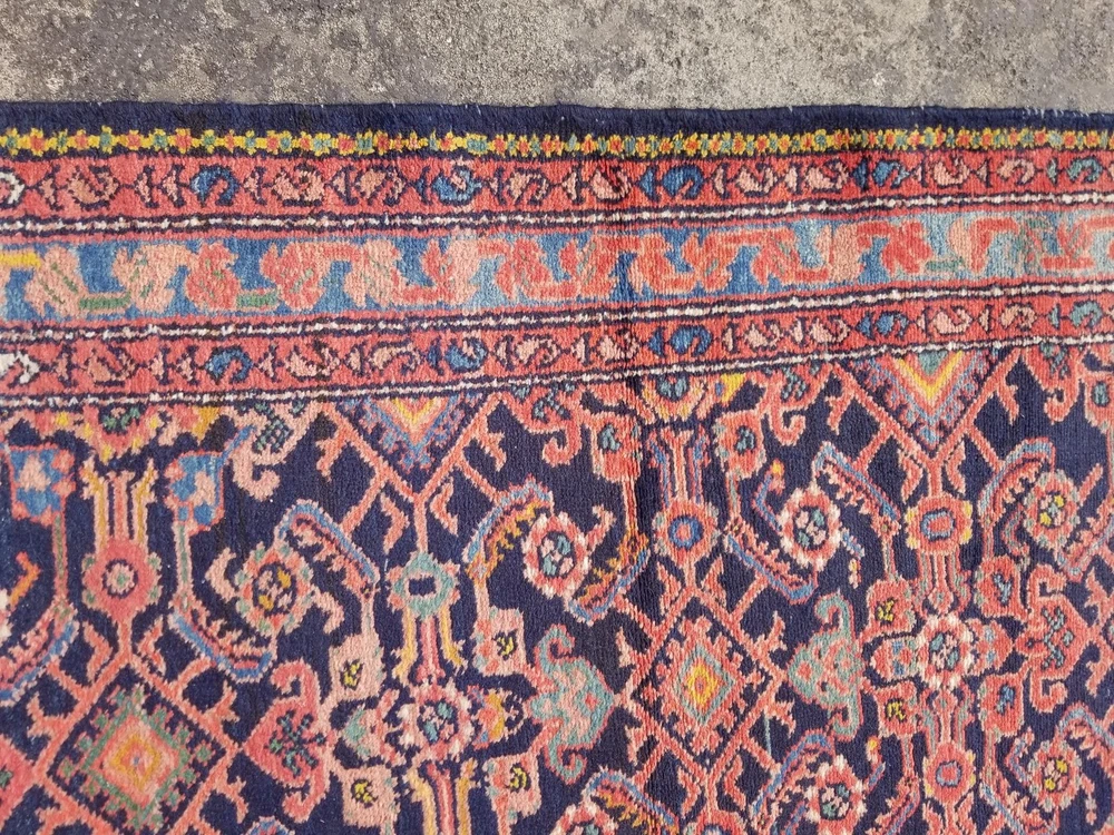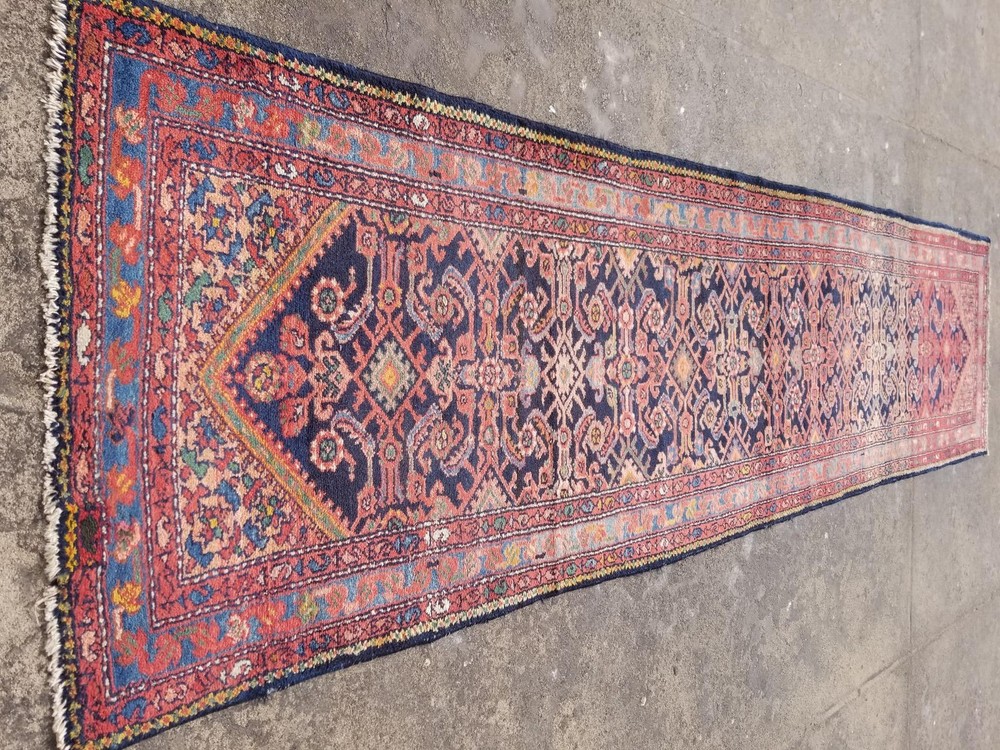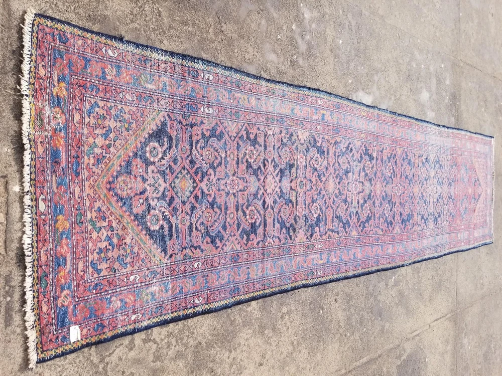 Description: This vintage handmade Hamadan-style runner showcases a classic elongated medallion design with intricate geometric and floral elements throughout. The deep navy field is beautifully contrasted with rich reds, soft blues, and warm accents, creating a balanced and timeless look. Hamadan rugs are known for their durability and bold patterns, making them ideal for high-traffic areas. Hand-knotted from wool, this runner offers both strength and a soft underfoot feel while adding character to any interior. Size: Centimeters: 402 x 107 cm Inches: 158 x 42 in Feet: 13.2 x 3.5 ft Details: Handmade / Hand-knotted Material: 100% Wool Style: Hamadan Style Runner Colors: Navy, Red, Blue, Multicolor Condition: Vintage (age-related wear visible, adds to character) Listing and template services provided by inkFrog
