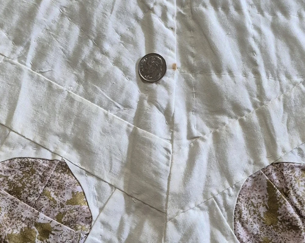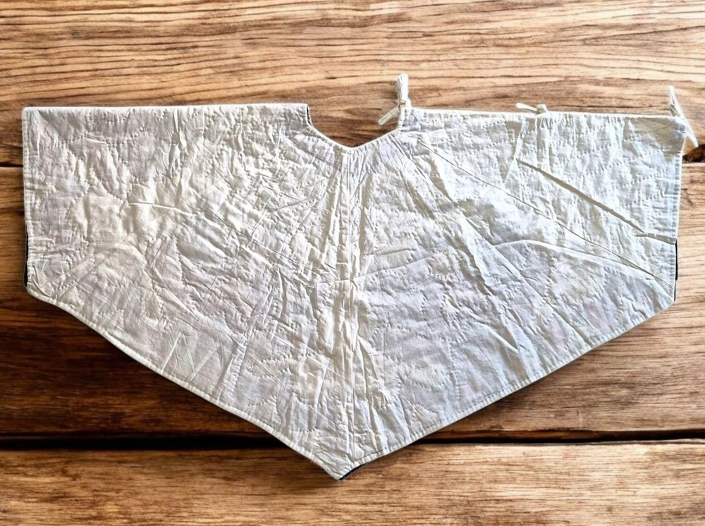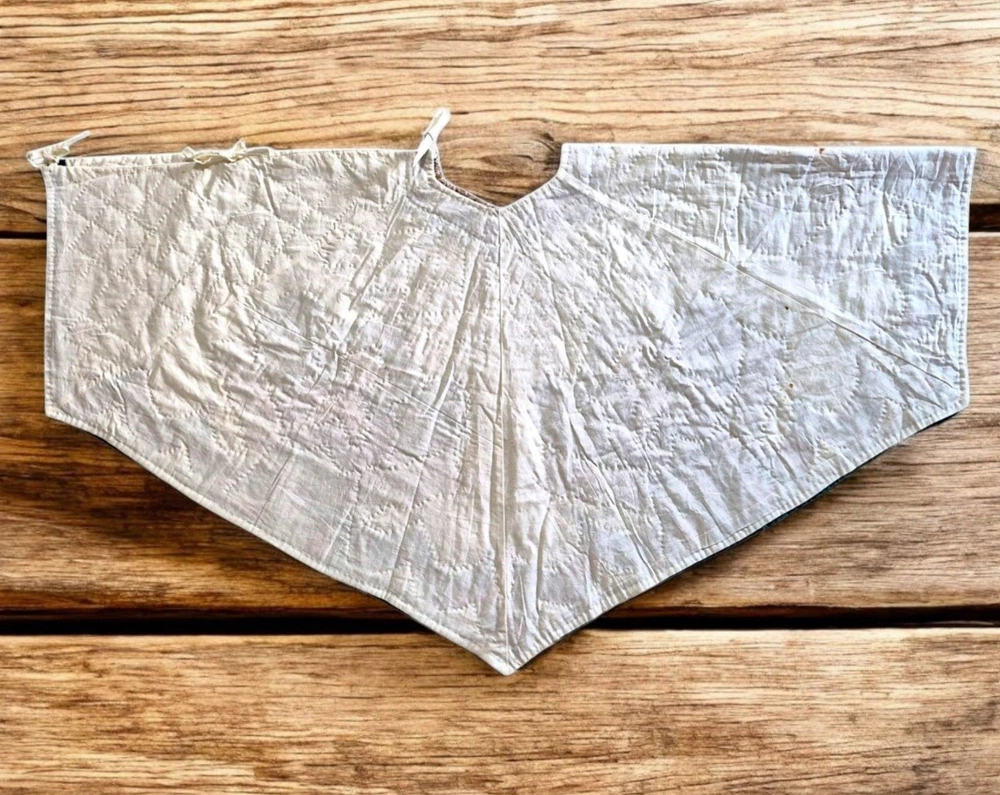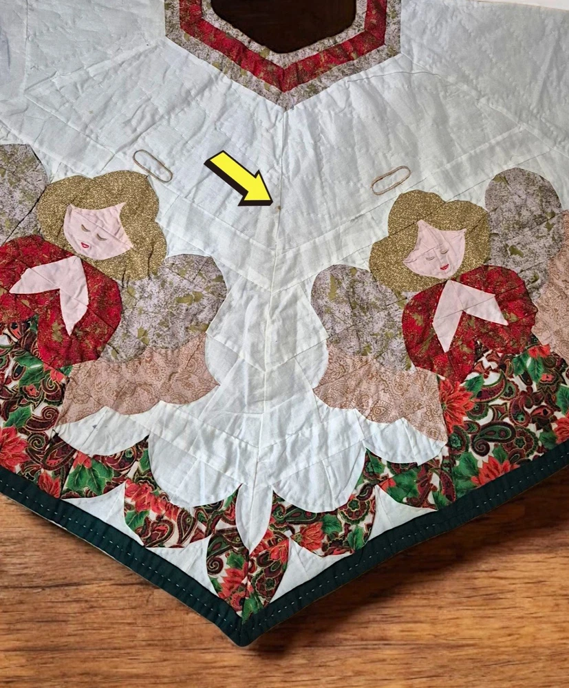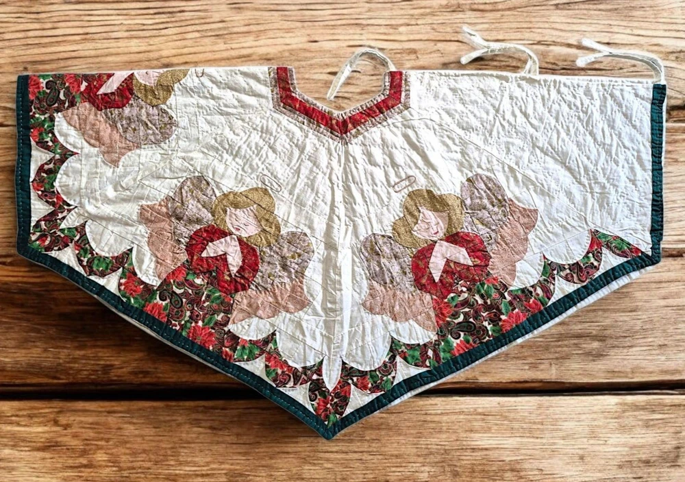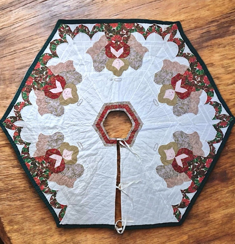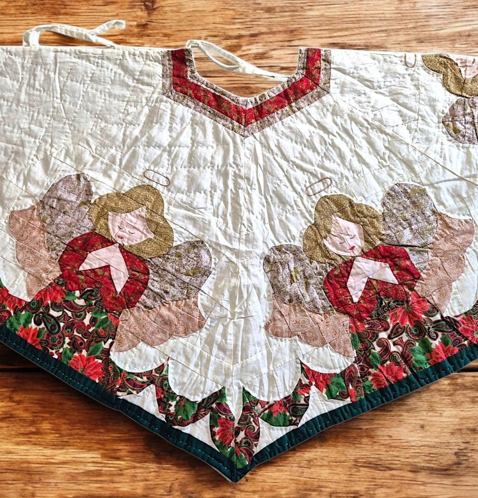 Large 54" hand-made vintage 1950's-1970's Christmas Tree Skirt. Features a patchwork quilt angel design in a hexagon shape. Very nice vintage pre-owned condition. Please note ... it does have a few stains on front and back. I have them marked with a yellow arrow in photos.
