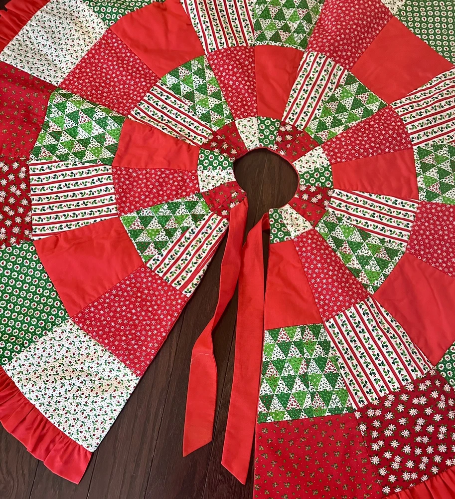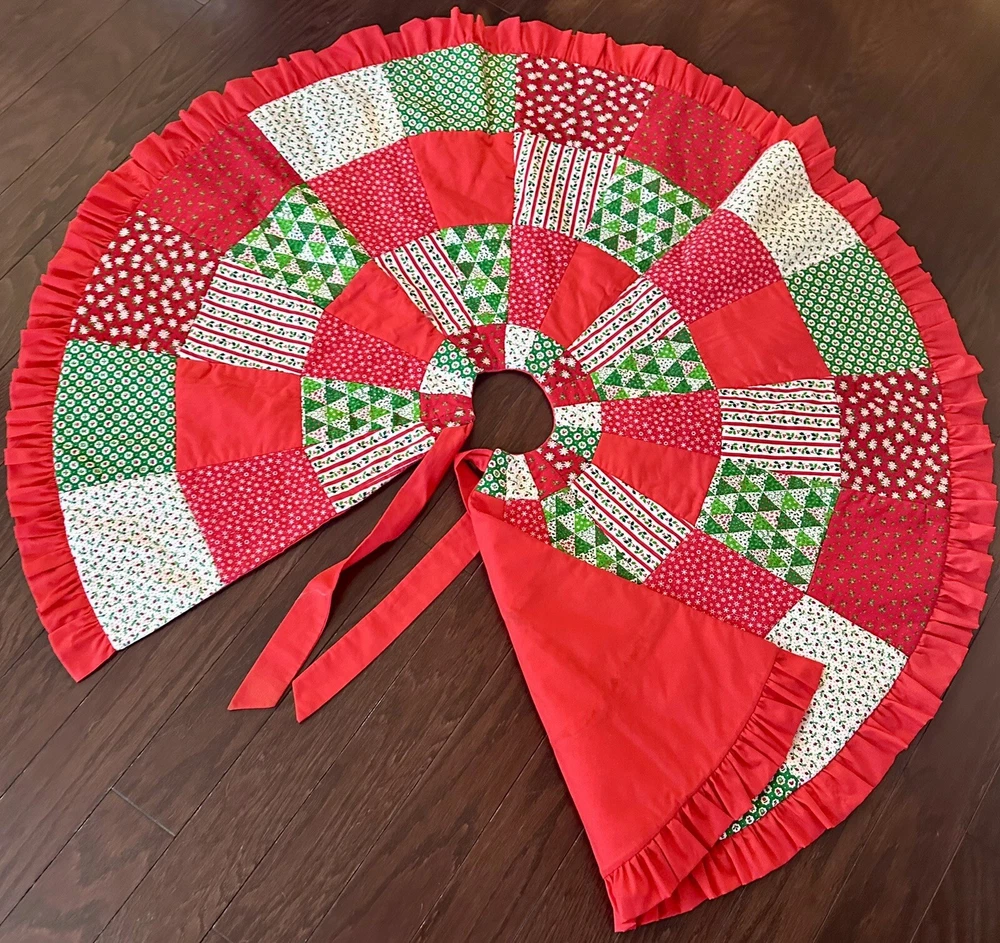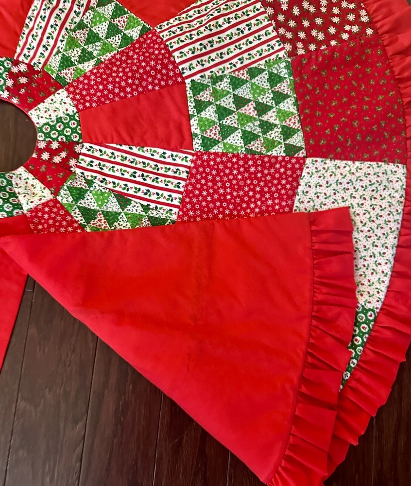 Beautiful quilted patchwork hand made tree skirt with traditional red green shades and holiday prints. Quilted with a batting between cotton. Appears completely unused and in pristine condition.