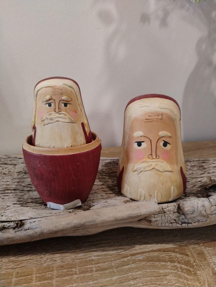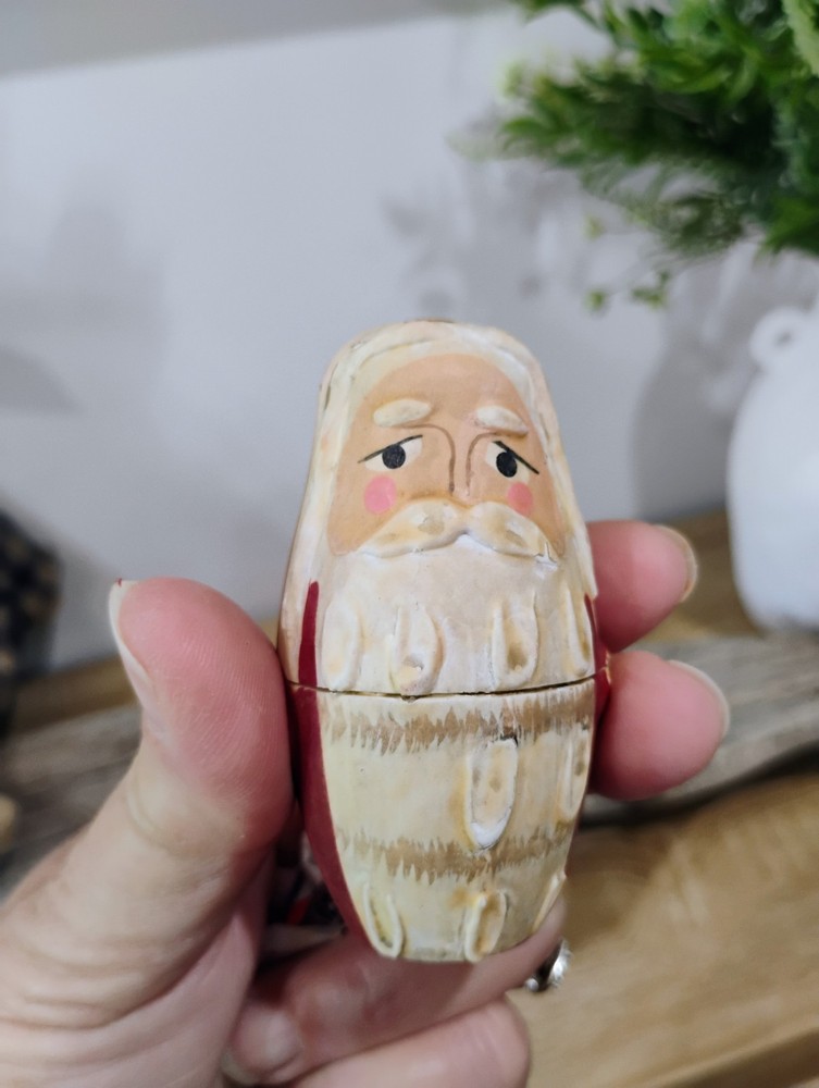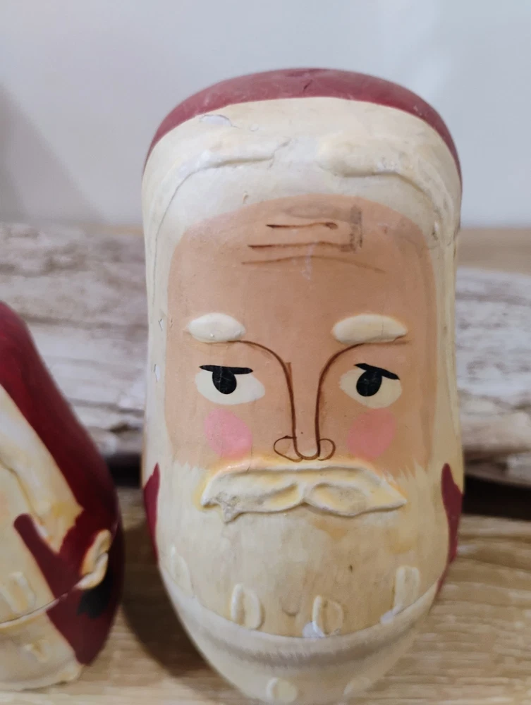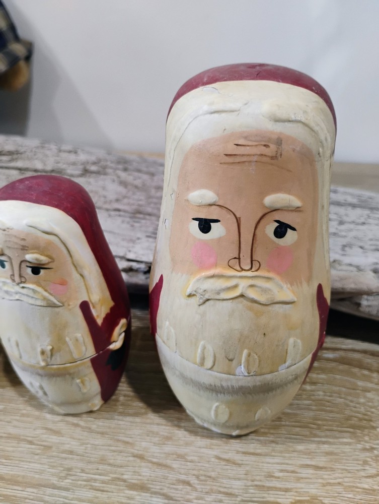 These Vintage Hand-painted Santa Claus Nesting Dolls Set of Three is a charming addition to any collector's holiday decor collection. Hand-painted in a multicolor Russian style, these medium-sized dolls feature an all-over Santa Claus pattern, perfect for Christmas. Made of wood and standing at 5.5 inches tall, this set captures the essence of the holiday season with its original design and hand-painted finish. Ideal for adults who appreciate seasonal figurines, these Santa nesting dolls are a unique and nostalgic touch to any Christmas display.