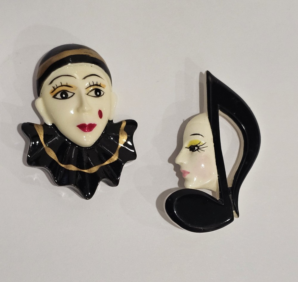 The product is a set of two vintage brooches. One brooch features a harlequin or clown design, while the other showcases a music note with a face. Both brooches are offered at a price of $13 for the pair. These pieces of jewelry fall under the category of fashion brooches and are a unique addition to any jewelry collection. The harlequin/clown and music note designs add a whimsical and playful touch to any outfit, making them a fun and eye-catching accessory to wear.