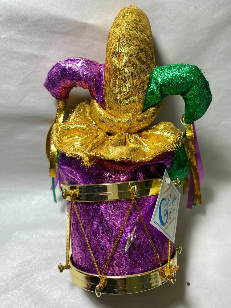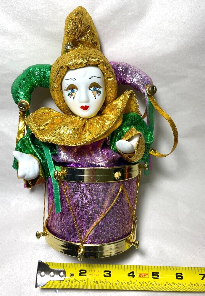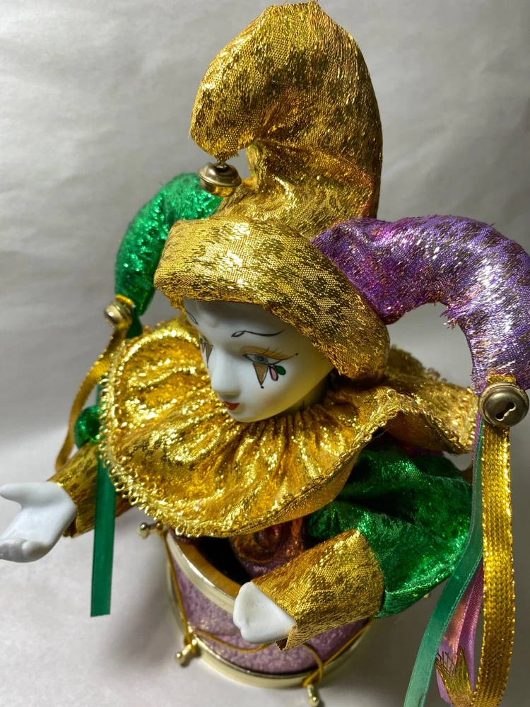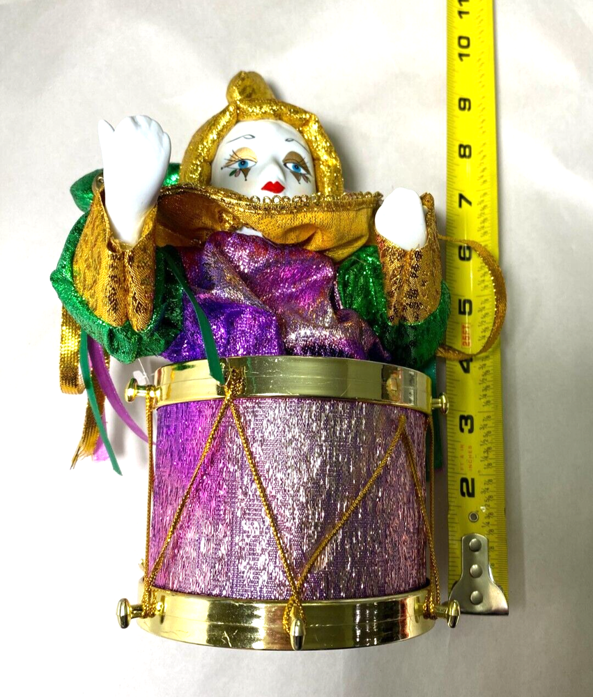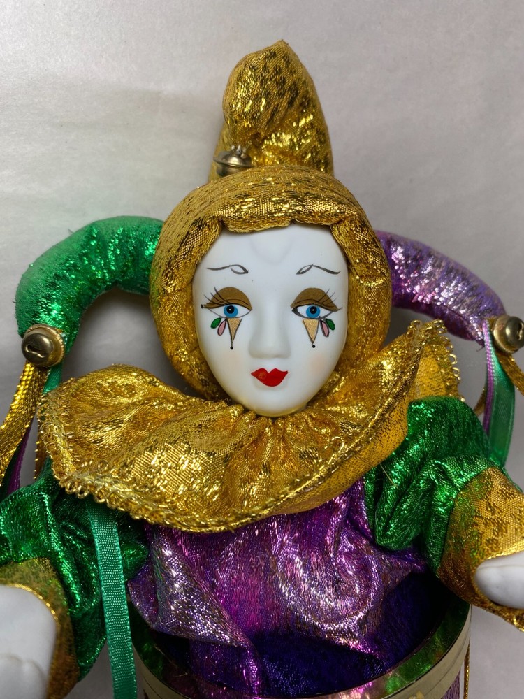 Harlequin Jester Clown Doll in Drum Music Box, New Orleans, Porcelain face and hands Vintage collection Size: 9.5 inches Color: multi-colored Pre-owned with original tag Shipped with USPS Ground Advantage Accept Return within 14 days as long as item is in the same condition as it was shipped. Buyer Pays Return Shipping. Thank You for your Business and Have a Nice Day!