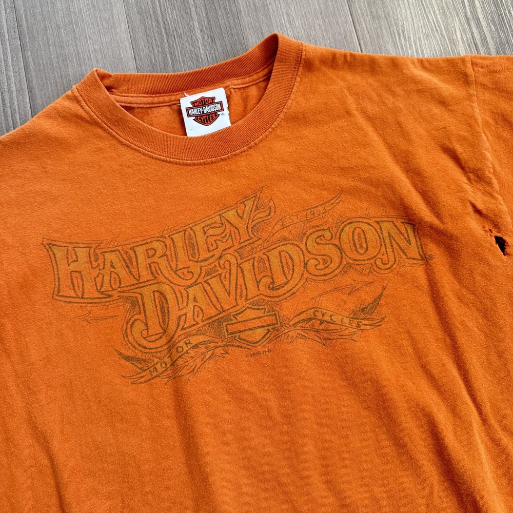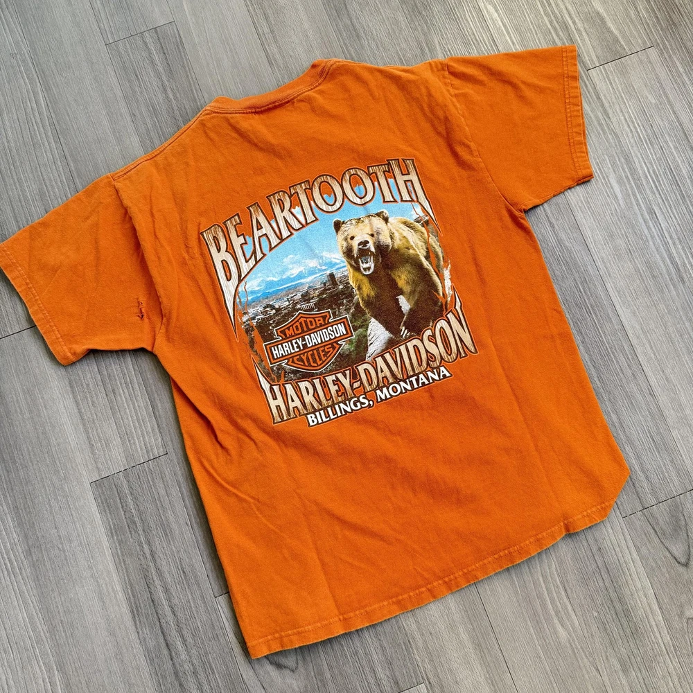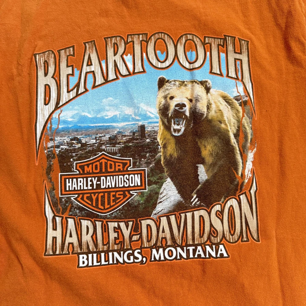 Vintage Harley-Davidson Beartooth Shirt Mens Large Orange Bear Made USA Tee Pre-owned Harley-Davidson Beartooth graphic T-shirt with general wash wear, fabric softening, and overall fade from regular use. Right side torso near the underarm seam has a torn area with multiple small holes and frayed fabric visible on both front and back panels. Remaining fabric, collar, sleeves, hem, and printed graphics are structurally sound and the shirt remains wearable for casual Harley-Davidson, repaired, or intentionally distressed style outfits. Brand: Harley-Davidson. Style: Mens short sleeve dealership graphic T-shirt. Color: Orange body with tonal front logo and multicolor back bear graphic. Size on tag: Mens Large (L). Material: 100% pre-shrunk cotton jersey knit fabric. Details: Classic crew neckline with ribbed collar and straight hem for a regular T-shirt fit. Details: Front features Harley-Davidson script logo with bar and shield emblem and scroll artwork across the chest. Details: Back features large Beartooth Harley-Davidson Billings, Montana scenery graphic with roaring bear, mountains, skyline, and bar and shield logo. Details: Inner neck tag displays Harley-Davidson Motor Cycles shield logo with secondary tag noting 100% pre-shrunk cotton, Made in U.S.A., RN15763, and size L. Special notes: Made in U.S.A. Harley-Davidson dealership tee from Beartooth Harley-Davidson in Billings, Montana, suitable for riders, collectors, and fans of bear or Montana-themed motorcycle art; please review all photos for close-ups of artwork, tag, and fabric details before purchase. 2023