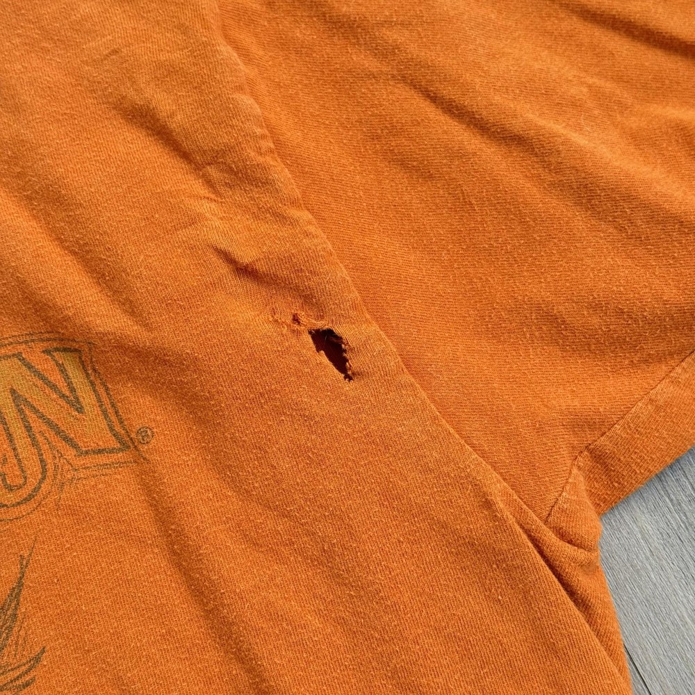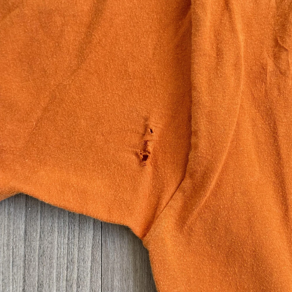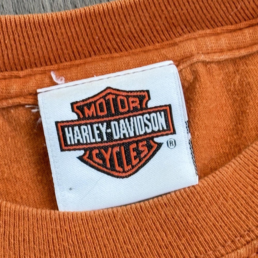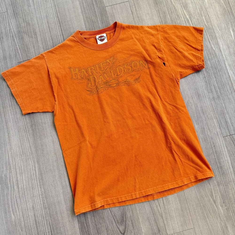 Vintage Harley-Davidson Beartooth Shirt Mens Large Orange Bear Made USA Tee Pre-owned Harley-Davidson Beartooth graphic T-shirt with general wash wear, fabric softening, and overall fade from regular use. Right side torso near the underarm seam has a torn area with multiple small holes and frayed fabric visible on both front and back panels. Remaining fabric, collar, sleeves, hem, and printed graphics are structurally sound and the shirt remains wearable for casual Harley-Davidson, repaired, or intentionally distressed style outfits. Brand: Harley-Davidson. Style: Mens short sleeve dealership graphic T-shirt. Color: Orange body with tonal front logo and multicolor back bear graphic. Size on tag: Mens Large (L). Material: 100% pre-shrunk cotton jersey knit fabric. Details: Classic crew neckline with ribbed collar and straight hem for a regular T-shirt fit. Details: Front features Harley-Davidson script logo with bar and shield emblem and scroll artwork across the chest. Details: Back features large Beartooth Harley-Davidson Billings, Montana scenery graphic with roaring bear, mountains, skyline, and bar and shield logo. Details: Inner neck tag displays Harley-Davidson Motor Cycles shield logo with secondary tag noting 100% pre-shrunk cotton, Made in U.S.A., RN15763, and size L. Special notes: Made in U.S.A. Harley-Davidson dealership tee from Beartooth Harley-Davidson in Billings, Montana, suitable for riders, collectors, and fans of bear or Montana-themed motorcycle art; please review all photos for close-ups of artwork, tag, and fabric details before purchase. 2023