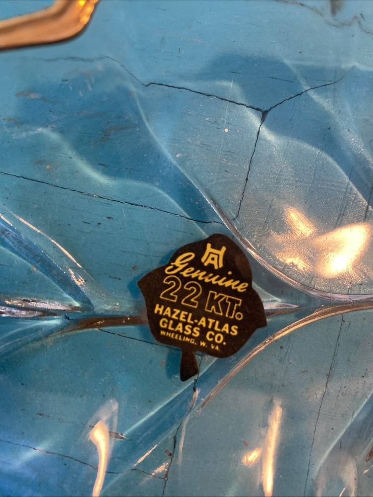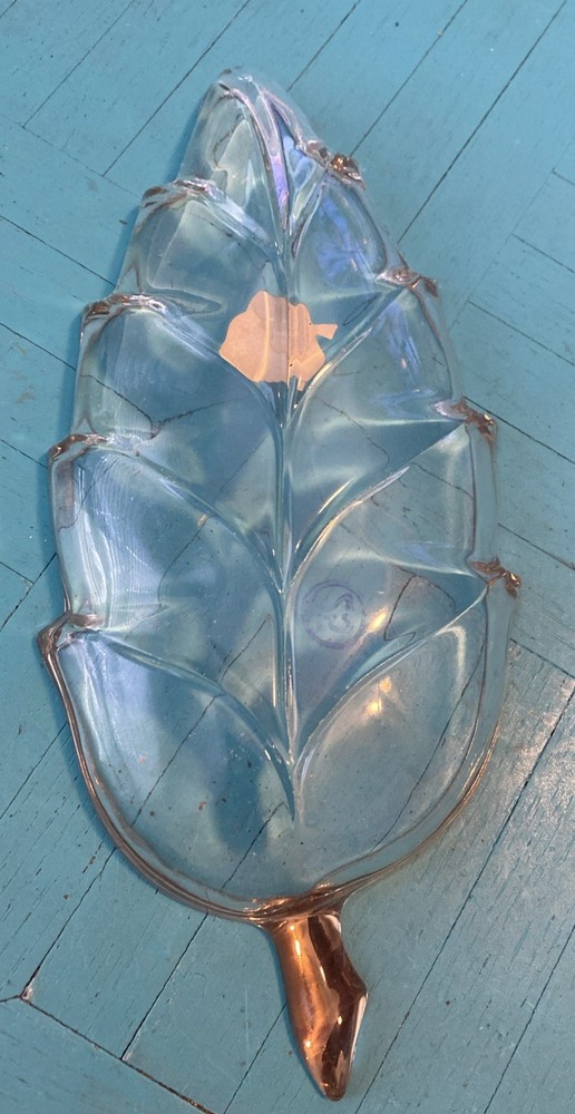 Crafted with the timeless elegance that Hazel-Atlas is known for, this vintage candy dish boasts a classic leaf design, cast in lustrous 22-karat gold. The dish measures 4" x 10", offering ample space for your favorite sweets or as a sophisticated display piece. The clear glass base shines brightly, highlighting whatever it holds, while the intricate gold detailing adds a touch of luxury to any setting. Whether used for special occasions or as a permanent display in your home, this piece is sure to catch the eye and elevate your decor.
