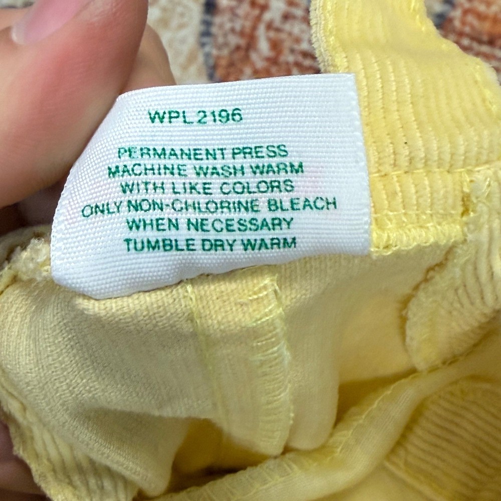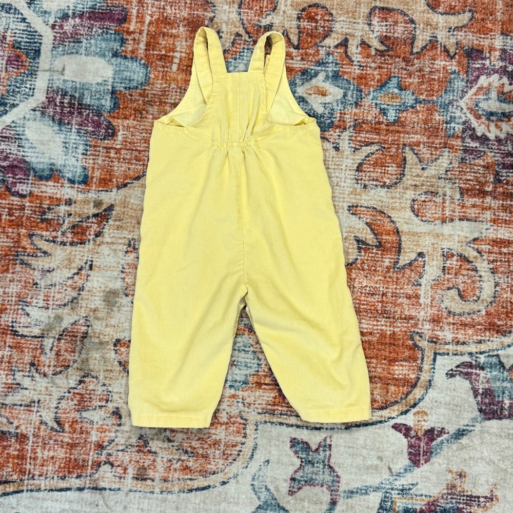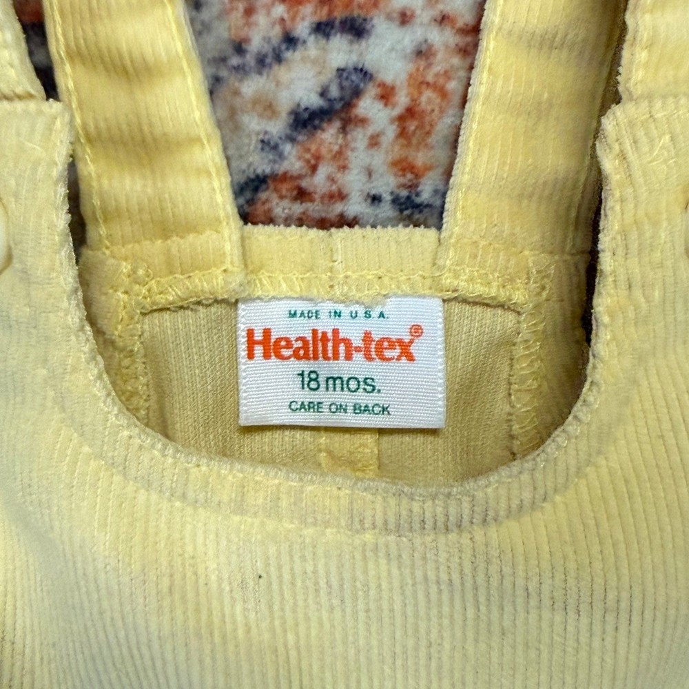 Vintage Health-tex corduroy overalls in a bright sunny yellow. These adorable 18-month overalls feature a classic bib front with button closures at the shoulders and a pleated waist for a comfortable, roomy fit. Designed with convenience in mind, they include a snap-button crotch for easy changes and an elasticized back waist. Crafted from durable permanent press corduroy, these overalls offer a timeless retro aesthetic perfect for everyday wear or special photos. Brand: Health-tex Material: Corduroy Color: Yellow Pattern: Solid Style: Overalls Closure: Button / Snap Sleeve Length: Sleeveless Leg Style: Straight Features: Snap Crotch, Elastic Back Era: Vintage Country of Manufacture: USA Keywords: Vintage Baby, Retro Kids, Corduroy Overalls, 80s Baby, 90s Baby, Unisex Baby, Sunny Yellow, Classic Toddler, Made in USA, Health-tex Vintage, Heirloom Baby, Playwear, Gender Neutral Item is preowned, effort has been made to ensure all flaws are displayed photos serve as additional description Sizing varies by manufacturer and time period, please see measurements.
