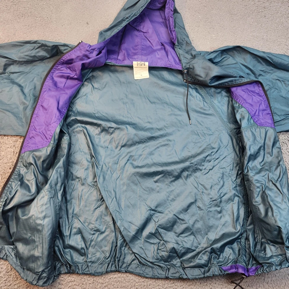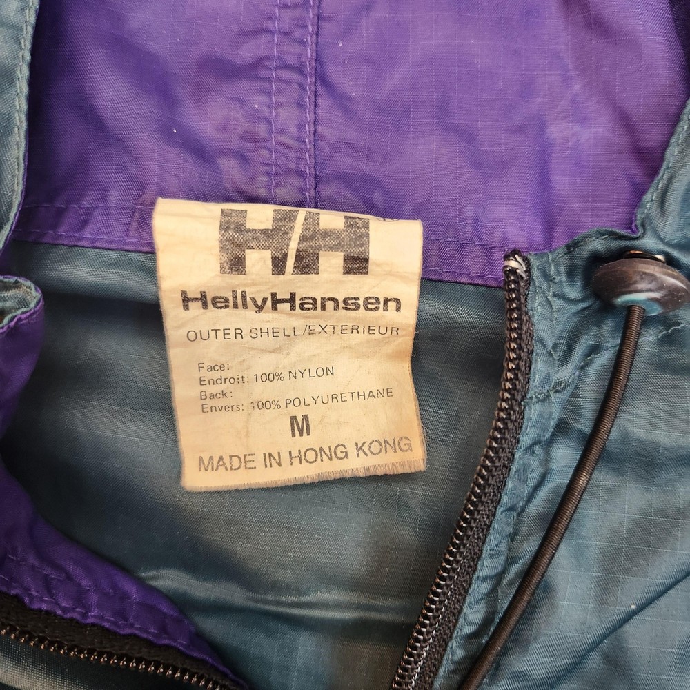 Brand: Helly Hansen (tag reads "HellyHansen" with HH logo) Item: Hooded windbreaker jacket with full zip front Gender/Size: Mens Medium (M) Color: Teal/green exterior with purple lining Materials (from tag): Outer shell: 100% Nylon; Back: 100% Polyurethane Country of origin: Made in Hong Kong Features: Attached hood with drawcord; two front zip hand pockets; ripstop nylon shell; elasticized hem; lightweight packable-style design Branding/Logos: Helly Hansen chest patch logo; HH brand tag at neck Era: 1990s vintage styling and tag details Notes: Vintage items can vary from modern sizing; please review photos for fit and details.