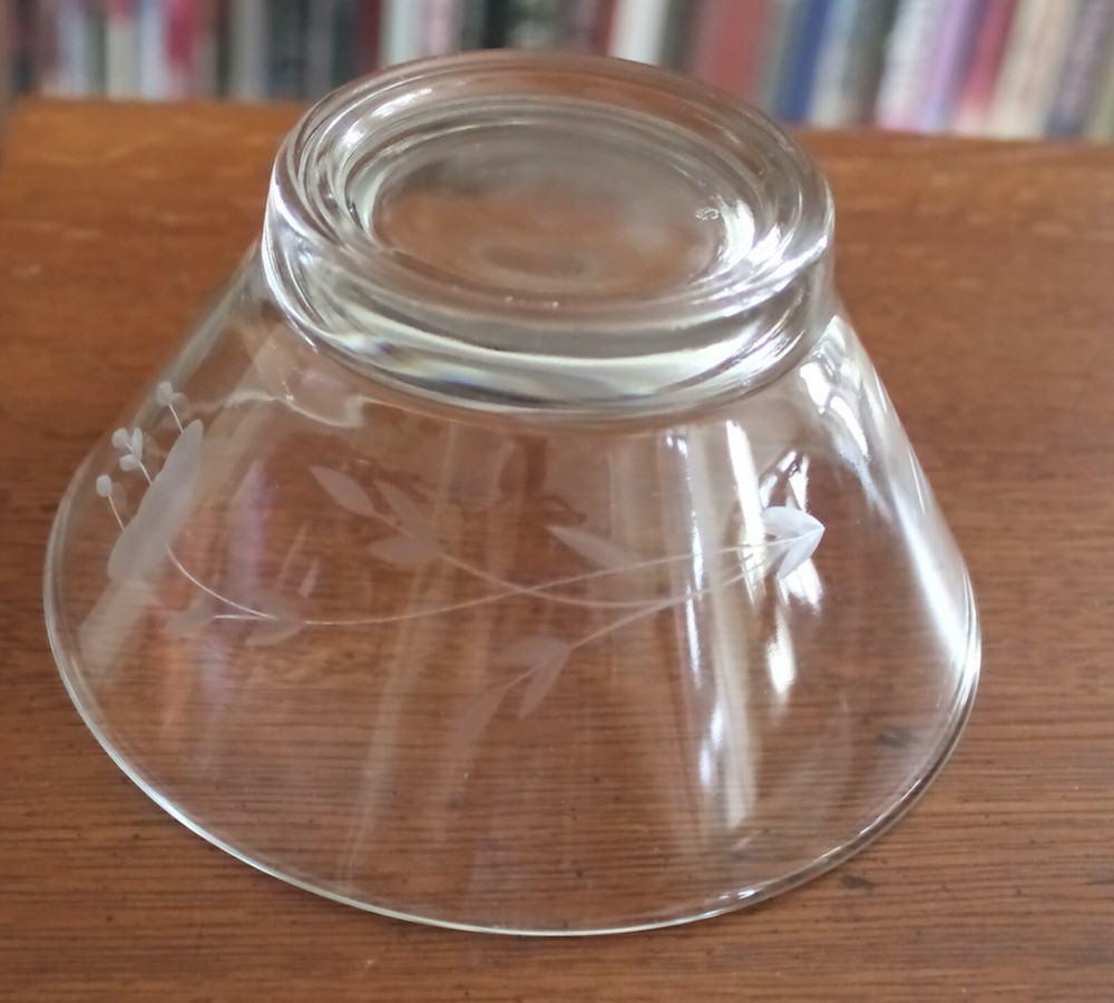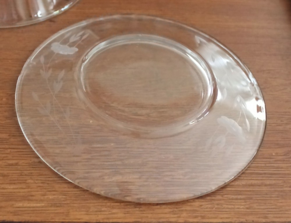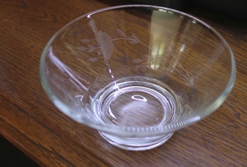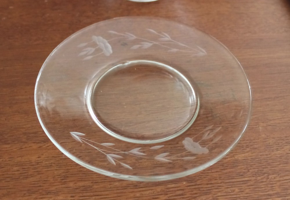 This is my Aunt's lovely clear floral etched bowl with matching saucer This was a Heritage Glass Mayonnaise Set The etching appears to be hand done as I can see minor variations. Measurements: Saucers is 6-1/8" in diameter Bowl has an opening of 5-1/4" and tapers down to 2 3/4" Check out her other items that I'm selling for my cousin. I will combine shipping.