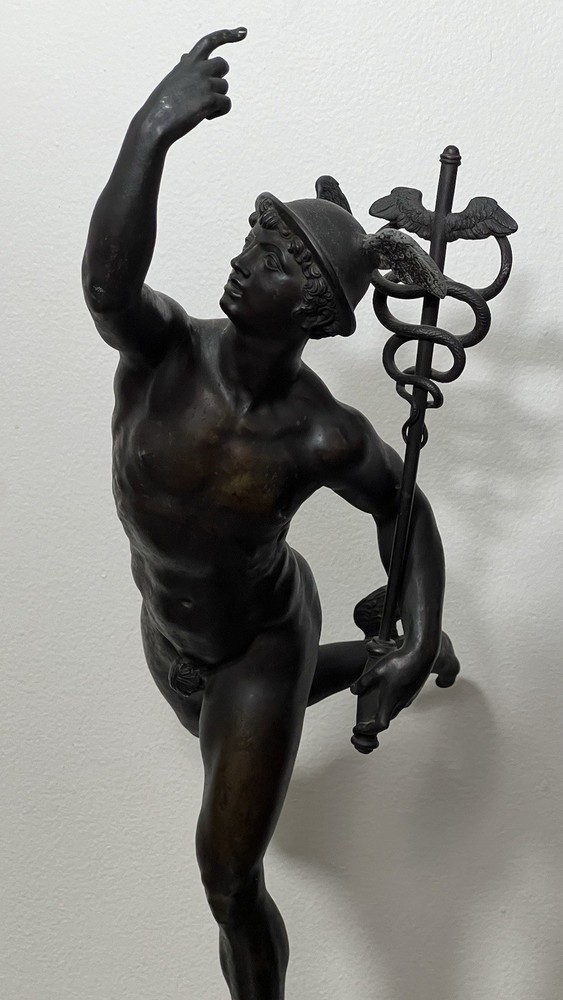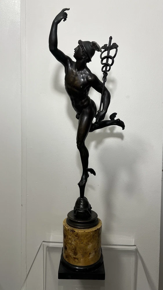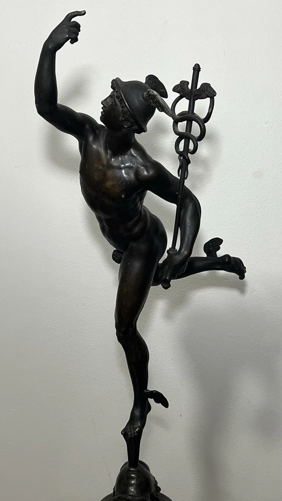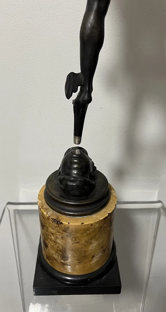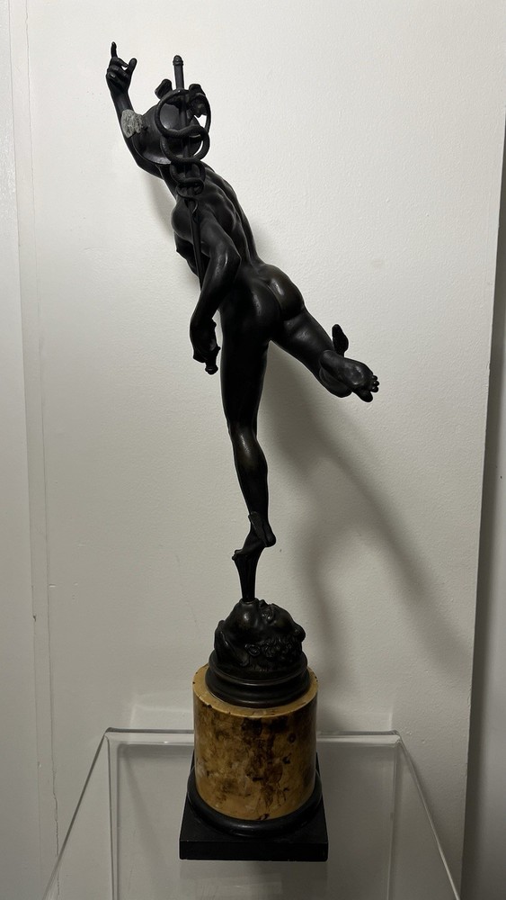 Beautiful statue of Hermes (Mercury) with a marble base. Very heavy and large (28.5 inches tall). The figure attaches to the base with a screw-in mechanism (see photo). Excellent condition. Great for decor or collecting.