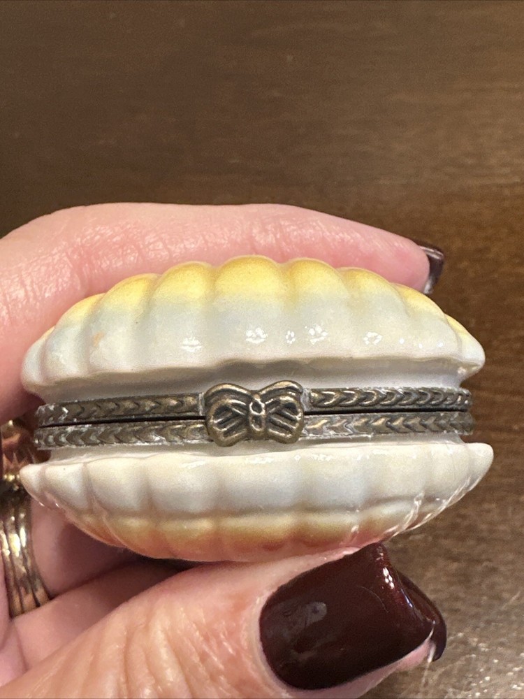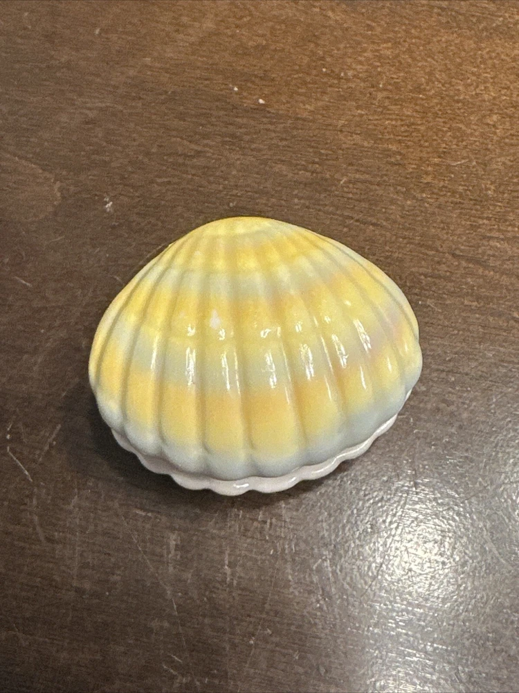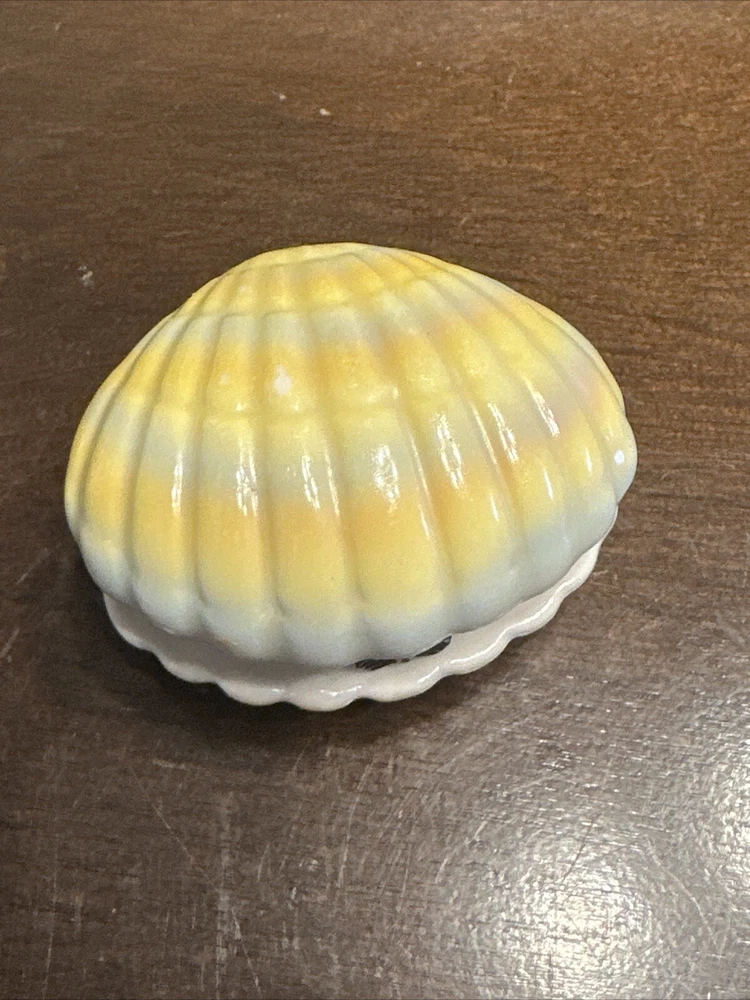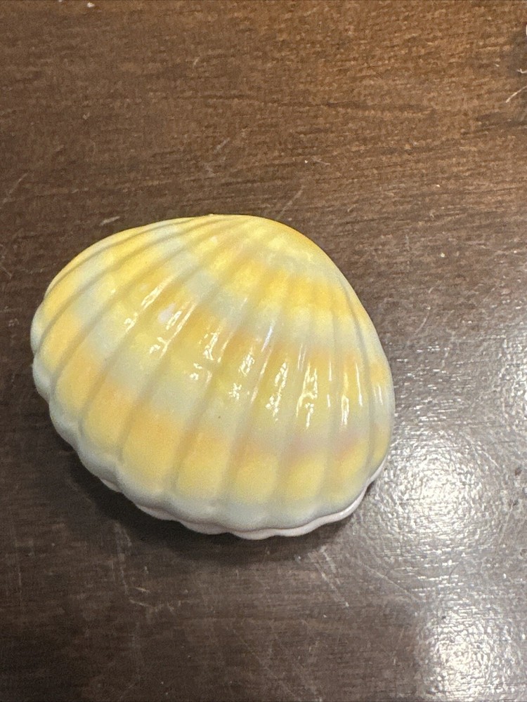 Collection: Keepsake Boxes Country/Region of Manufacture: Unknown Closure Type: Press Fastening Size: 2.10” Finish: Glossy Color: Yellow Occasion: All Occasions Brand: Unbranded Material: Porcelain Style: Nautical Time Period Manufactured: unknown Subject: box Features: Boxed Theme: Nautical Pattern: Shells Shape: clam shell Type: Trinket Box Year Manufactured: 1980