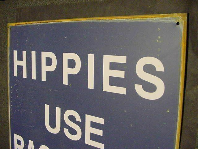VINTAGE HIPPIES USE BACK DOOR METAL TIN SIGN hippie art Reproduction antiqued with rust and miner dings and scratches vintage style tin metal sign. Measures 15" by 12" and states. "HIPPIES USE BACKDOOR with an arrow and underneath says "No Exceptions". . inkfrog terapeak Listing and template services provided by inkFrog