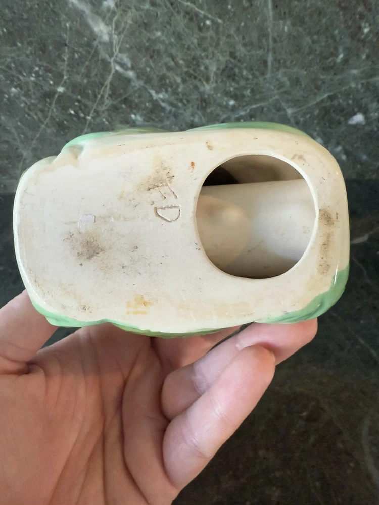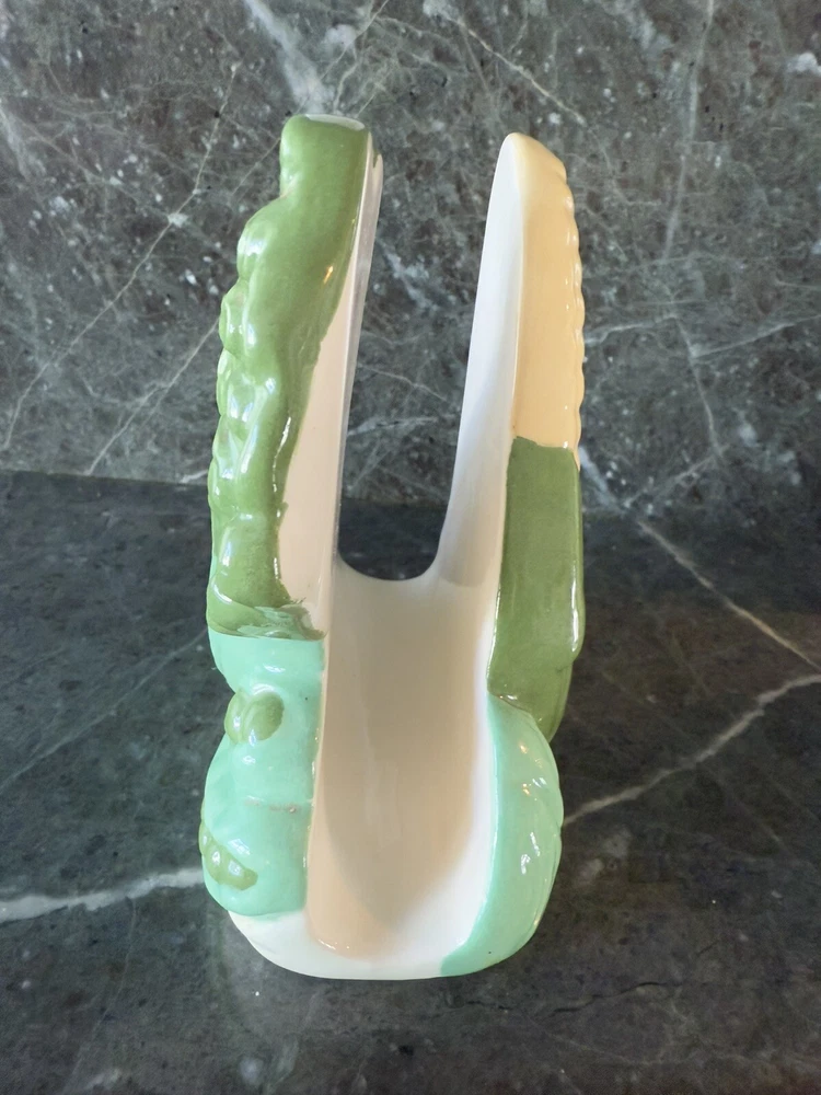 This vintage napkin holder is a charming addition to any kitchen or dining room decor. Handmade in a Toleware style, the holder features a design of corn on the cob and celery, adding a touch of whimsy to the table setting. In excellent used condition, this ceramic piece is perfect for holding napkins in place while adding a nostalgic and unique flair to the serving area.