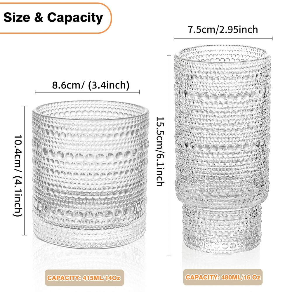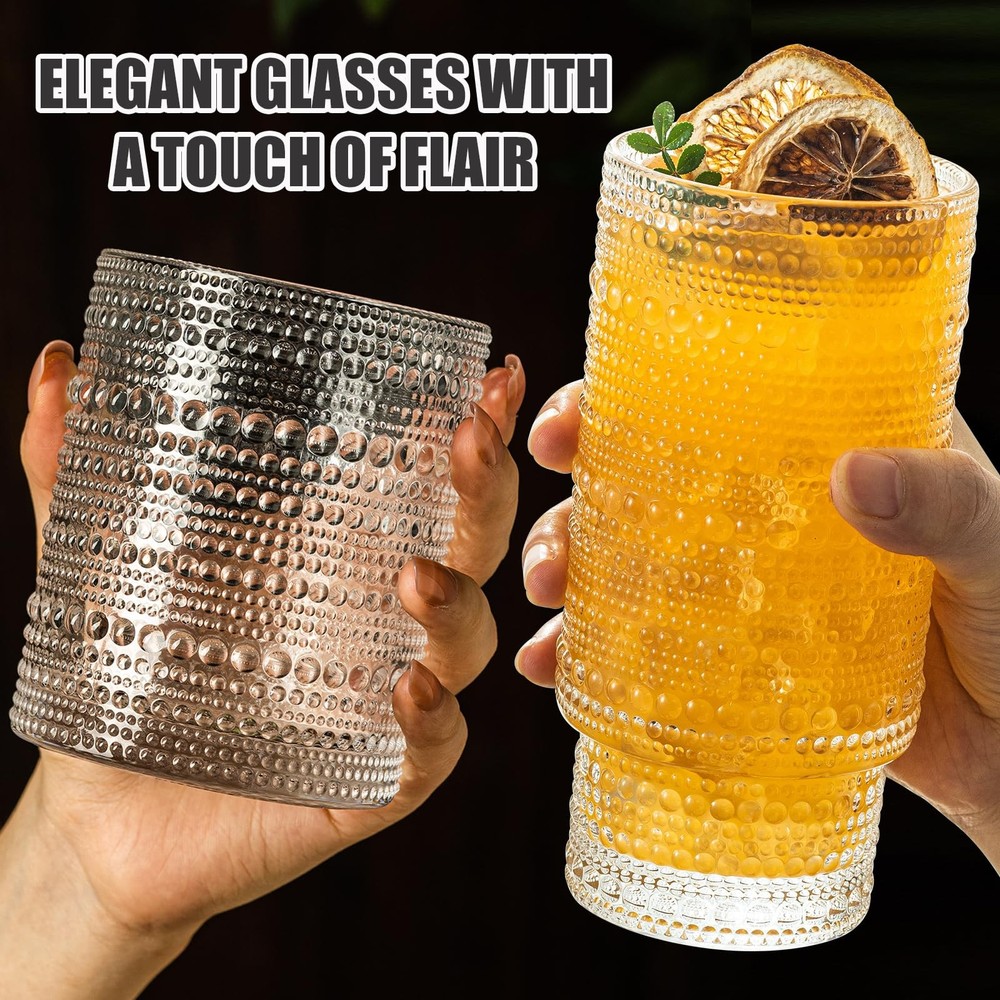 Our Vintage Hobnail Drinking Glasses Set of 4, a perfect addition to your glassware collection. These clear glass cups feature a stunning hobnail beaded textured design, reminiscent of vintage glassware. Crafted with elegance and style, these drinking glasses are not only visually appealing but also practical for everyday use. The 16 oz capacity makes them ideal for serving your favorite beverages such as water, juice, margaritas, or wine. Designed with your safety in mind. The durable construction guarantees long-lasting performance, making these glasses a great investment for any occasion. Whether you're hosting a party, enjoying a quiet evening at home, our Vintage Hobnail Drinking Glasses Set of 4 is the perfect choice. Embrace the vintage boho-inspired design and elevate your drinking experience. Enhance your kitchen with this beautiful glassware set and add a touch of elegance to your everyday moments. 【FLEXIBLE DUAL-SIZE COLLECTION】Embrace 4 vintage drinking glasses, cleverly split into two sizes: 2 highball glasses (2.95" diameter, 6.1" height) and 2 rocks glasses (3.4" diameter, 4.1" height). Add a touch of vintage elegance to your drinkware collection with these hobnail drinking glasses. Perfect for serving cocktails, wine, or water. 【UNIQUE EMBOSSED DESIGN】Featuring a beautiful hobnail beaded textured design, these glass cups exude a charming and unique aesthetic that will impress your guests.This nostalgic touch adds a hint of vintage flair while also providing a secure and comfortable grip, making these glasses ideal for relaxed gatherings or elegant affairs. 【PERFECT COFFEE BAR ACCESSORIES】Hobnail drinking glasses are great for any occasion, any hot and cold drinks. These drinking glasses are widely used in families, kitchens, cafes, bars, and restaurants. You can use them as the iced coffee cup, smoothie cup, beer glasses, whiskey glasses, cocktail glasses, water glasses, or any other interesting holiday party drinkware. 【DURABLE & DISHWASHER SAFE】: The glass coffee cups reusable are made of high-quality durable clear glass. Structured with a sturdy flat bottom. These thick iced coffee glasses are Dishwasher safe, and easy to handwash.Durable drinking glasses, made with high-quality glass material, these cups are sturdy and durable. they can withstand daily use and are easy to clean, making them a great addition to any household. 【MULTIPURPOSE】These drinking glasses look beautiful in a cabinet or displayed out on a bar cart for all to see! Coordinate your color choice with your cocktails this holiday for a real crowd pleaser! Elevate your cocktail experience with these margarita glasses. The boho-inspired design adds a trendy and stylish touch to any gathering. 【PREMIUM QUALITY, YOU WON’T BE DISPOINTED】This glasses set is packaged in a bubble holder and thick carton box to prevent damage during transportation. If the glass cup with straw set you received was damaged or imperfect or you are not 100% satisfied, please contact us. We will offer a satisfactory solution for you.