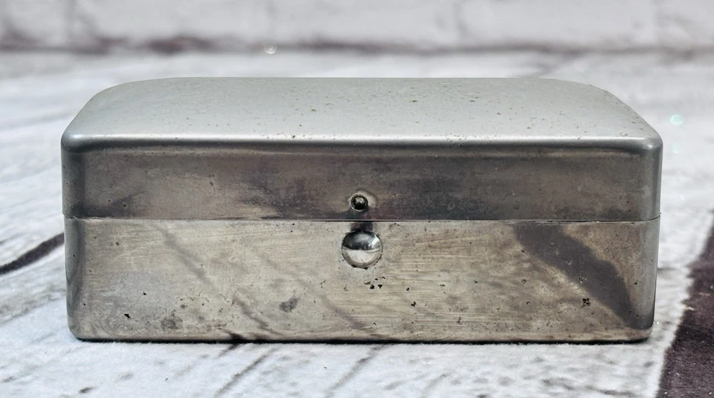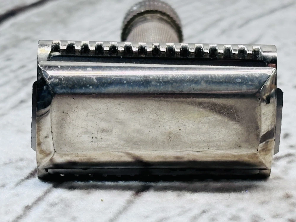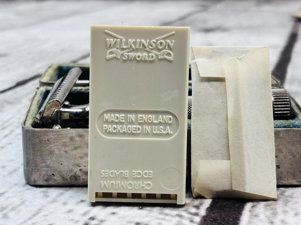 Vintage Hoffritz Germany Slant Bar Safety Razor w/ Metal Case & Blades Classic vintage Hoffritz slant bar double-edge safety razor made in Germany, housed in its original monogrammed metal travel case. Includes one installed Wilkinson Sword blade plus an additional Wilkinson Sword Chromium Edge blade pack. The razor disassembles easily and functions properly—threads turn smoothly, and the mechanism operates as intended. •Brand: Hoffritz Germany •Type: Slant Bar Double-Edge Safety Razor •Material: Chrome-plated metal •Included: Original metal case (engraved “Tom Molinare”), Wilkinson Sword blades •Condition: Razor shows normal surface wear and light tarnish consistent with age but remains in good overall condition. The case has visible exterior wear and oxidation; interior velvet lining shows fading. With some gentle polishing, both the razor and case could present beautifully. •Ships securely Please zoom in on all photos to review condition and details before purchasing. The razor is fully functional and displays well as both a collectible and usable piece of classic shaving history.
