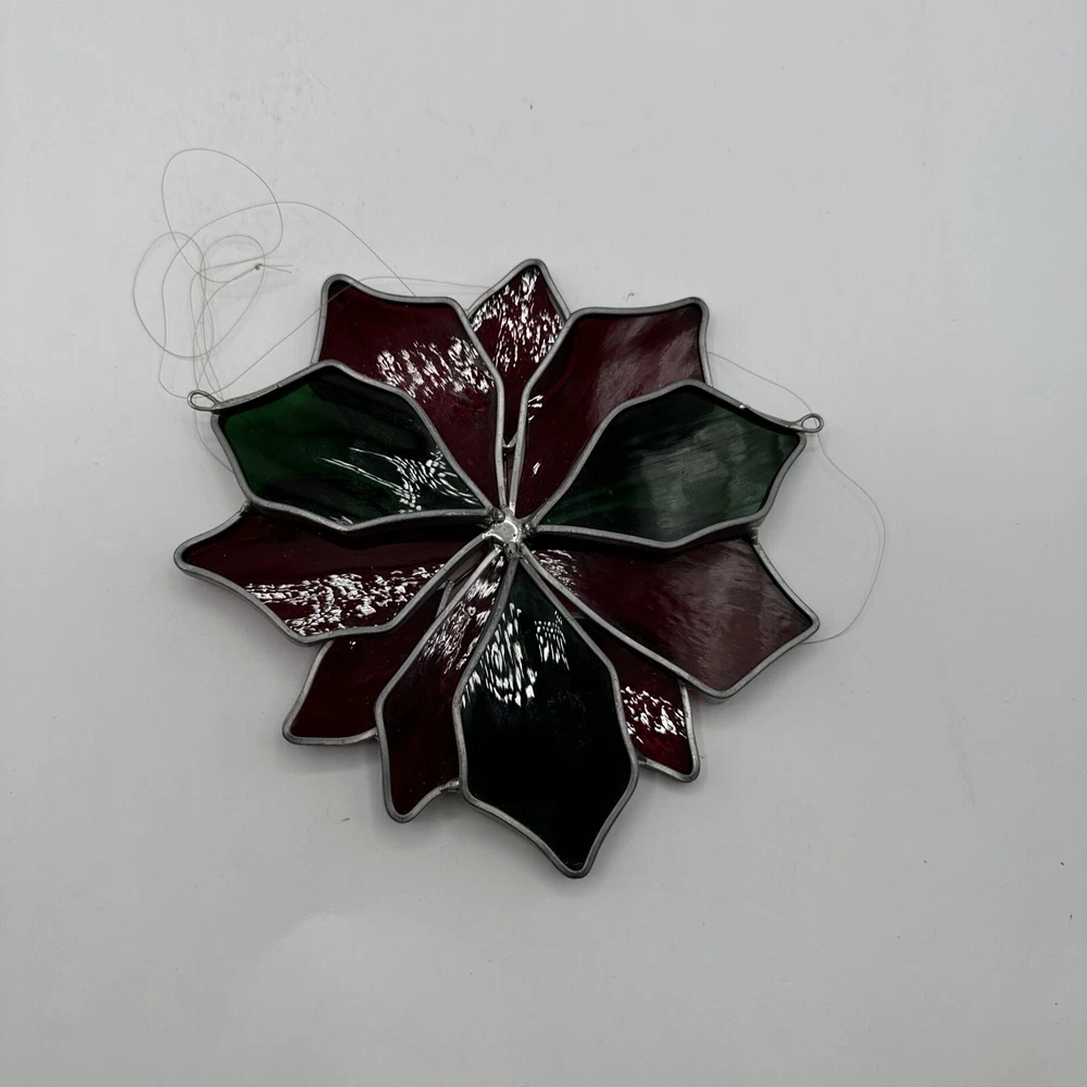 Vintage Holiday Christmas Stained Glass Poinsettia 3D Hanging Panel Pre-owned. Minimal wear. Some glass "loose" but not at risk of falling out. See measurements and pictures.