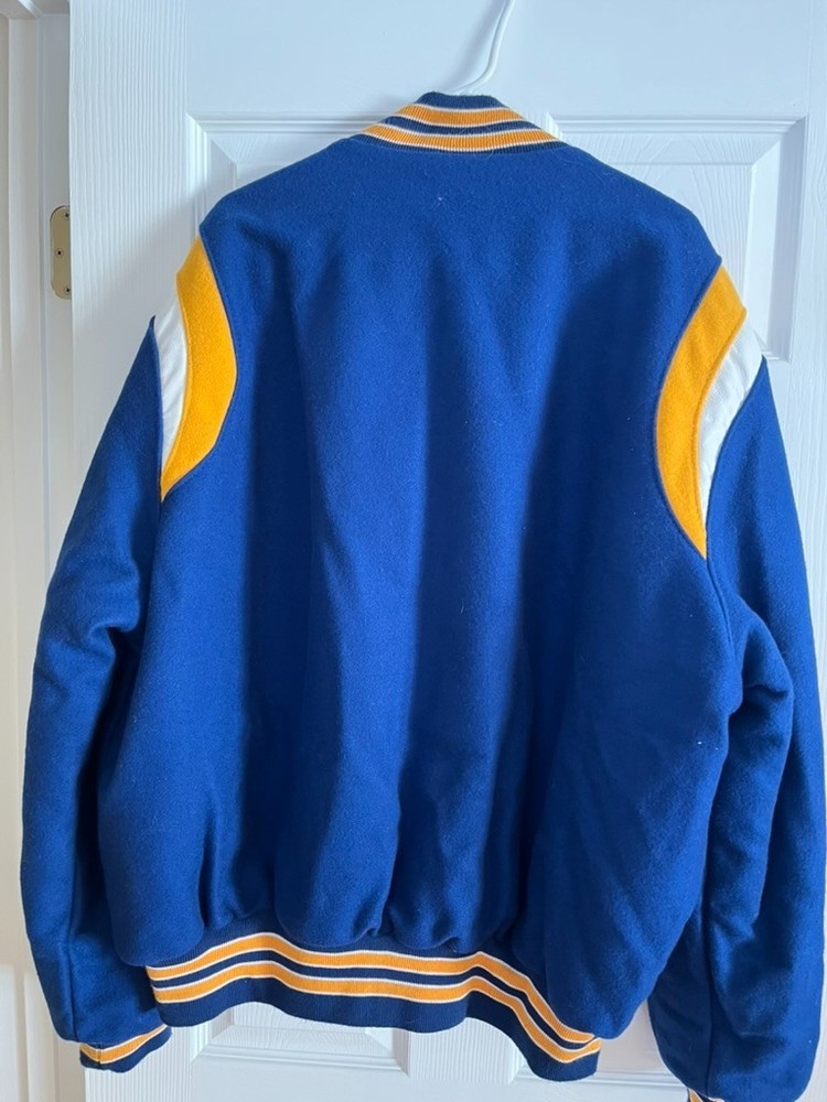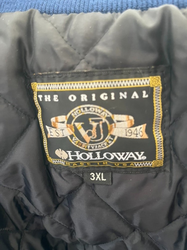 This VTG Holloway Men's Large Blue/Gold Varsity Jacket is a retro vintage piece perfect for those who love the 90s and Y2K style. Made from wool with a nylon lining, this jacket features a stand-up collar, snap closure, and is ideal for winter, fall, and spring seasons. It is designed for casual occasions and includes pockets for added convenience. The jacket's solid blue color and USA theme make it a great choice for those who appreciate a touch of nostalgia in their outerwear. Made in the United States by Holloway.