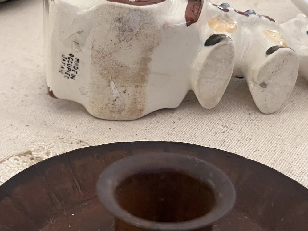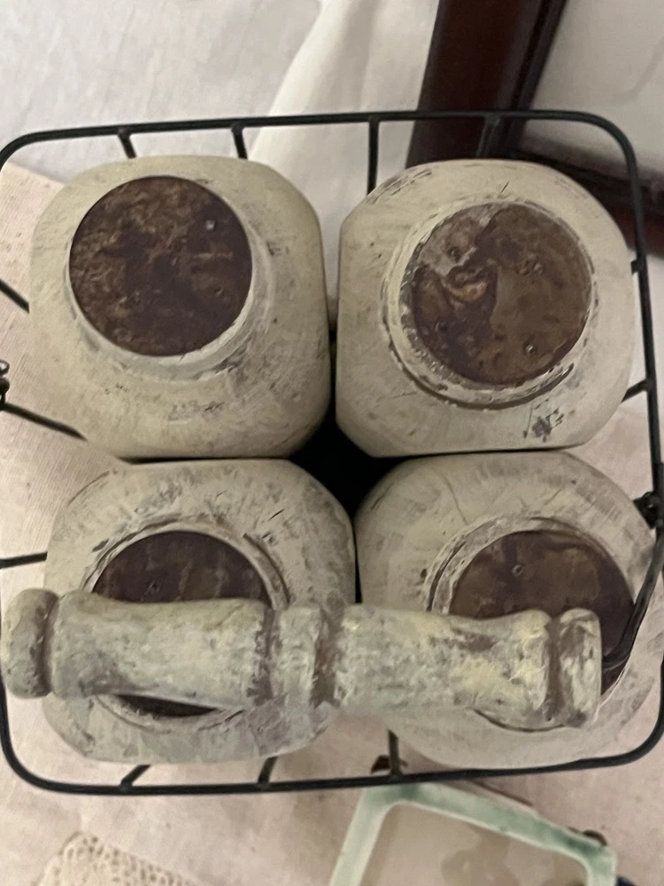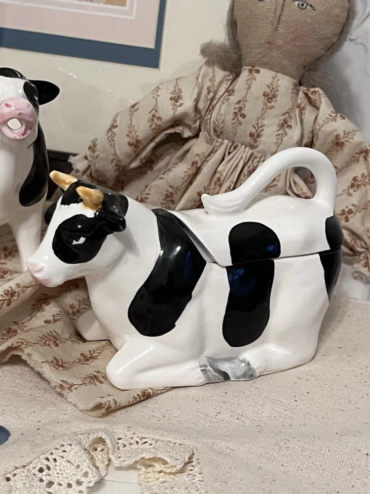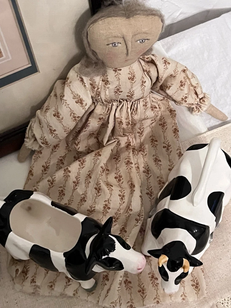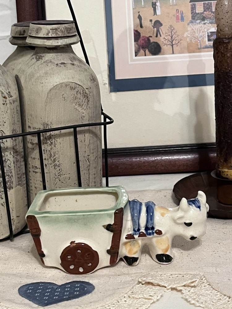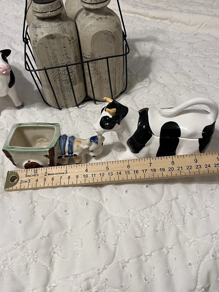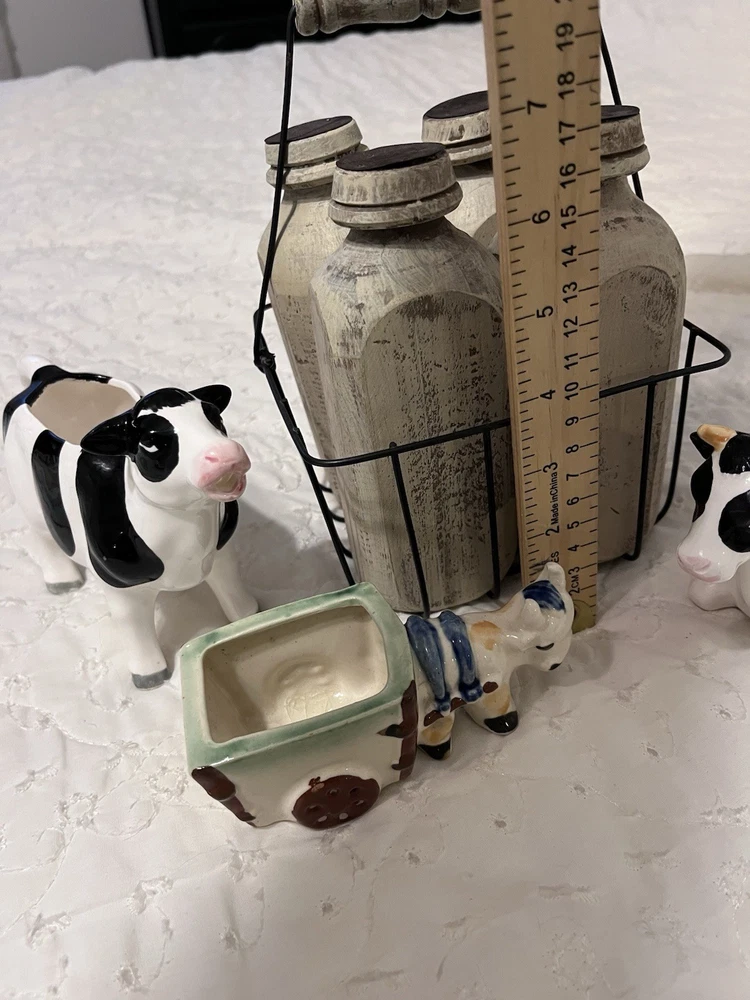 Beautiful lot! All has been well cherished changing out decor. There is the adorable creamer and sugar Japan cows, the little occupied Japan planter, the signed number art framed print with little cows also in there, the candle takes two double A batteries didn’t have any or would have had lit with the little rustic holder also, the primitive doll handmade she has a soft body and sits however was made without legs, and the basket with four wooden milk bottles. The one has a small chip but cannot see as you can tell in photos. Handmade hearts runner.All has belonged to me like most items I sell I change out seasonal most of my home decor. Drives the hubby nuts but what’s a gal to do lol. Please note that this lot has collectable items such as the cows, art print, and handmade the doll. Blow up all photos please part of the description as well. No chips cracks on the cows and the little planter has a little crackle due to his age. I have a gorgeous large framed primitive picture listed also that went perfect and that is how I had my dining room:) I don’t sell items that I would not want that are all damaged. Hoping to end selling soon so get while ya can. Please ask any questions happy to reply. All sales are finale. All will be packed by professional’s as well. Have a blessed day thanks.