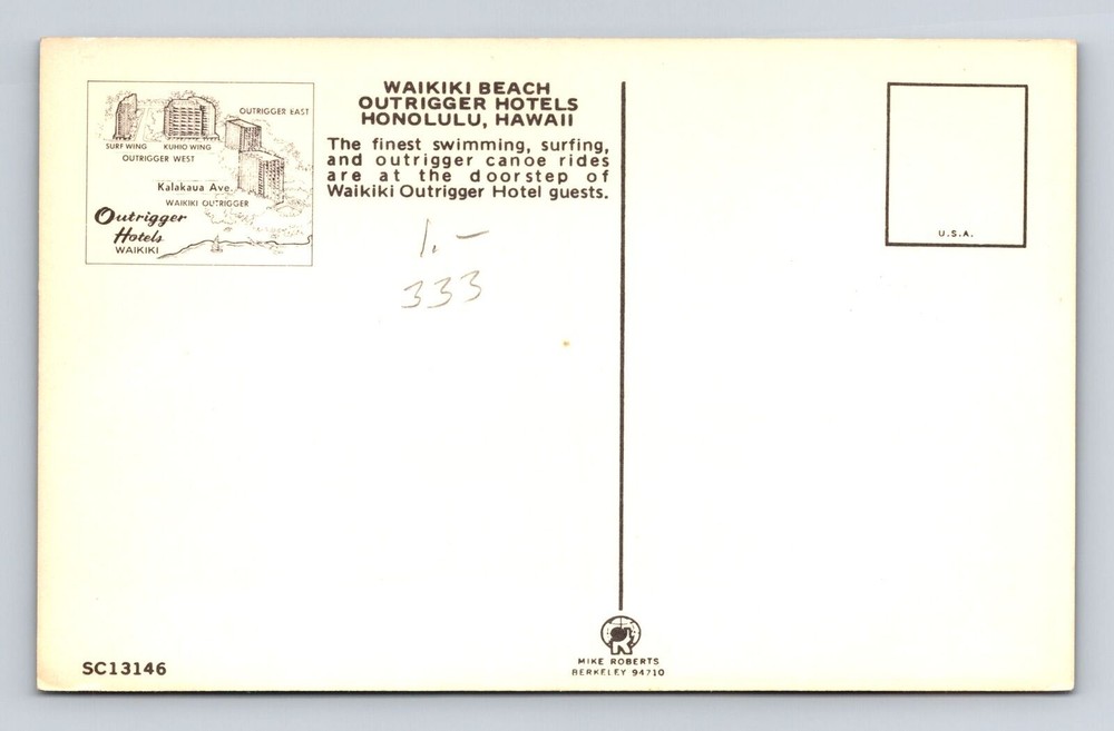 Vintage Honolulu Waikiki Beach Outrigger Hotels Advertising Postcard Hawaii