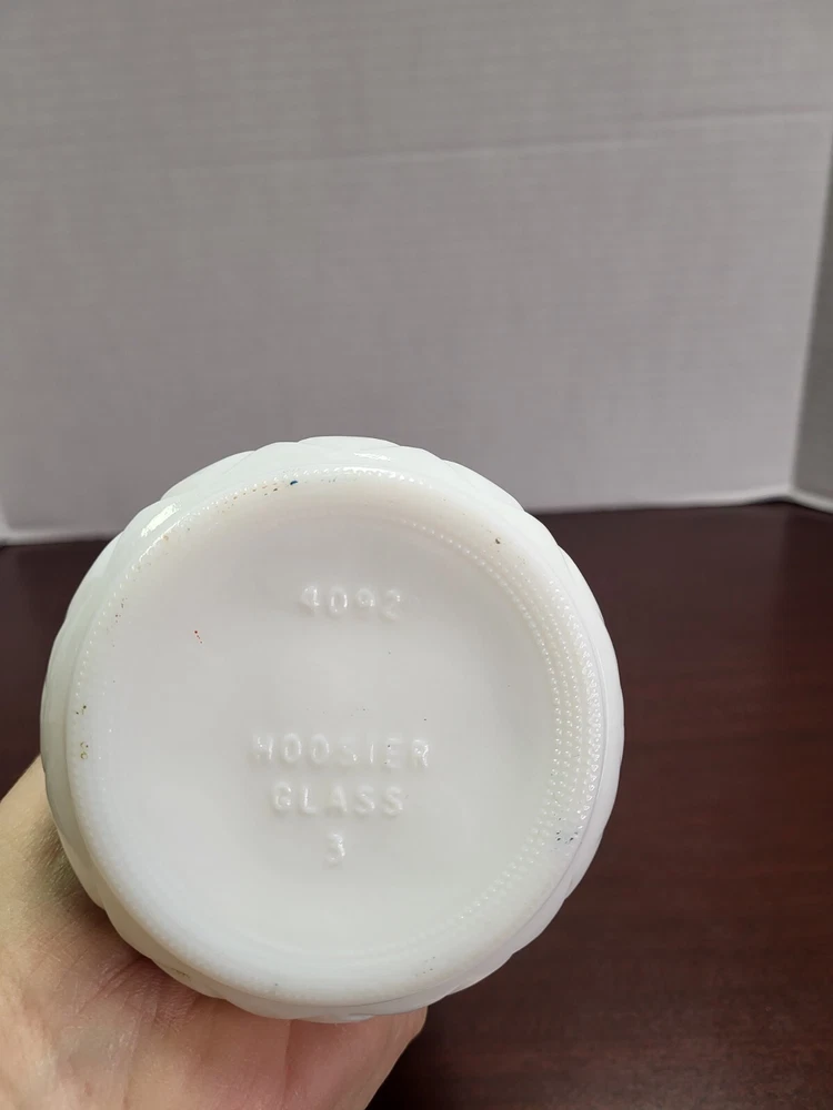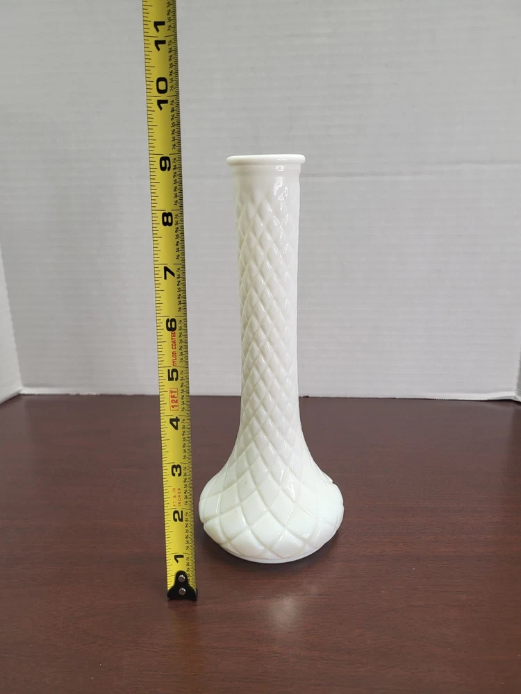 Add a touch of vintage charm to your home decor with this Hoosier Glass 9" milk glass bud vase. The elegant swirl pattern and white color make it a perfect addition to any room. Made of high-quality glass, this vase is durable and sturdy. Measuring 9inches in length, this original and vintage vase is perfect for displaying your favorite flowers or as a standalone piece. With its unique model number 4092 and brand name Hoosier, this piece is a collector's item. Don't miss the chance to own a piece of history and add this vintage vase to your collection today.