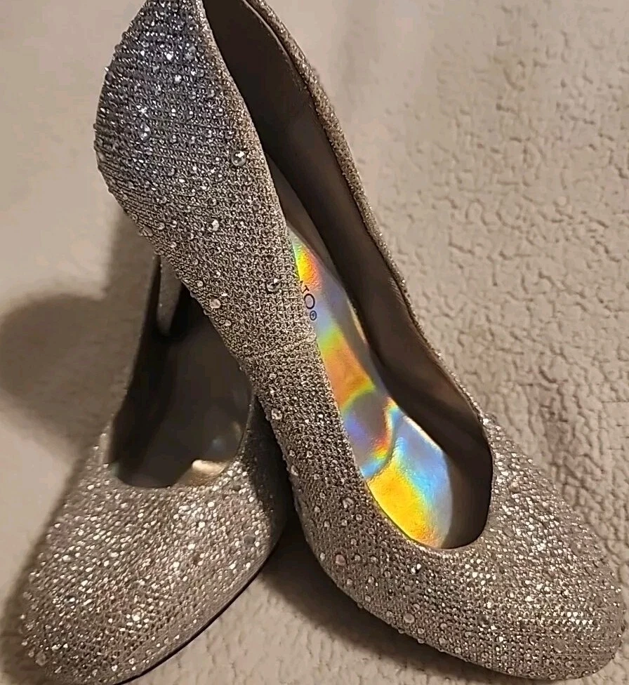Excellent shape with only minimal signs of wear. Add some sparkle to your step with these stunning gold pumps from Hot Tomato. The jeweled pattern and sequins will catch the light and turn heads at any occasion. Slip them on with ease thanks to the slip-on closure, and enjoy the comfort of the synthetic upper and insole material. These heels are perfect for adding some glamour to your travel, wedding, party, cocktail, formal, or business outfit. The 3.5-inch stiletto heel adds height and elongates your legs, while the reflective features make sure you shine wherever you go. These pumps are suitable for fall and winter seasons, and their metal theme will add some edge to your wardrobe.